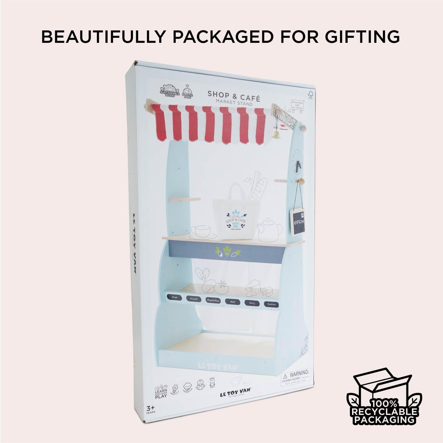Negozio e bar reversibili Opportunità infinite per il gioco di ruolo divertente Con lavagne, campanelli per i clienti, tende in tessuto e ruote Aiuta a sviluppare abilità di gioco di ruolo fantasiose: apri un negozio e un bar. Parte della collezione Honeybake di Le Toy Van