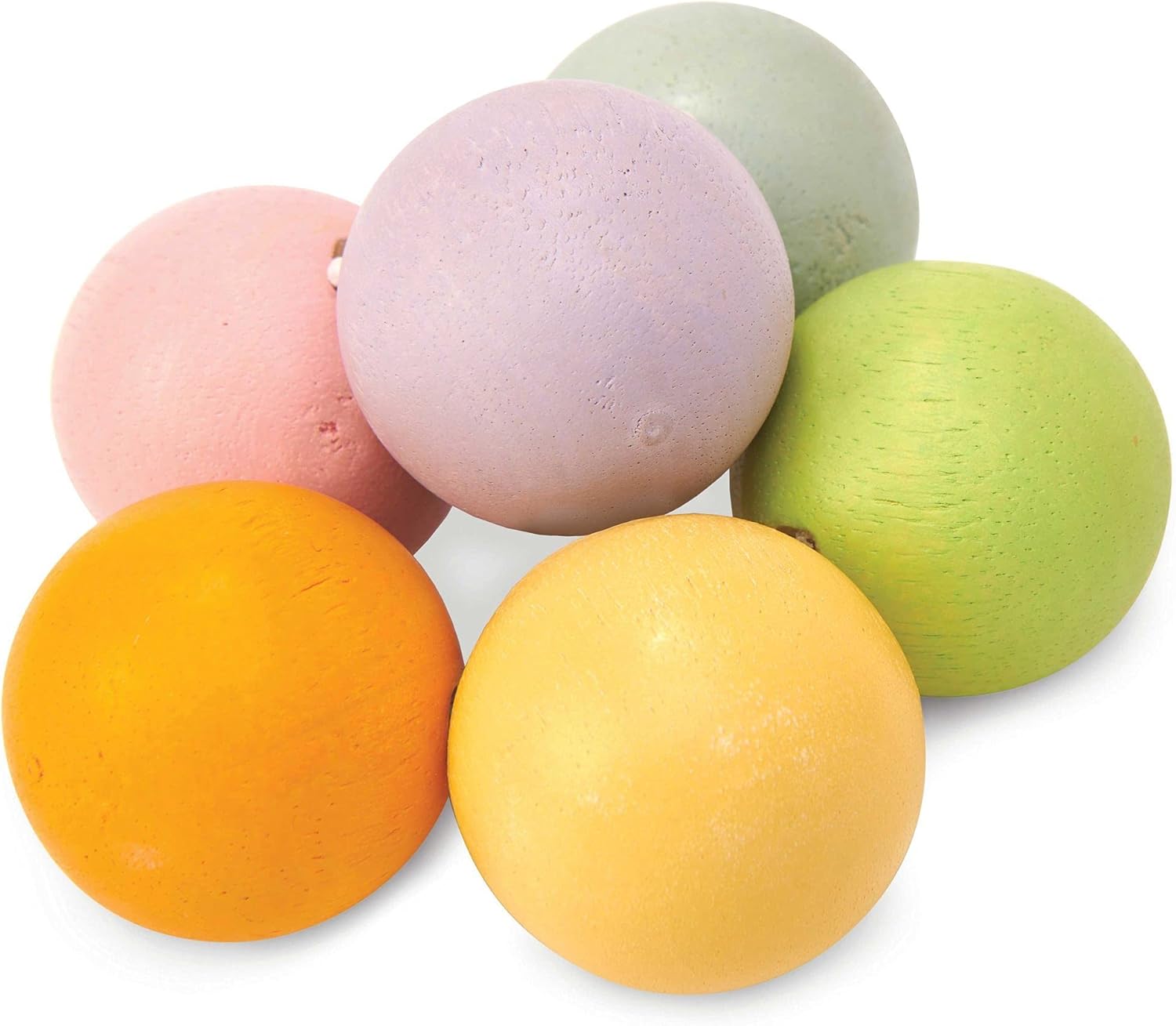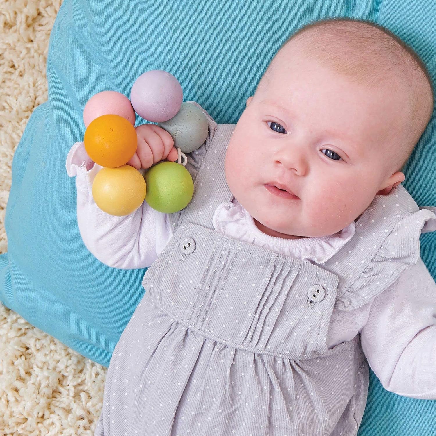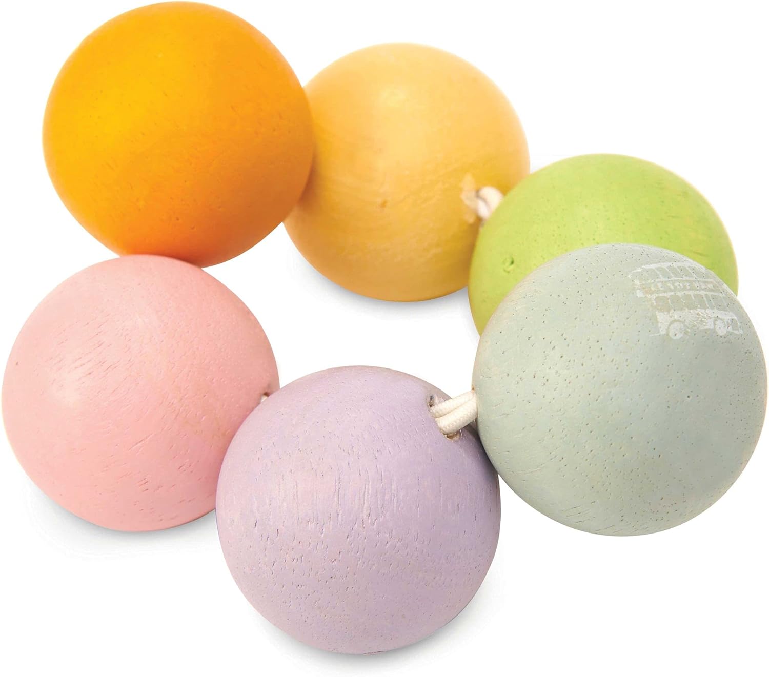 Sei perline di legno in delicati colori pastello, infilate insieme su una corda elastica resistente.