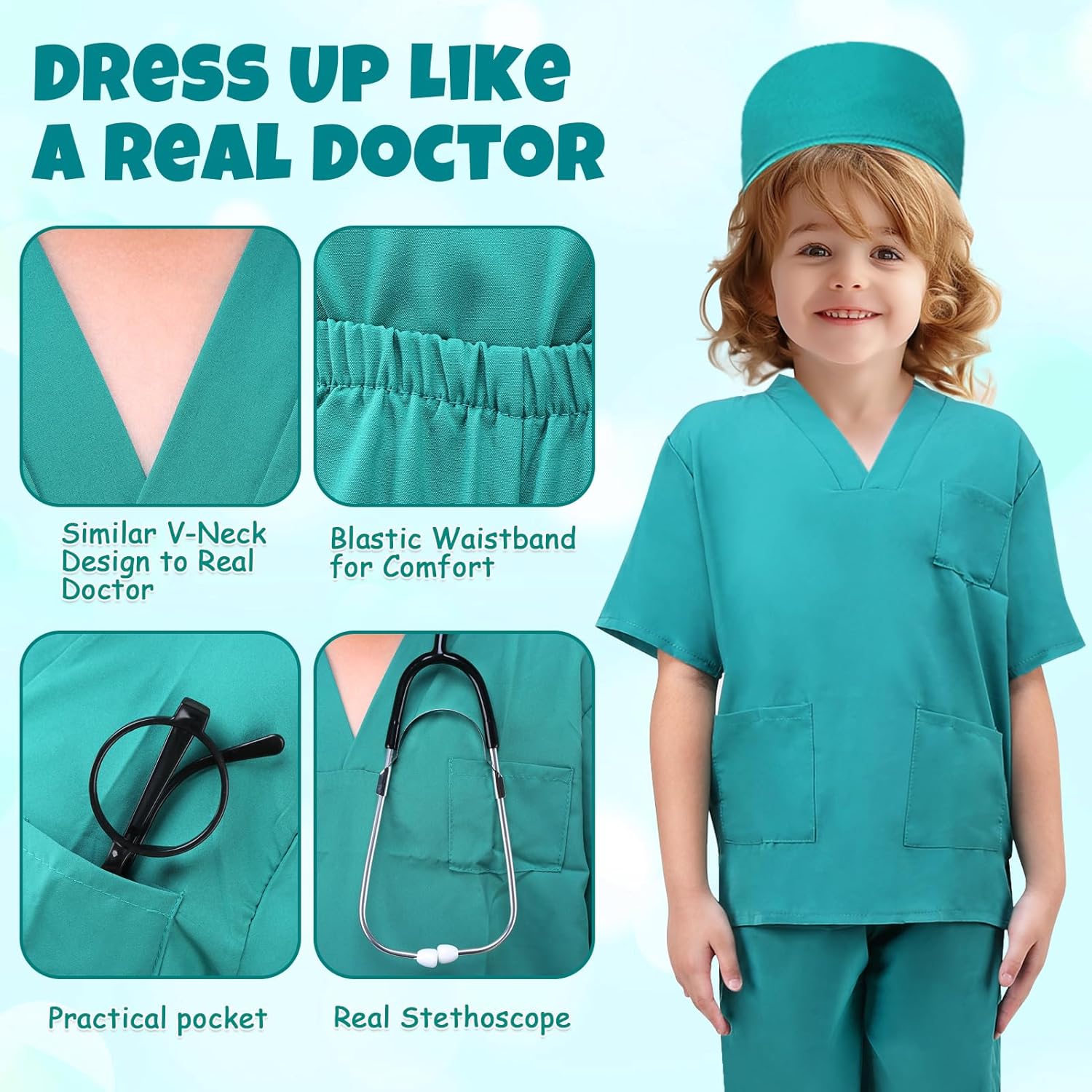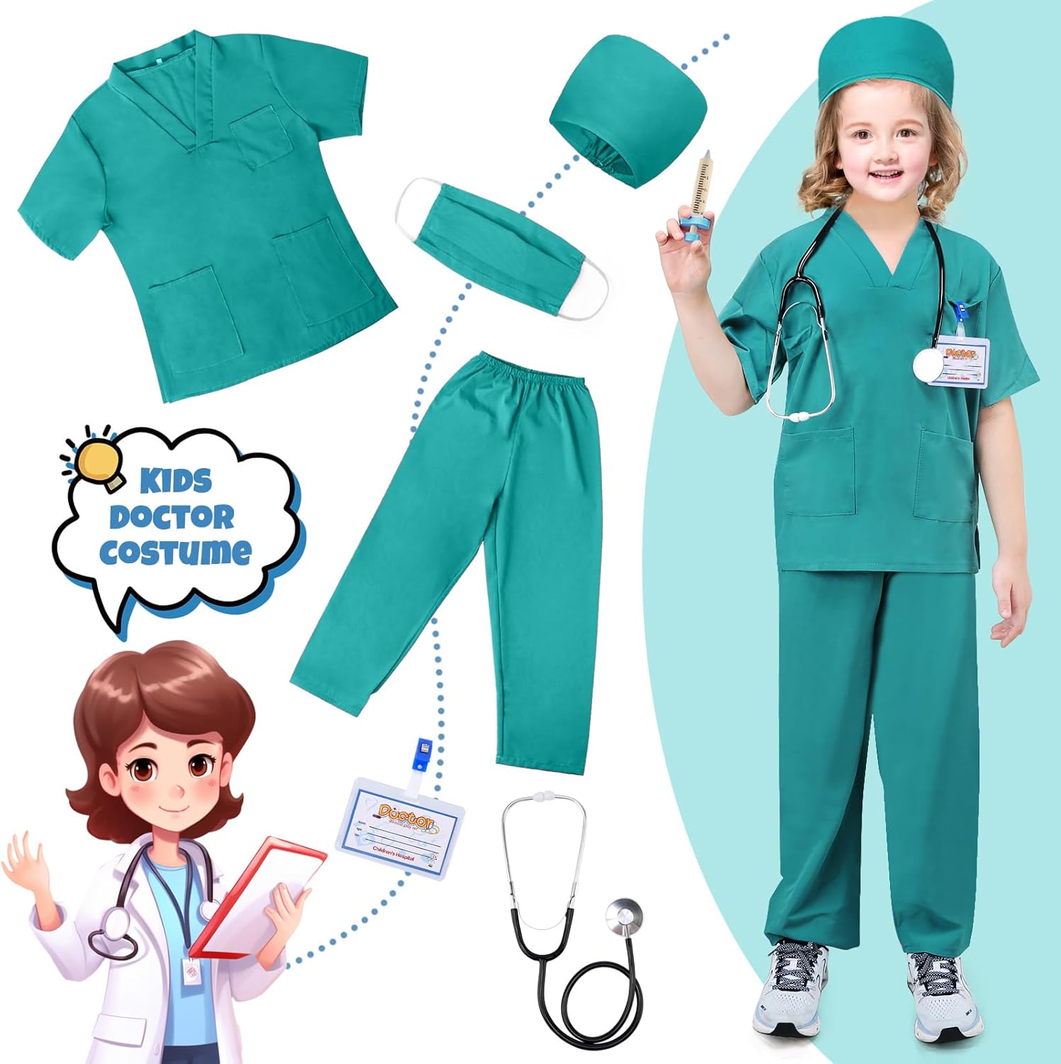 Regalo per kit medico: ideale per qualsiasi tema o festa. Realizzato in tessuto twill di alta qualità, con una tasca sul petto. Semplice ma gioioso. Costume da medico: se i bambini stanno andando a una festa di compleanno o hanno un appuntamento con gli amici, questo costume da medico per bambini fornirà ore di divertimento. Dimensioni disponibili: ci sono 3 gamme di taglie per bambini 3-5 anni, 5-7 anni, 7-9 anni. Sono fedeli alle dimensioni, vestibilità comoda e non rimarrete delusi dal nostro abbigliamento medico. Ottimo regalo: il regalo perfetto per ragazzi e ragazze che si vestono giocando, un costume di Halloween, un regalo di compleanno, un regalo di Natale o un costume di carnevale. Sono autentici e sembrano proprio come un vero medico. Stimolazione dell'immaginazione: questo costume da medico è autentico per i tuoi bambini per sperimentare il lavoro quotidiano del medico, stimola notevolmente la loro immaginazione su come prendersi cura di un paziente o dei loro adorabili animali domestici. Multiuso: lavabile e riutilizzabile per molte occasioni, travestimento per feste, carnevale, feste estive o invernali, feste in costume di Halloween o come cappotto da laboratorio scolastico per bambini. Contenuto del costume: 1 cuffia chirurgica. 1 camicia chirurgica. 1 paio di pantaloni chirurgici. 1 berretto medico. 1 maschera rosa. 1 stetoscopio giocattolo. 1 paio di occhiali giocattolo. Questo set da gioco medico per bambini viene fornito con set medico, scrub costume e accessori giocattolo. Quando il bambino indossa la maschera del cappotto e gli occhiali, ascolta il battito cardiaco proveniente dallo stetoscopio e si immerge in un gioco realistico, tutto sembra un vero medico! Non solo stimola l'immaginazione, la creatività e la capacità di apprendimento dei bambini, ma realizza anche i loro sogni di diventare medici durante il gioco di ruolo. Il giovane piccolo medico sarà deliziato da questo set di travestimenti.