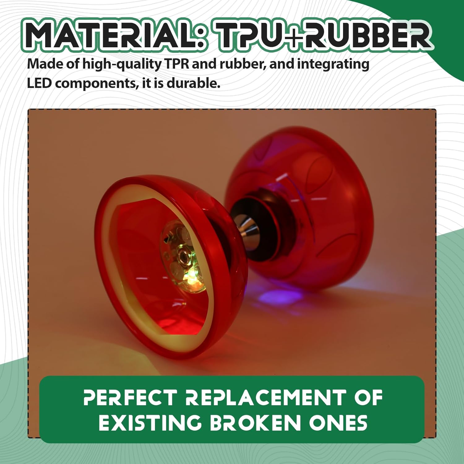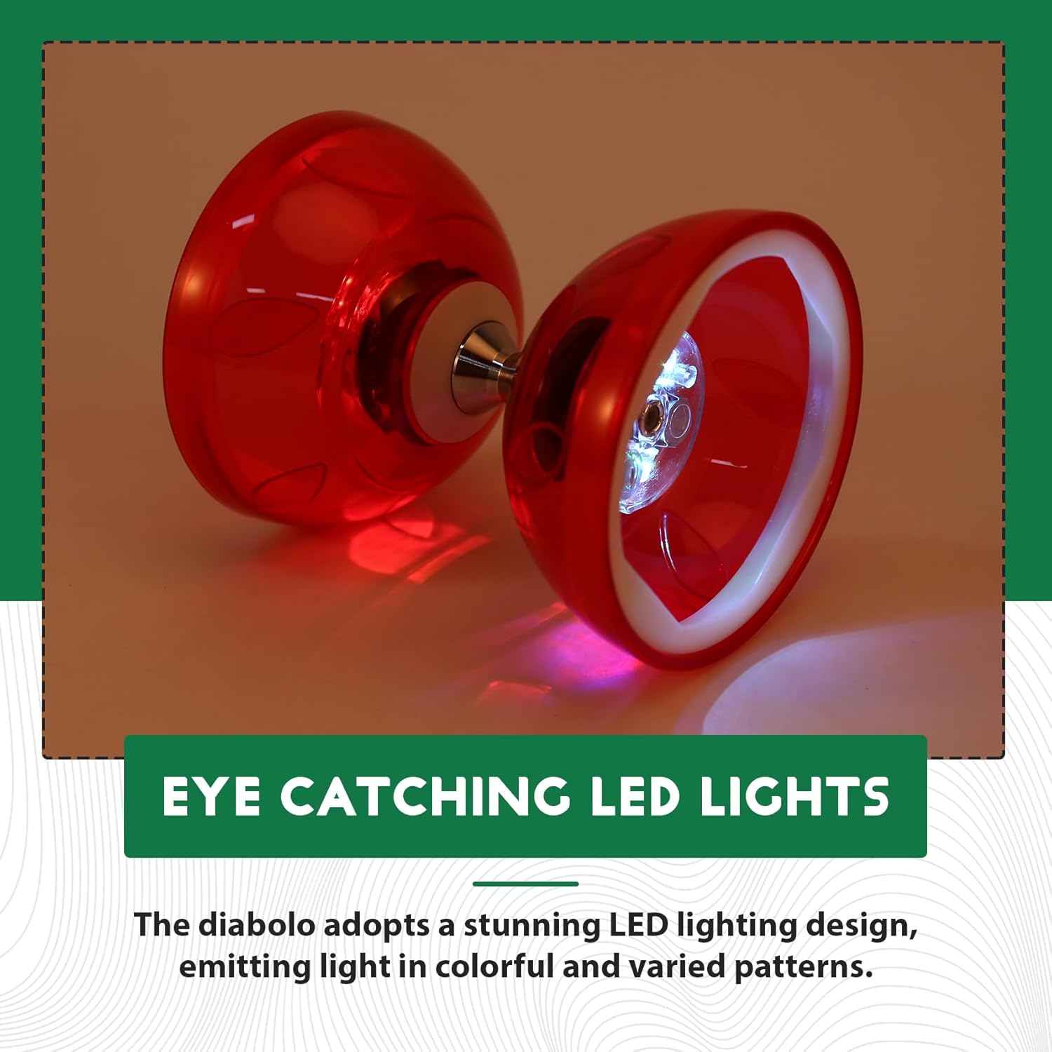 Stecche ergonomiche per diabolo: Dotate di impugnature in schiuma per una presa comoda e di aste lucidate che si adattano perfettamente al diabolo, queste stecche presentano estremità in rame affidabili per saldamente la corda, garantendo un utilizzo fluido e flessibile rotture o deformazioni. Set completo di diabolo LED: questo set include un diabolo LED rosso brillante, due bastoncini con impugnatura in schiuma per un controllo superiore, una corda resistente da 10 metri per vari trucchi e una comoda borsa a rete Luci LED accattivanti: il diabolo è dotato di straordinario design luminoso a LED che si illumina con motivi colorati e cangianti Design resistente e facile da usare: realizzato in e gomma di alta qualità con componenti LED integrati, questo diabolo è costruito per durare. Misura 10,5 cm di diametro. Versatile e divertente per tutte le occasioni: ideale per l'uso in una varietà di contesti, tra cui circhi, corsi di giocoleria, festival e carnevali, questo set di diabolo a LED è perfetto anche per il gioco quotidiano nei parchi, nelle scuole e sui palchi acrobatici.