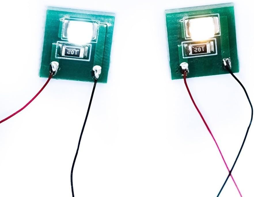 LED precablato per fari locomotiva ferroviaria: questi LED sono precablati e pronti per essere installati nei fari delle locomotive ferroviarie. collegare i fili rosso (+) e nero (-) a un decoder DCC o un pickup di potenza all'interno di una locomotiva DC. Nessun cablaggio o montaggio aggiuntivo richiesto. Facile collegamento al decoder DCC: per collegare questi LED a un decoder DCC, è possibile collegare facilmente il filo rosso al cavo del decodificatore blu, il filo nero al cavo del decodificatore bianco o giallo, ecc. Ciò garantisce una perfetta integrazione con l'impianto elettrico esistente della locomotiva. Dimensioni compatte e prestazioni affidabili: con una dimensione di 10 x 10 mm, questi LED precablati sono compatti e adatti a vari modelli di locomotive. Funzionano a una tensione di lavoro di 12-18V (DC/AC) e hanno una corrente diretta di circa 20mA, prestazioni affidabili ed efficienti. Luce bianca calda: questi LED emettono una luce bianca calda, creando un effetto realistico e visivamente accattivante per i fari della locomotiva ferroviaria. Il colore bianco caldo aggiunge un tocco autentico al layout del tuo modello ferroviario. Adatto per scale HO/OO e più grandi: progettati per essere più adatti per scala HO/OO e modelli più grandi, questi LED precablati sono compatibili con una vasta gamma di locomotive. Sono una scelta ideale per migliorare il realismo e la funzionalità del layout ferroviario.