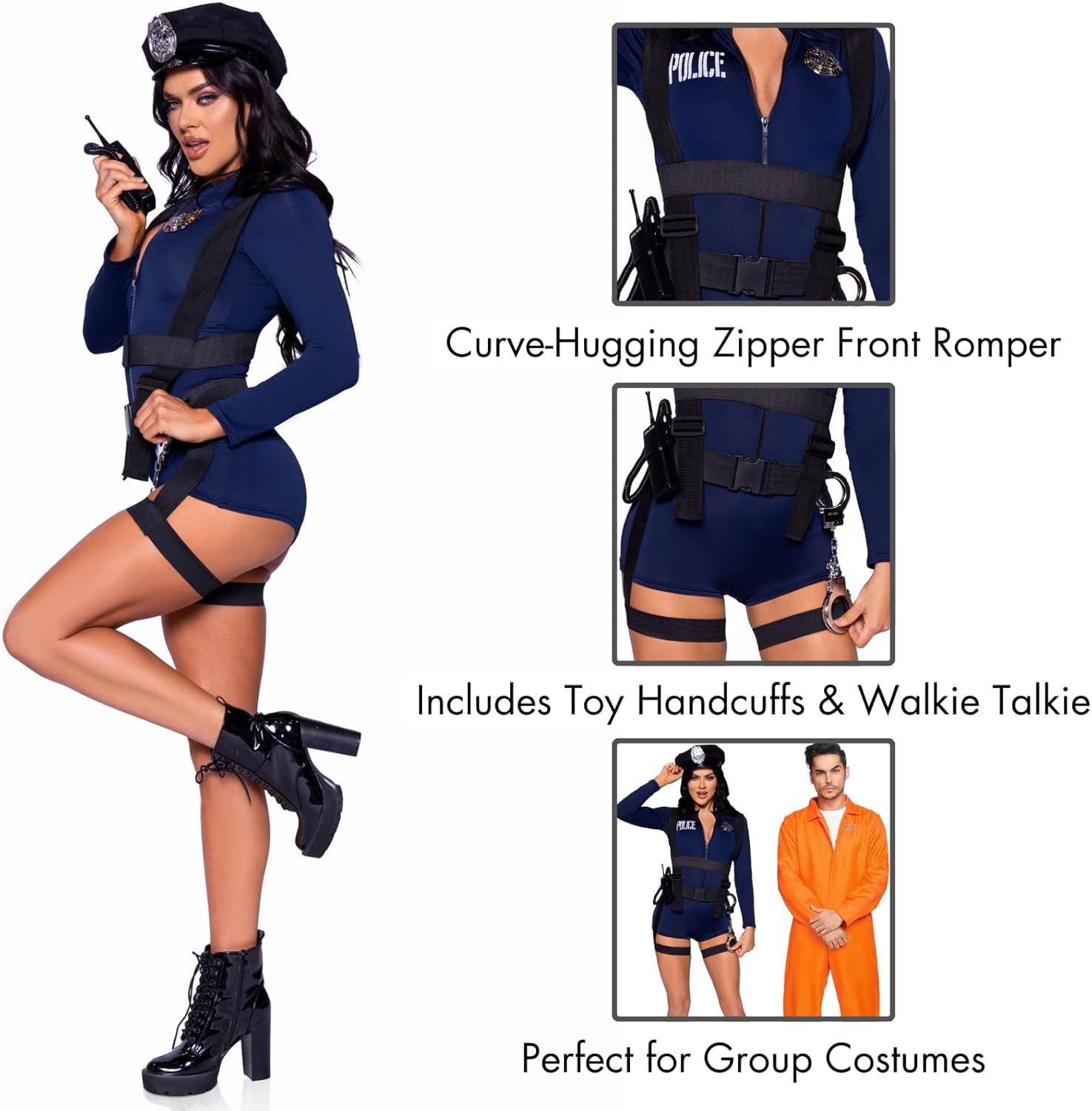Descrizione 6 PC Cop, includes zip up romper, pin-on badge, garter body harness, toy walkie talkie and handcuffs, and police hat. Contenuto della confezione pagliaccetto, distintivo, imbracatura, walkie-talkie, manette, cappello