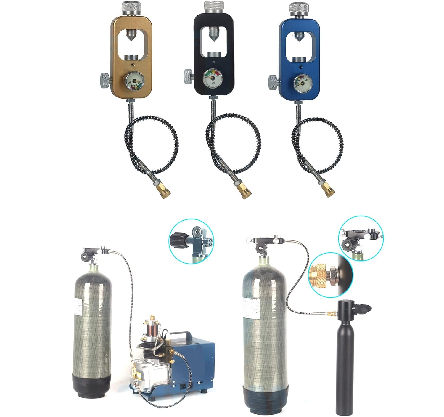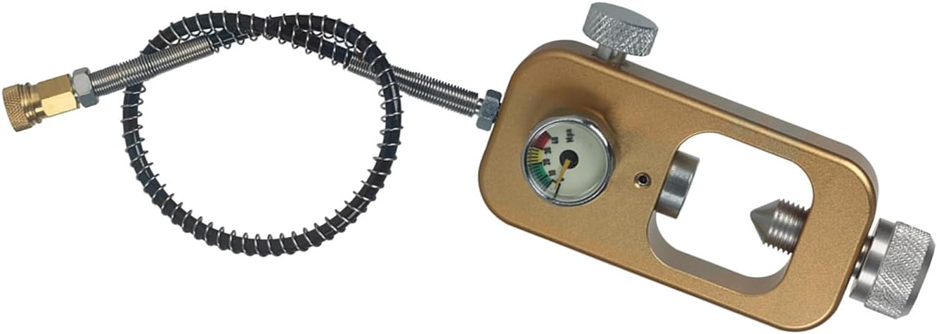 Realizzato in leghe di alluminio ad alta resistenza, offrendo un equilibrio di resistenza e leggerezza. Dispone di un manometro per letture accurate della pressione durante le ricariche. Dotato di nipplo di riempimento da 8 mm/0,31 pollici si scollega rapidamente per rapidi e connessione sicura dei serbatoi. L'adattatore di ricarica subacquea vanta un design portatile, garantendo un facile processo di installazione e rimozione. Il pacchetto include: 1 set ARA Serbas Serbas Refill Adapter