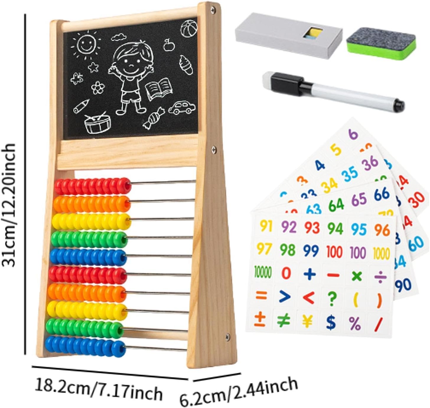 【Educazione iniziale】: conteggio dei giocattoli matematici, riconoscimento del . Può essere utilizzato per contare e contare. 【Materiale didattico】: tavolo da disegno, simpatico aiuto per l'apprendimento della matematica per bambini, addizione matematica, sottrazione, scrittura e aritmetica. 【Tavolo da disegno】: il giocattolo educativo per il conteggio è realizzato in legno con tavolo per formule, carte, penna e cancellino per lavagna, il tavolo è adatto per la pittura con il gesso. 【Ausili per l'apprendimento】: quello per i bambini promuove il pensiero logico. Cambia la perla aritmetica per riconoscere il numero, promuovere la percezione dei colori e aiutare il bambino a distinguere i colori. 【Ottimo regalo】 Quello con cornice in legno è un regalo adorabile ed educativo per ragazzi e ragazze.