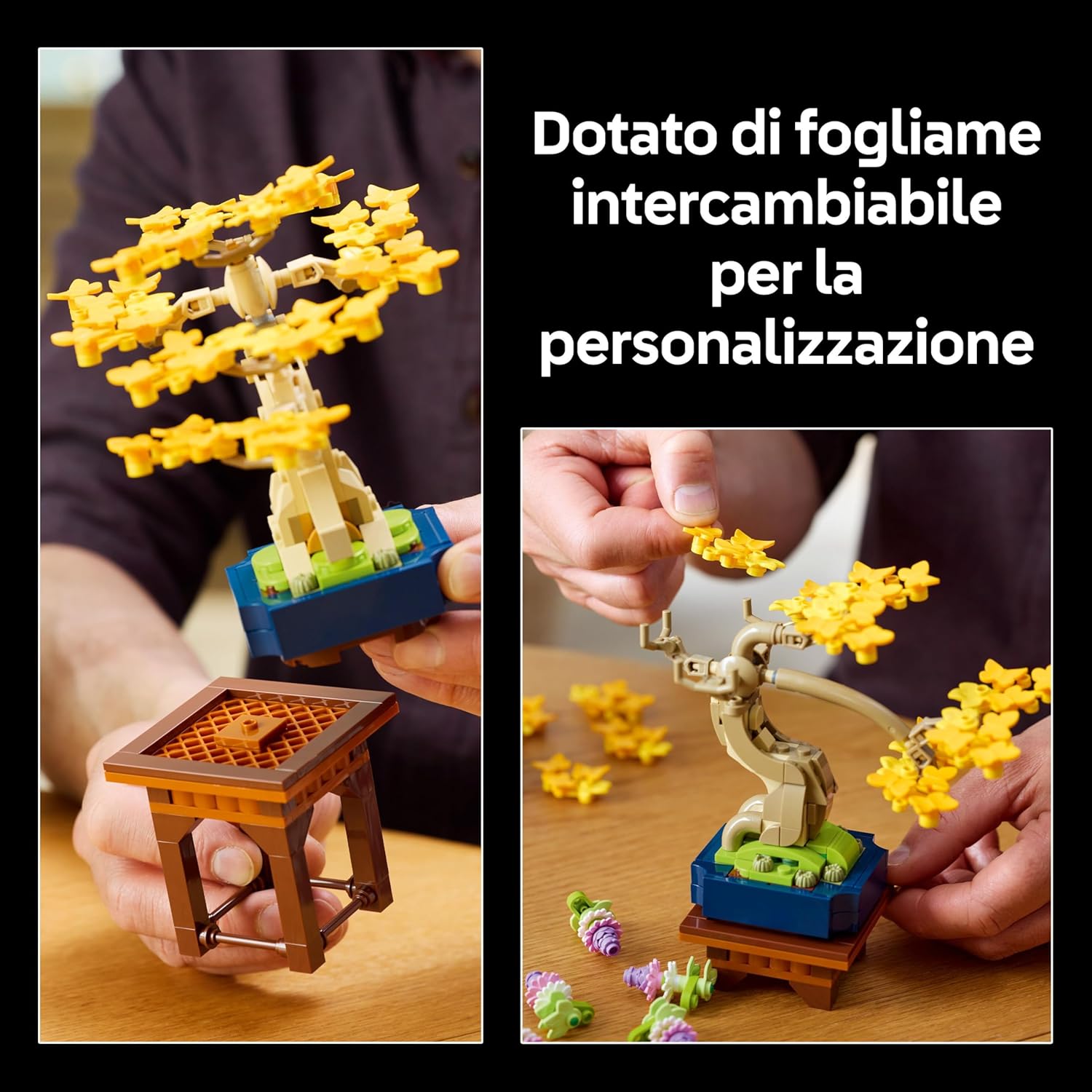 Kit di modellismo LEGO per adulti: realizza 3 alberi bonsai che rappresentano pace ed equilibrio, con il set LEGO Botanicals Collection Mini Bonsai, un progetto coinvolgente per gli amanti di fiori e piante finte LEGO 3 piante LEGO artificiali: include un ginkgo bonsai con foglie gialle, un pino nero bonsai con aghi verdi, e un glicine bonsai con fiori lilla pensili Decorazioni per la casa o per l'ufficio personalizzabili: gli alberi sono dotati di fogliame intercambiabile, che consente di scambiare le foglie per creare bonsai personalizzati; ad esempio, decorando il tronco del glicine con foglie di ginkgo Piante finte da interno: include 2 supporti ornamentali con cui esporre i bonsai a diverse altezze e in diverse combinazioni, per una decorazione personalizzata Regali creativi a tema natura: una costruzione LEGO da collezione, ottima come idea regalo per una donna o per un uomo appassionati di piante e fiori LEGO costruibili, con cui festeggiare un compleanno o un'inaugurazione di casa Costruisci altri fiori: combina questi alberi in mattoncini con altri set della collezione LEGO Botanicals (disponibili separatamente), tra i quali scoprirai bouquet LEGO, bambù e molto altro ancora