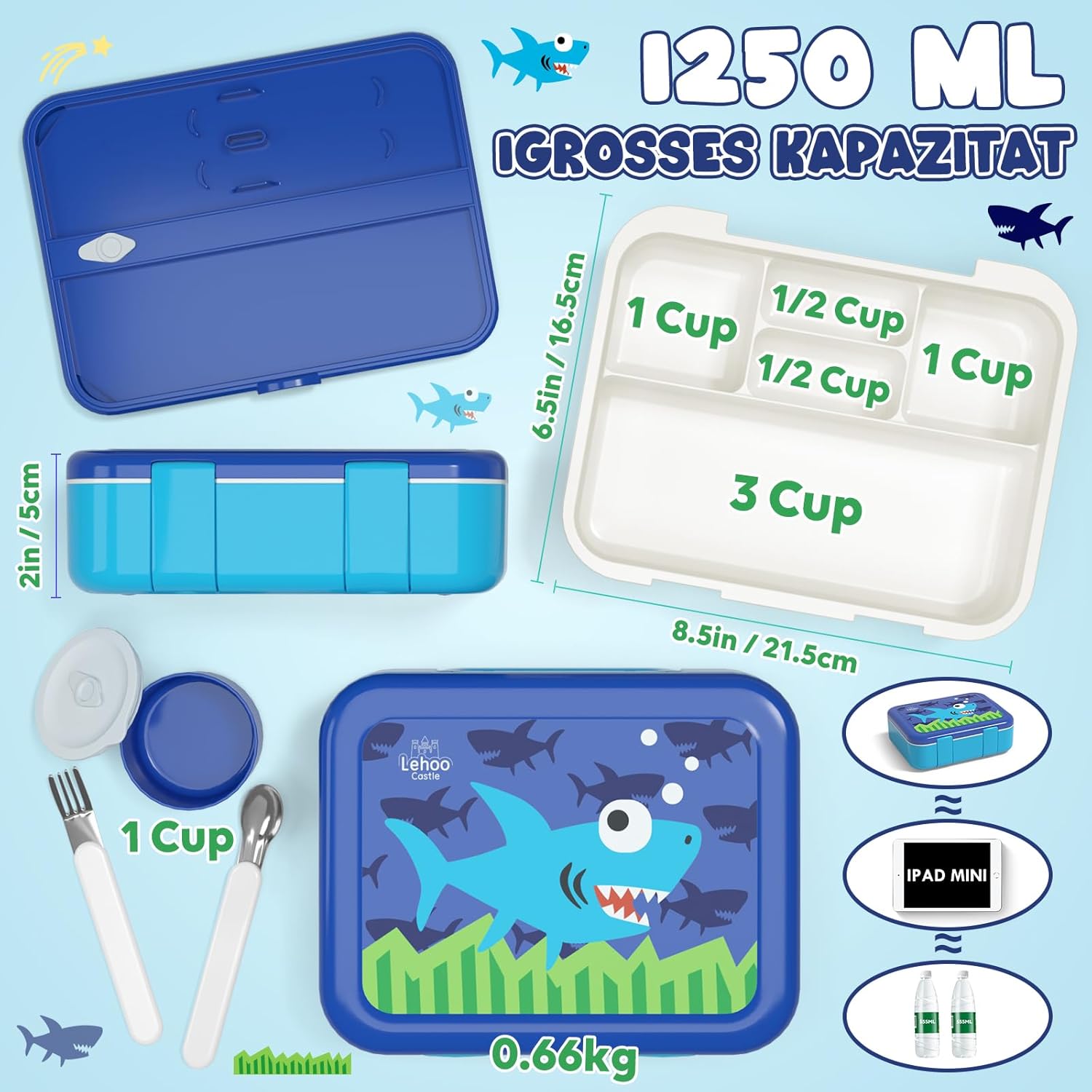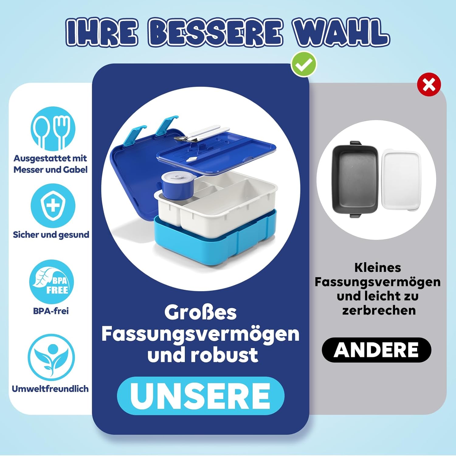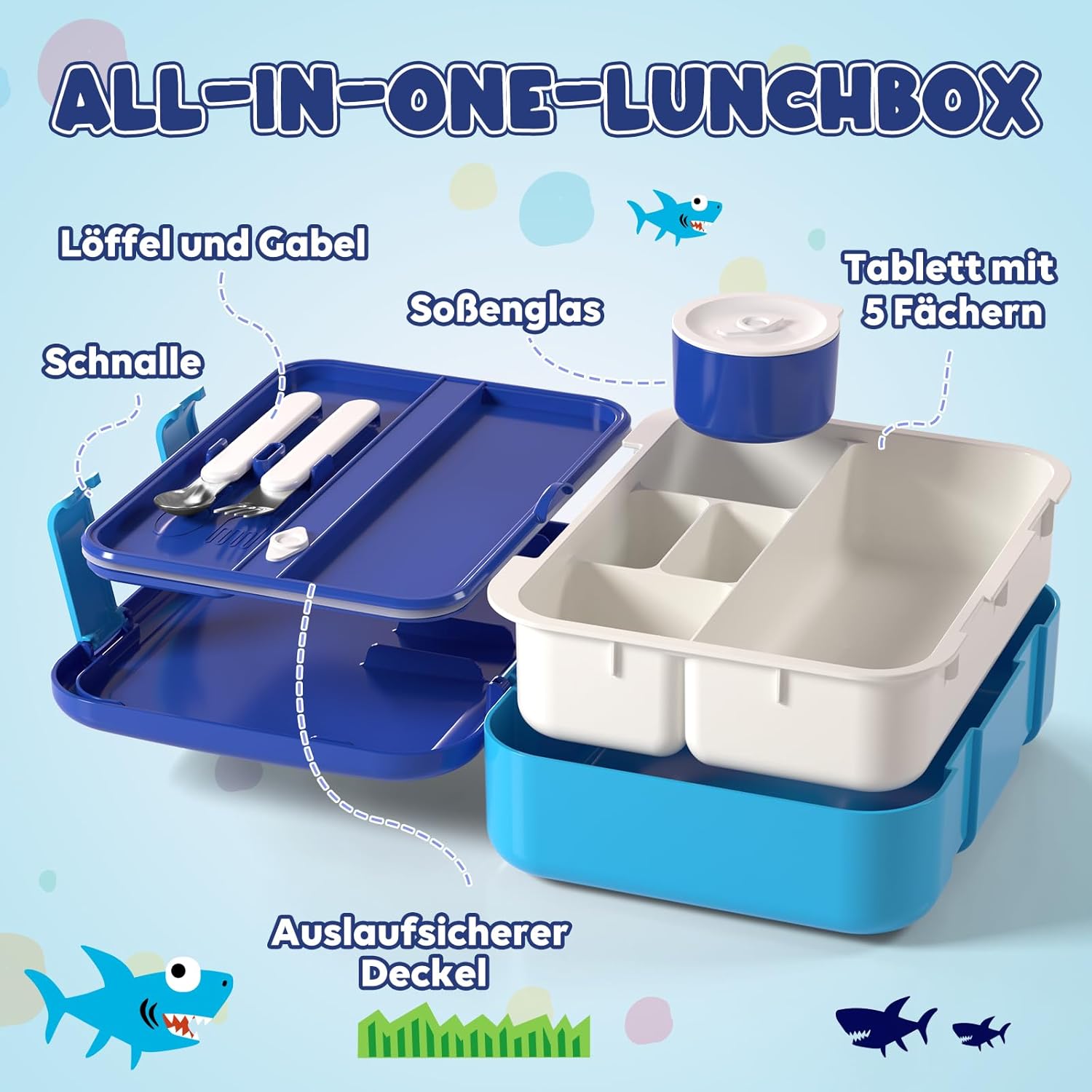 Contenitore per il pranzo per bambini con 5 scomparti - Il contenitore per il pranzo per bambini ha un design di 8,7 x 6,7 x 2,8 pollici, 1250 ml con 5 scomparti che possono separare alimenti diversi come alimenti di base, frutta fresca, verdura, snack, ecc. Contenitore per il pranzo per bambini - Il nostro contenitore per il pranzo per bambini con design all-in-one contiene una scatola bento + un barattolo di salsa + un cucchiaio e una forchetta. Tutto ciò di cui hai bisogno è incluso Bento Box Kids a prova di perdite - La spessa striscia di silicone nel coperchio è ben sigillata e la rende a prova di perdite al 100%. Il design con 2 clip di bloccaggio facilita l'apertura e la chiusura dei tuoi bambini. Materiale premium: la bento box e gli accessori per bambini sono realizzati in materiale alimentare di alta qualità (materiale PP di qualità 5), atossico e privo di BPA. Il materiale è più spesso, più forte, più resistente alle macchie, all'ambiente e alle cadute. Precauzioni per l'uso - Solo lo scomparto bianco del contenitore per il pranzo può essere utilizzato nei forni a microonde e nelle lavastoviglie. Ma l'intera scatola può essere conservata nel congelatore