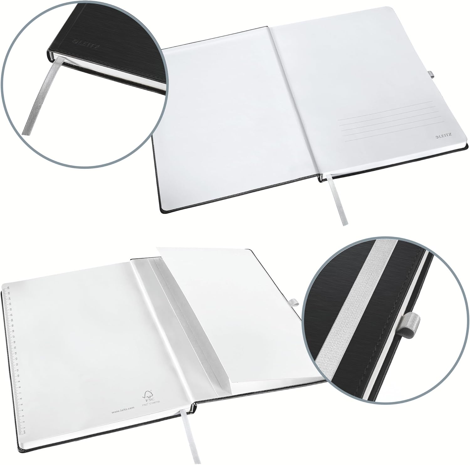Taccuino di alta qualità: taccuino universale in formato A4 con 160 pagine, 80 fogli, carta certificata FSC da 100 g/m² come quaderno, diario, diario e quaderno da disegno, alternativa sostenibile al taccuino Design pratico: la copertina rigida ha una superficie moderna, leggermente strutturata che offre una piacevole sensazione al tatto, con segnalibri in tessuto e 8 pagine perforate a strappo Funzionalità estese: tenuta salda grazie alla chiusura con elastico, passante per penna e custodia placcata all'interno della copertina posteriore per fogli sciolti o biglietti da visita Sempre con te: un accessorio quotidiano indispensabile per l'ufficio, la casa, la scuola o in viaggio - adatto per appunti quotidiani, schizzi, disegni, idee, pensieri e progetti Contenuto: 1 x quaderno Leitz A4 a quadretti, copertina rigida, 160 pagine 80 fogli, avorio, 100 g/m², dimensioni L x A x P: 21,7 x 2 x 29,7 cm, 0,71 kg, nero satinato, serie Style, 44761094