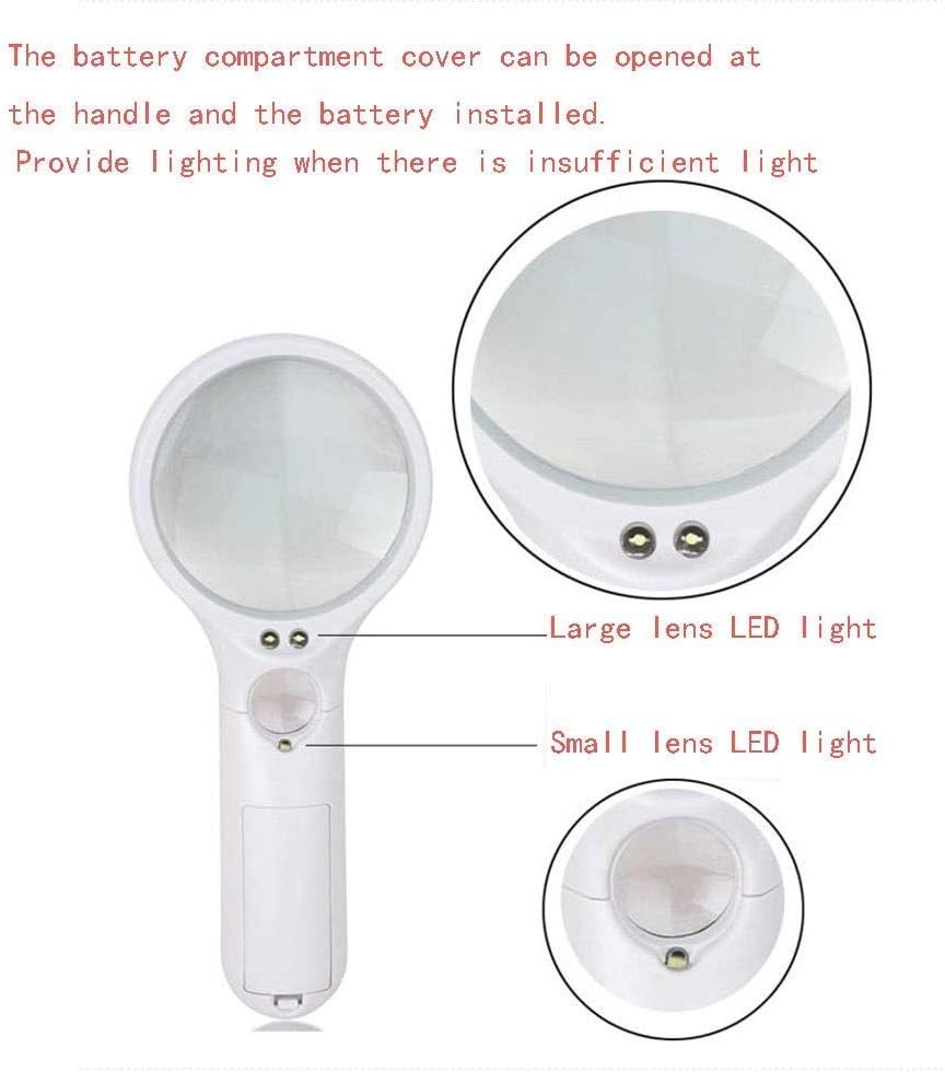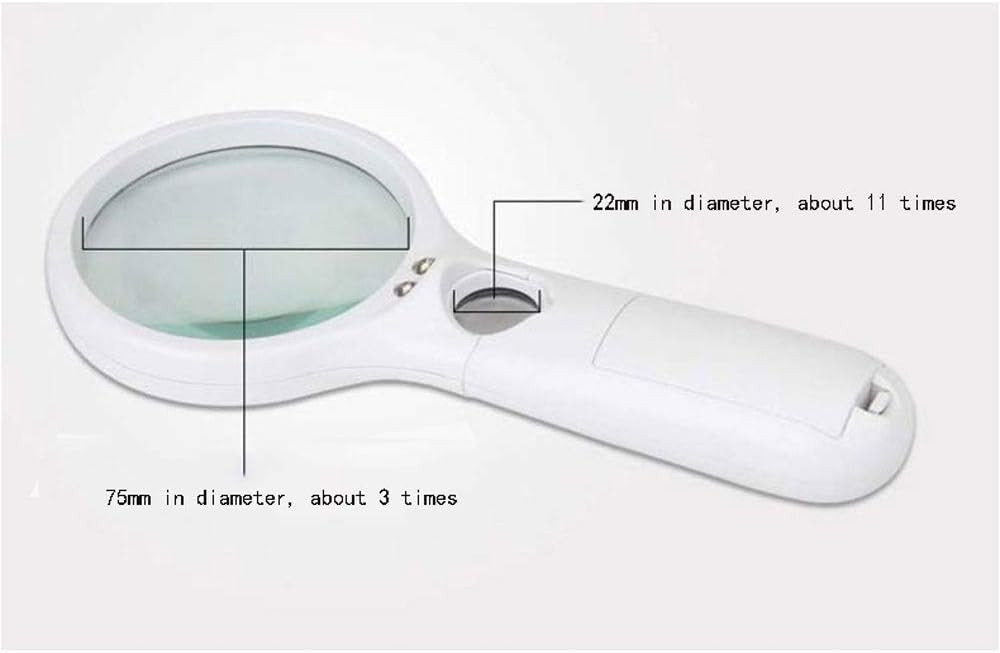Potenti luci LED: 2 luci luminose, a basso consumo energetico e a basso consumo energetico creano un'area di visualizzazione illuminata uniforme [senza batteria]. Grande lente in vetro - 75 mm per un ampio campo visivo senza distorsioni Design leggero: pesa solo 170 grammi; l'impugnatura ergonomica può essere tenuta comodamente in mano per un uso prolungato Manico comodo con impugnatura ergonomica per bambini, adulti, anziani, appassionati e professionisti. Elevata trasparenza - Grado ottico, resistente ai graffi, lente in vero vetro; ideale per la lettura, l'identificazione di gioielli, monete, francobolli e hobby