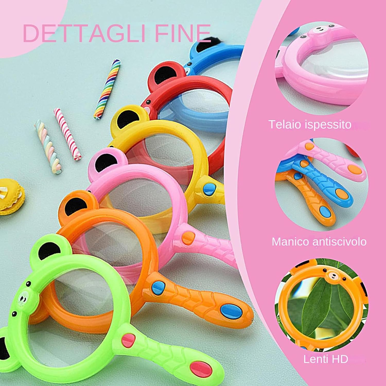 Sicurezza Integrata: Strumento investigativo per bambini con tecnologia anti-urto e superficie arrotondata completa, offre funzionalità ibride indoor-outdoor mantenendo dimensioni ridotte e peso minimo per un controllo intuitivo da parte dei piccoli utenti Compagno di scoperta: Strumento duale per indagini naturalistiche e supporto alla lettura. Aiuta a coltivare metodo scientifico e concentrazione attraverso l'esame di particolari testuali e elementi ambientali, trasformando ogni esperienza in occasione formativa. Selezione Accattivante: Miscela di intense e scelte imprevedibili trasforma l'unboxing in un rituale magico, aggiungendo entusiasmo a compiti educativi come osservare insetti o analizzare foglie con lenti infrangibili Grip Antiscivolo: La particolare texture sul manico curvo assicura una presa sicura anche con le manine sudaticce, per esaminare conchiglie, insetti o campioni naturali durante attività scientifiche all'aperto Gioco che stimola la scoperta: La forma amichevole 'orso trasforma la lente d'ingrandimento in un alleato 'immaginazione. Promuove il pensiero critico attraverso l'osservazione guidata, permettendo ai bambini di sviluppare autonomamente nuove teorie sul funzionamento del mondo che li circonda.