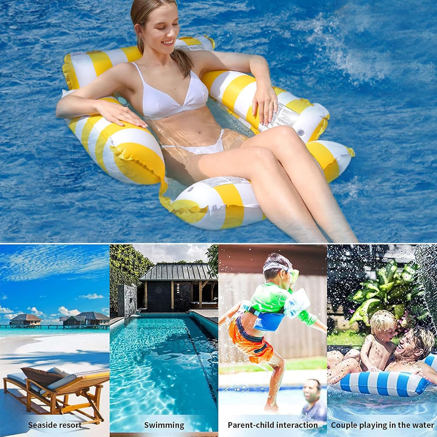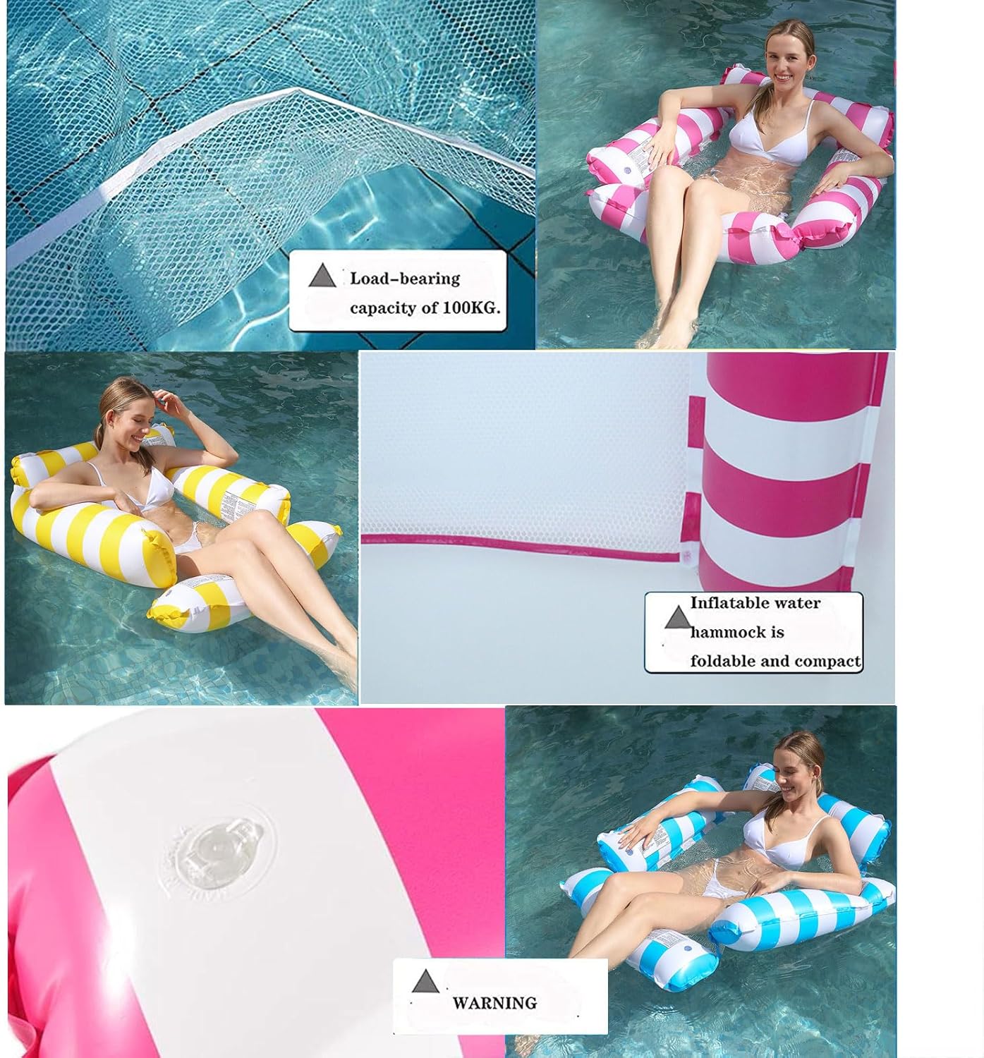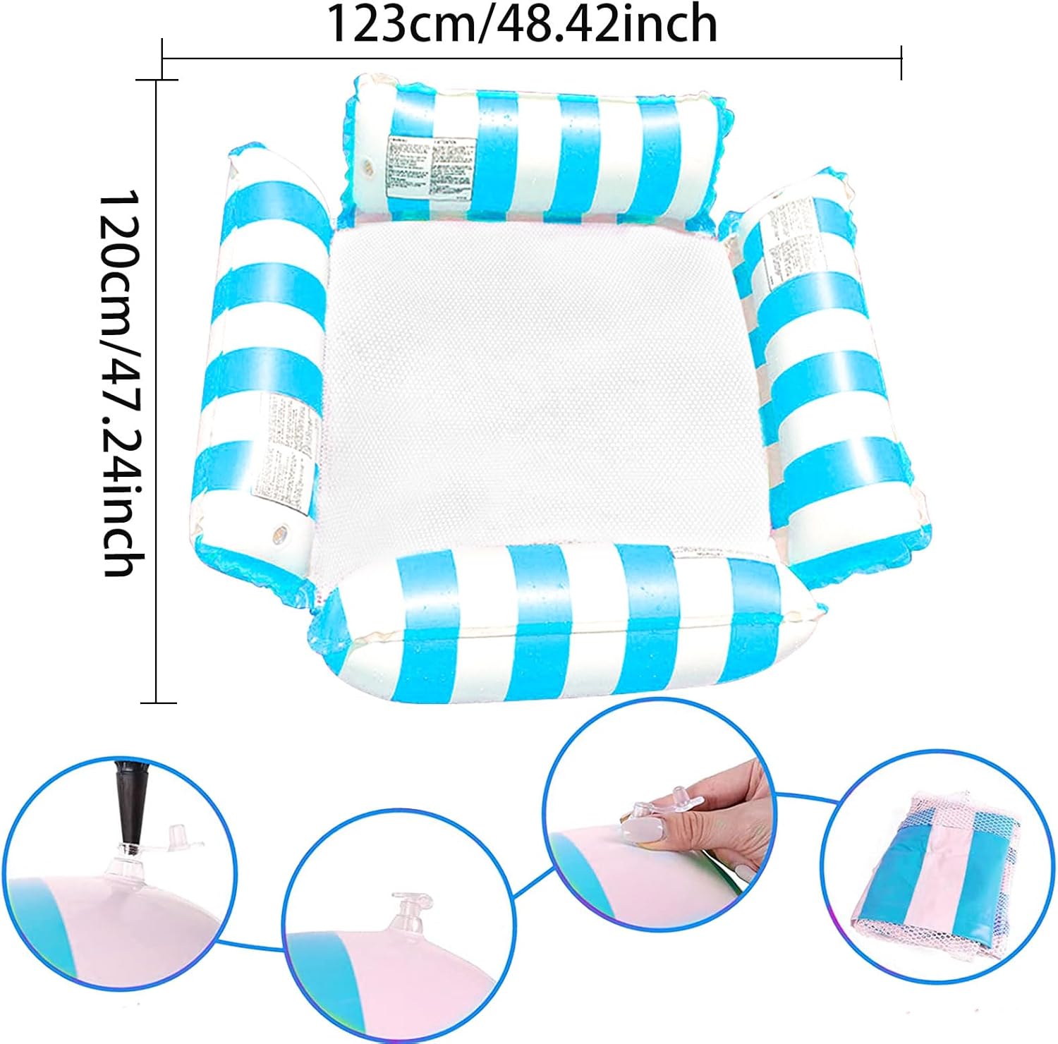 Amaca d'acqua 4 in 1: l'esclusiva funzione acqua può essere utilizzata come amaca, sedia a sdraio, drifter e sella sportiva. Il poggiatesta e il poggiapiedi galleggianti sono posizionati in modo che i nuotatori possano rilassarsi per ore in piscina. Giocattolo da piscina premium: questa amaca gonfiabile da piscina è realizzata in materiale PVC di alta qualità, morbido e confortevole, resistente, può essere asciugata rapidamente dopo l'uso, ha un'eccellente galleggiabilità e offre supporto e comfort sufficienti. Dimensioni: 123 x 120 cm. Facile da trasportare e da utilizzare: con 4 grandi cuscini gonfiabili e un sedile in rete stabile, è comodo da appendere in acqua e si adatta alla posizione galleggiante desiderata. La sedia galleggiante sgonfia può essere facilmente riposta in uno zaino o in una valigia e puoi portarla con te in qualsiasi momento quando sei in vacanza. Design unico: amaca da piscina composta da un sedile in rete con due braccioli laterali, un poggiatesta e un poggiagambe, adatta per l'uso tutto il giorno. Questo galleggiante da piscina è ergonomico, a differenza di una normale poltrona lounge, quindi puoi piegare le gambe sul cuscino inferiore e galleggiare per tutto il tempo che desideri. Goditi l'estate: le amache galleggianti sono perfette per una serie di attività ricreative come chiacchierare, riposare, dormire e altro ancora in acqua. Puoi goderti il tempo con i tuoi bambini in piscina. Perfetto per piscina, spiaggia, mare, lago e vacanze. Prendi semplicemente il tappetino da bagno e goditi la tua estate
