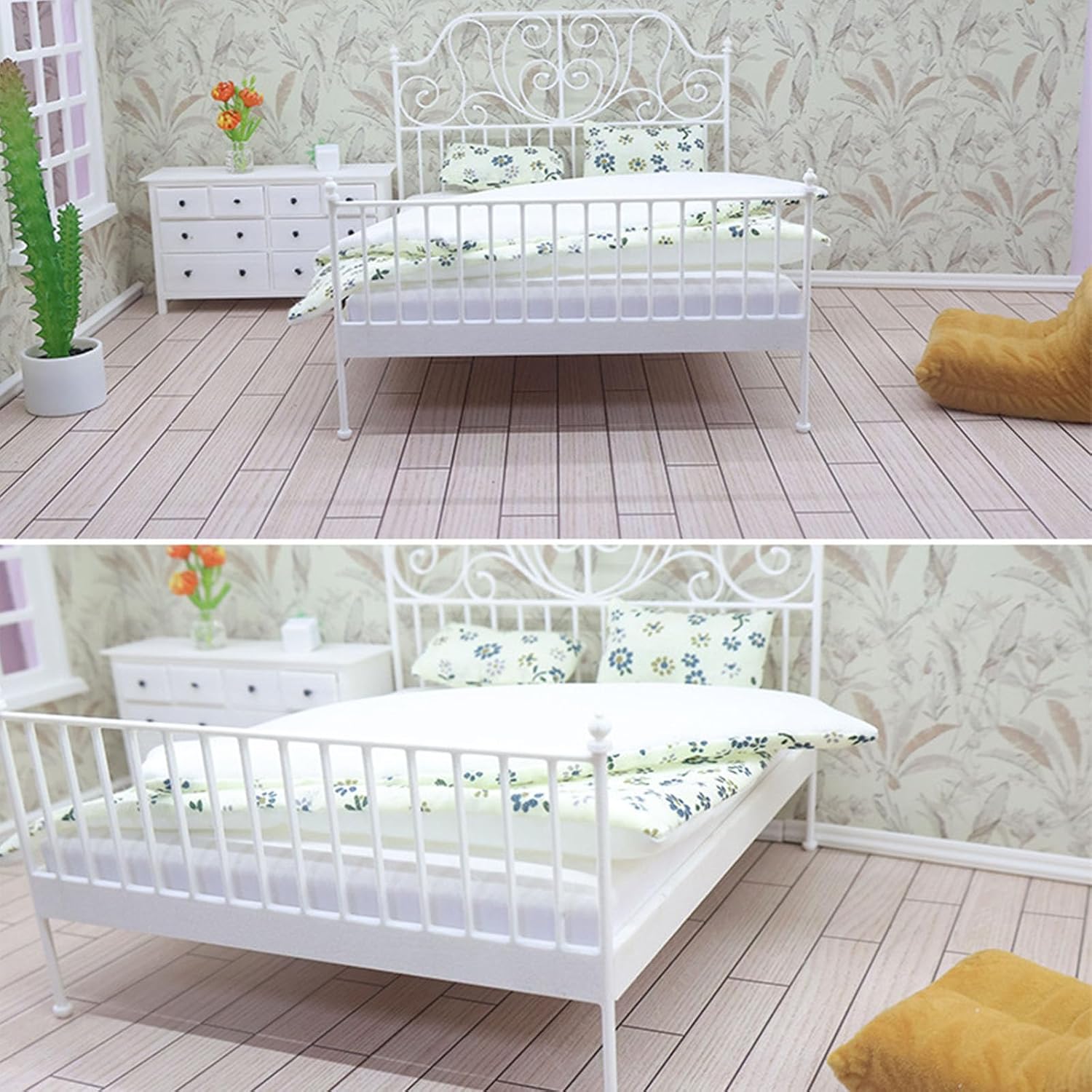 Materasso mobile, lenzuola rimovibili, biancheria da letto simulata ed estetica autentica in ferro battuto garantendo allo stesso tempo durevolezza per il gioco interattivo Il design realistico e il motivo floreale preservano la magia dei cottage europei nel paesaggio delle case delle bambole in miniatura Ideale per gli appassionati di case delle bambole, collezionisti in miniatura e genitori che esplorano mobili in scala dettagliati per l'esposizione di bambole con giunto sferico tra gli adulti Squisito letto per case delle bambole in metallo in scala 1/12 presenta un design in ferro fuso con biancheria da letto rimovibile, perfetto per creare un'incantevole camera da letto in miniatura Migliora il layout realistico delle case delle bambole, progetti fotografici in miniatura o laboratori artigianali con questo set da camera da letto comprensivo di cuscini e biancheria da letto