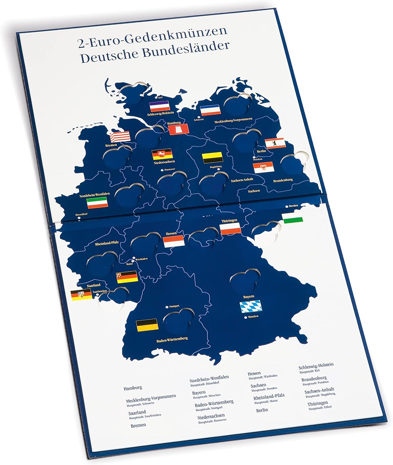 Qualità - L'album per monete da 2 euro degli Stati Federali Tedeschi presenta una mappa della Germania con perforazioni precise. È un punto di forza visivo in ogni collezione di monete commemorative da 2 euro. Pratico - L'album offre spazio per imprimere un totale di 16 monete da 2 euro della 1ª o 2ª serie degli Stati Federali Tedeschi. Grazie al pratico formato esterno di 255 x 280 mm, è facile da maneggiare e trasportare. Individuale - Ogni moneta ha una propria fustellatura, assegnata ai rispettivi Stati federali. Ciò consente una presentazione individuale e ordinata delle monete dei diversi Stati federali tedeschi. Sicuro - L'album per monete da 255 x 280 mm protegge le monete dagli influssi ambientali come la polvere e la luce. Mantiene la collezione al sicuro e contribuisce alla conservazione a lungo termine delle monete. LEUCHTTURM - Questo rende il collezionismo divertente! Dal 1917, LEUCHTTURM produce accessori di alta qualità per monete, francobolli e altri oggetti da collezione, sia per i principianti che per i collezionisti esperti.