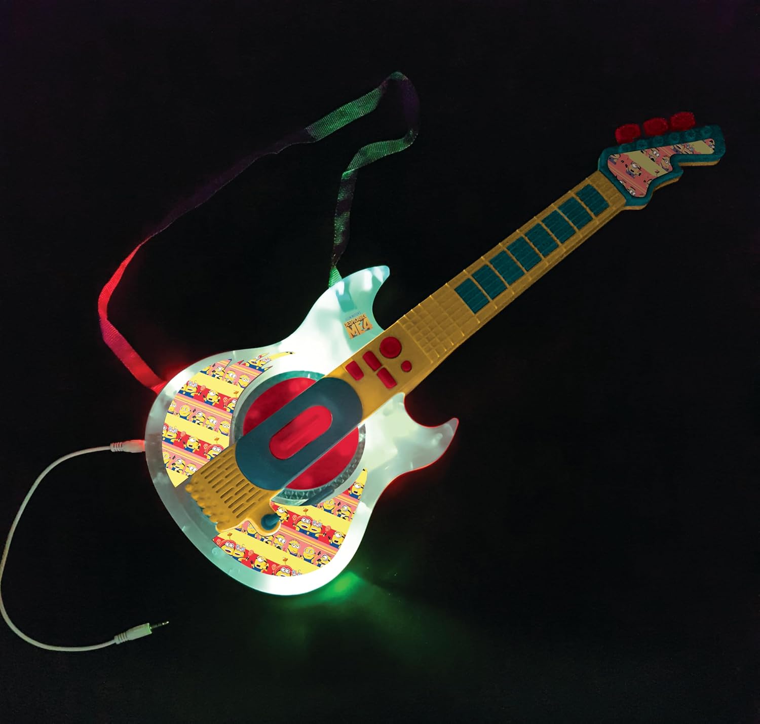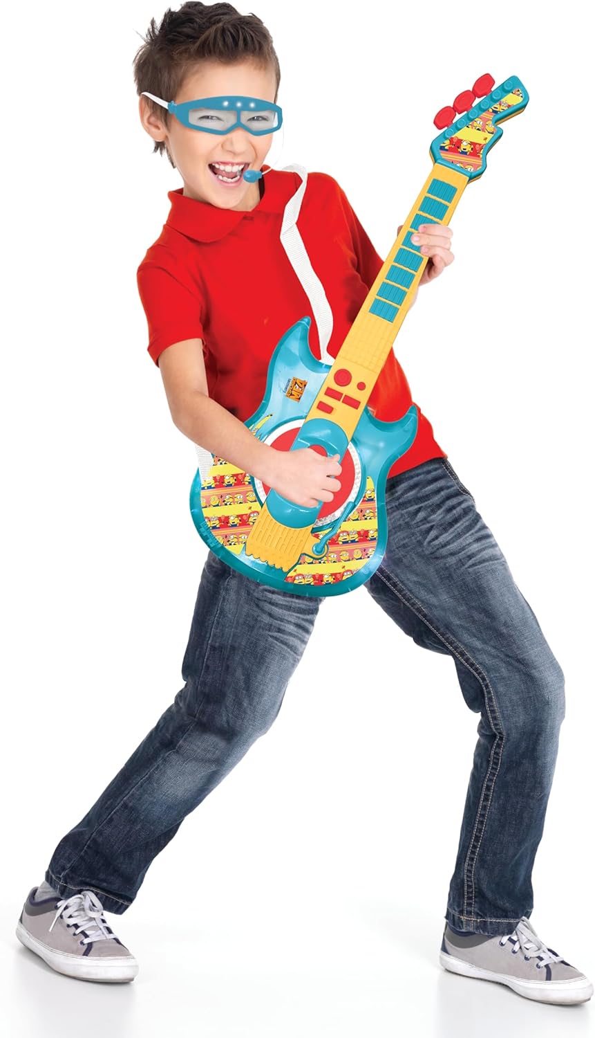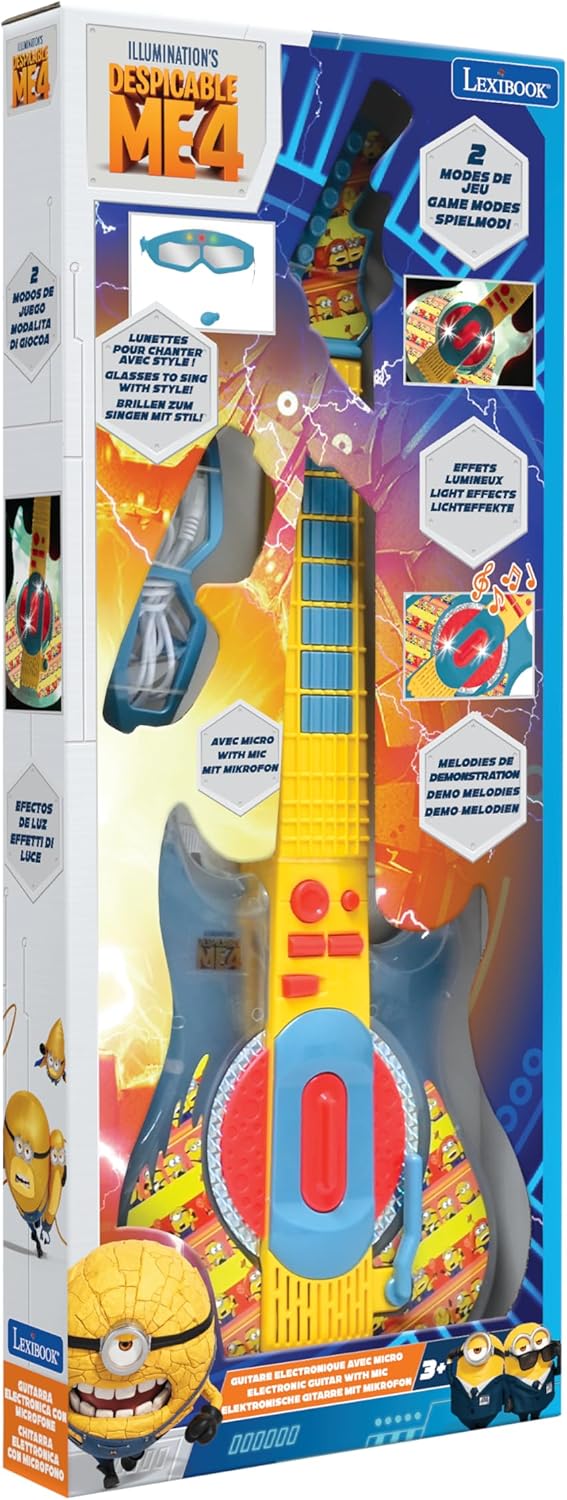 SUONA LA CHITARRA CON STILE - Scopri la musica con stile grazie a questa chitarra elettronica Cattivissimo Me, completa di occhiali e microfono per performance indimenticabili con i Minions! 2 MODALITÀ DI GIOCO - Riproduci brani demo o crea le tue melodie con i 6 brani e 2 ritmi inclusi. EFFETTI DI ILLUMINAZIONE - Goditi fantastici effetti di luce per spettacoli musicali indimenticabili. FACILE DA USARE - Con il suo manico a 6 pulsanti, questa chitarra elettronica è ideale per aspiranti giovani musicisti. DIMENSIONE PERFETTA - La chitarra è lunga circa 27 pollici, perfetta per i bambini per tenerla comodamente e vivere un'esperienza di gioco piacevole. QUALITÀ LEXIBOOK - Apprezzata dai bambini, approvata dai genitori. Come marchio di giocattoli rispettabile e certificato, Lexibook offre prodotti intelligenti, sicuri e di alta qualità da acquistare con fiducia.