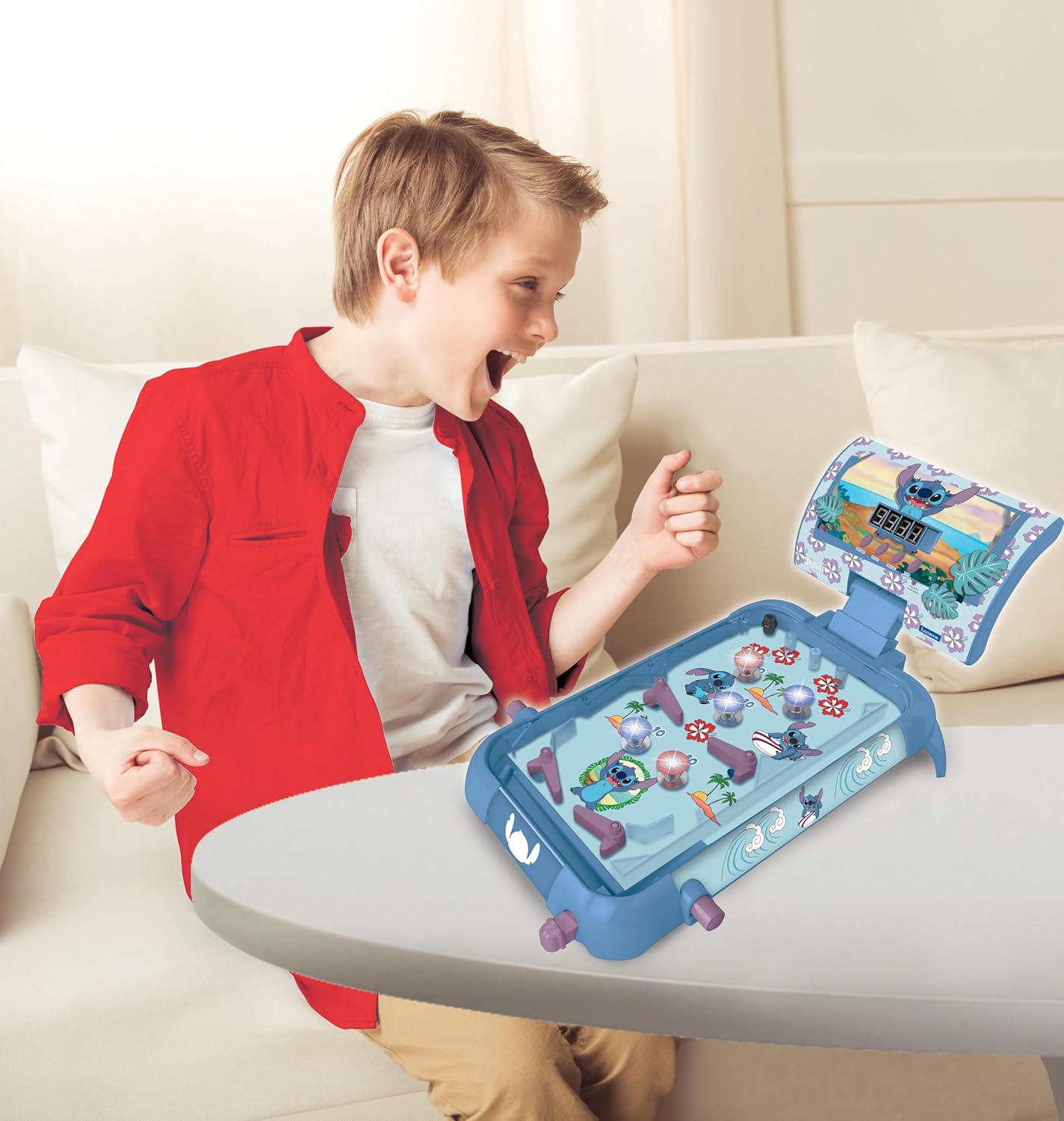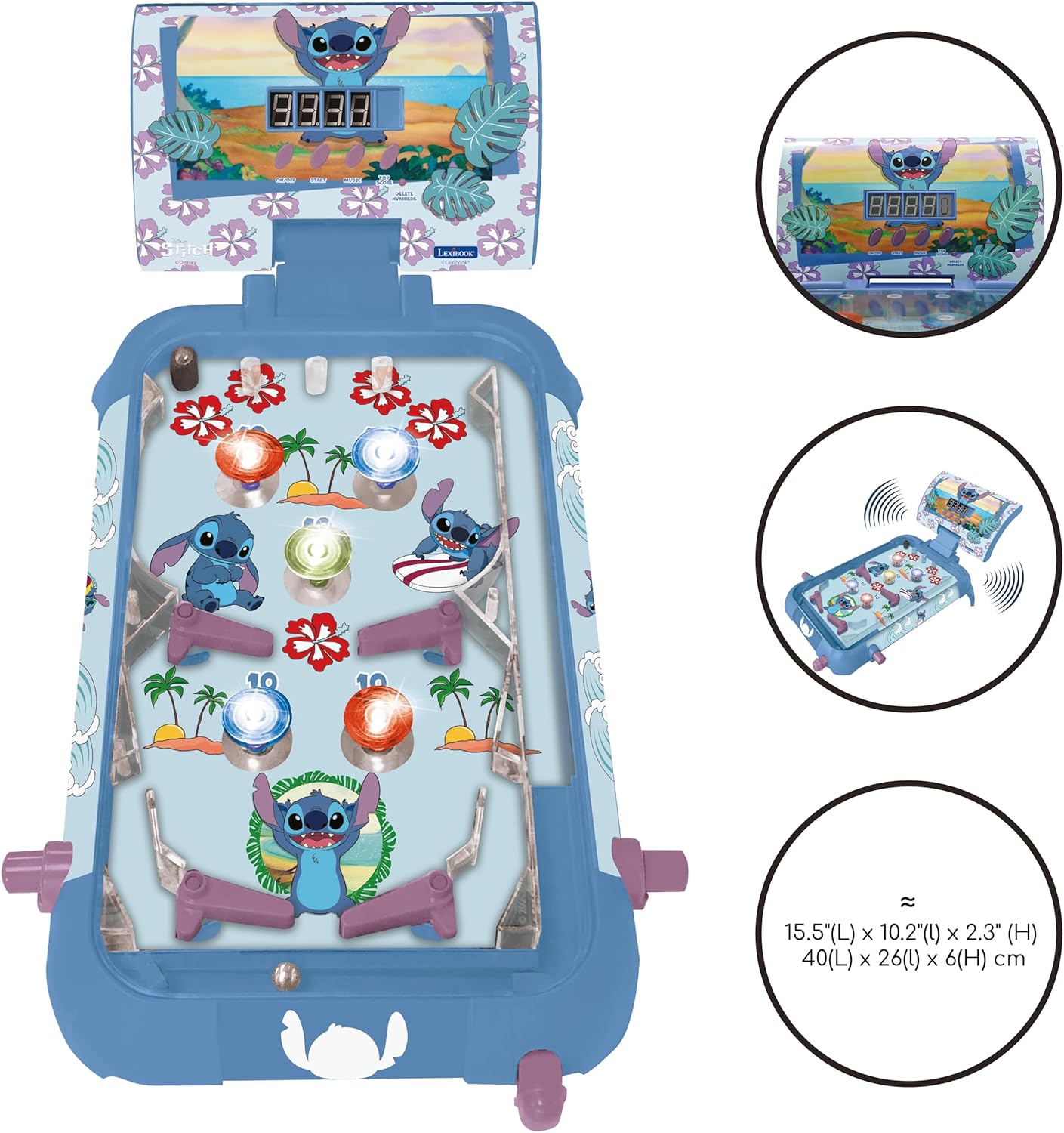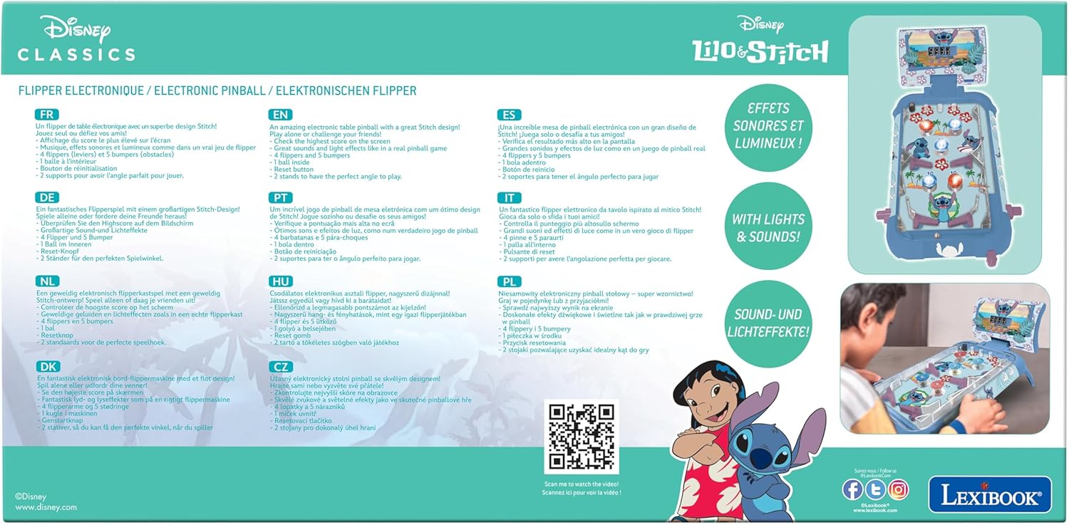 PER GIOCHI PINCOM SELVAGGI - Sfida i tuoi amici con il nostro flipper elettronico da tavolo nei colori Stitch! Che tu sia una superstar solista o che tu sfidi i tuoi amici, questo gioco è il tuo biglietto per il brivido. LUCI, SUONI, AZIONE! - Il nostro flipper è un vero e proprio spettacolo pirotecnico sensoriale. Le luci lampeggiano, gli altoparlanti risuonano: è come avere una sala giochi nel tuo salotto! CON BACHECA - Continua l'impresa! Il tuo punteggio più alto viene visualizzato sullo schermo e ti sfida a batterlo. Punta in alto, gioca duro e ottieni la vittoria. FLIPPER FRENZY – Canalizza il maestro del flipper che è in te! Rimbalza la palla come un professionista, accumulando punti come un campione. BUMPER BONANZA - Preparati al caos! I 5 paraurti superano le probabilità, sfidano la fisica e ti sorprendono in ogni momento. È come un giro sulle montagne russe a portata di mano!