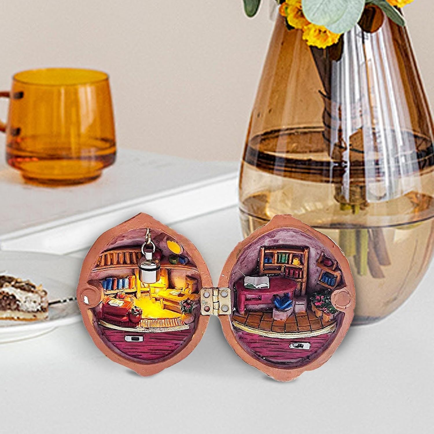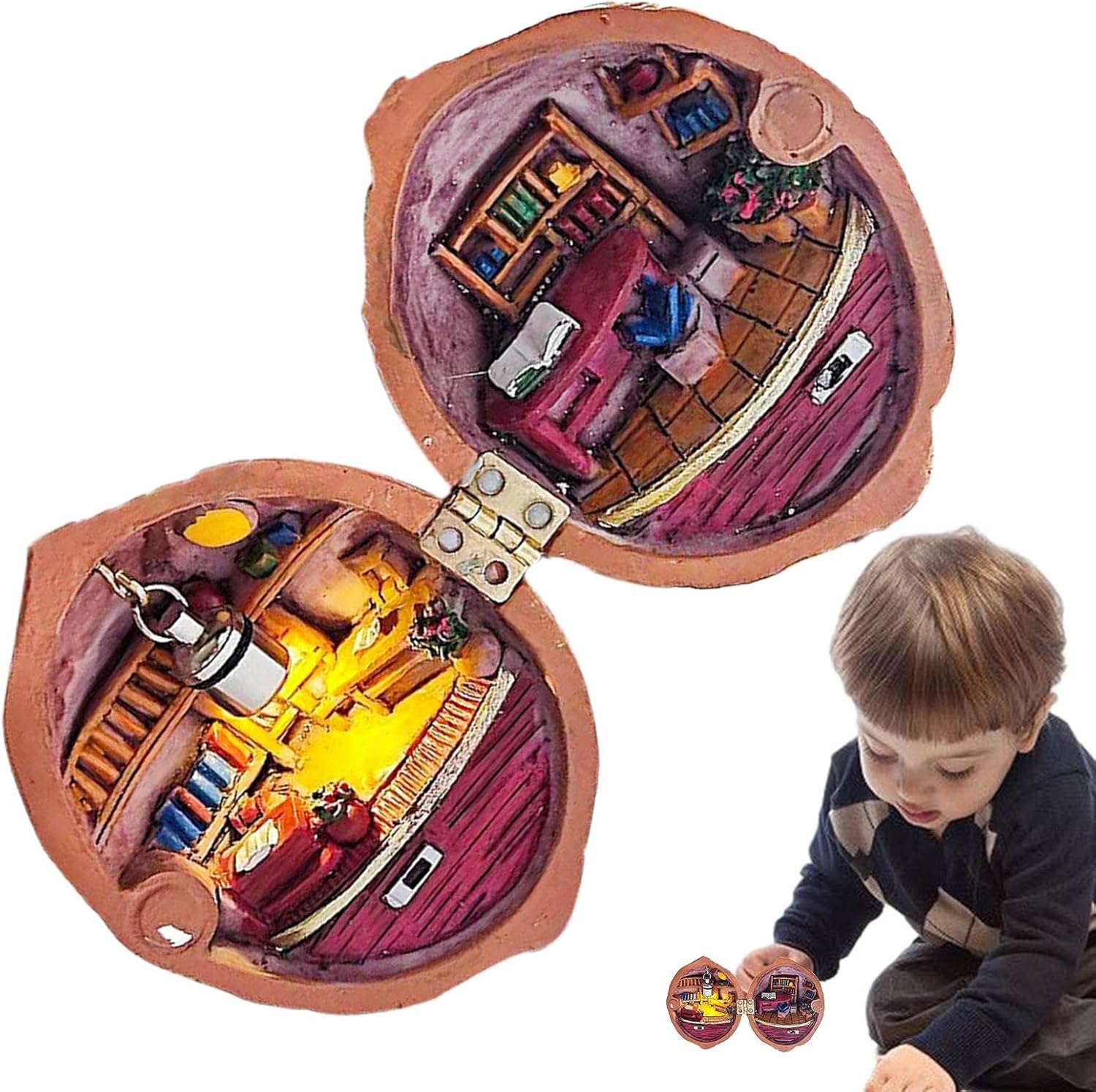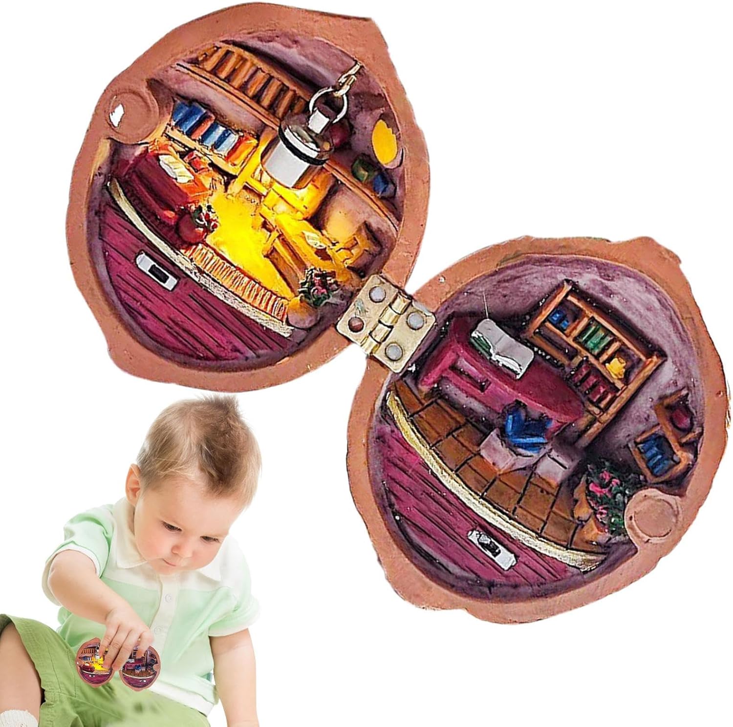 OTTIMA PRODUZIONE ARTIGIANALE: Realizzata in maniera impeccabile con sfere di noce marrone scuro, la nostra casa delle bambole in miniatura in noce aggiunge un tocco unico ai tuoi oggetti da collezione. Presentando una bellezza naturale e affascinante, questo pezzo si distingue per il suo fascino unico. Entra in un paese delle meraviglie in miniatura: scopri un bizzarro mondo ricoperto di resina che si apre come un tom per rivelare un'atmosfera da mini biblioteca, completa di argilla artigianale ed elementi in legno, arricchita da illuminazione commutabile e istruzione. Crea un capolavoro unico: esplora l'intricata architettura della casa delle bambole in miniatura e progetta le tue scene e le tue cabine artigianali. Aggiungi un tocco di immaginazione ai tuoi progetti fai-da-te e dagli vita in un modo affascinante e unico. DIVERTIMENTO ARTIGIANALE CREATIVO: crea la tua casa delle bambole con il nostro set di gusci di noce in miniatura, perfetto per artigiani esperti e principianti. Crea un mondo personale per esaltare la bellezza della tua collezione. GRANDE REGALO: migliora la tua famiglia in miniatura di familiari, amici o amante con questa casa delle bambole in noce in miniatura. È un'aggiunta perfetta e unica alla tua collezione che incoraggia la gioia, la creatività e la cura. Un ottimo regalo per compleanni, vacanze e ogni occasione speciale.