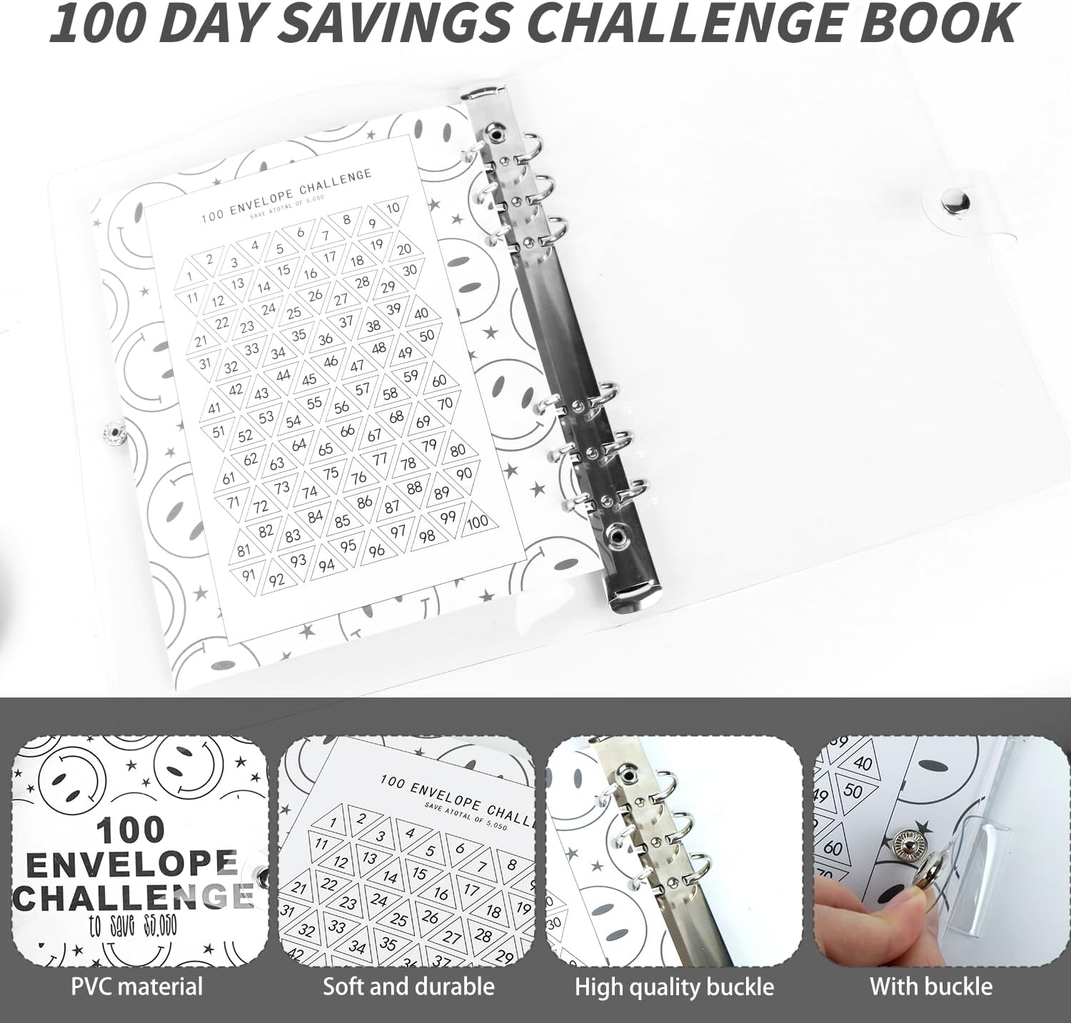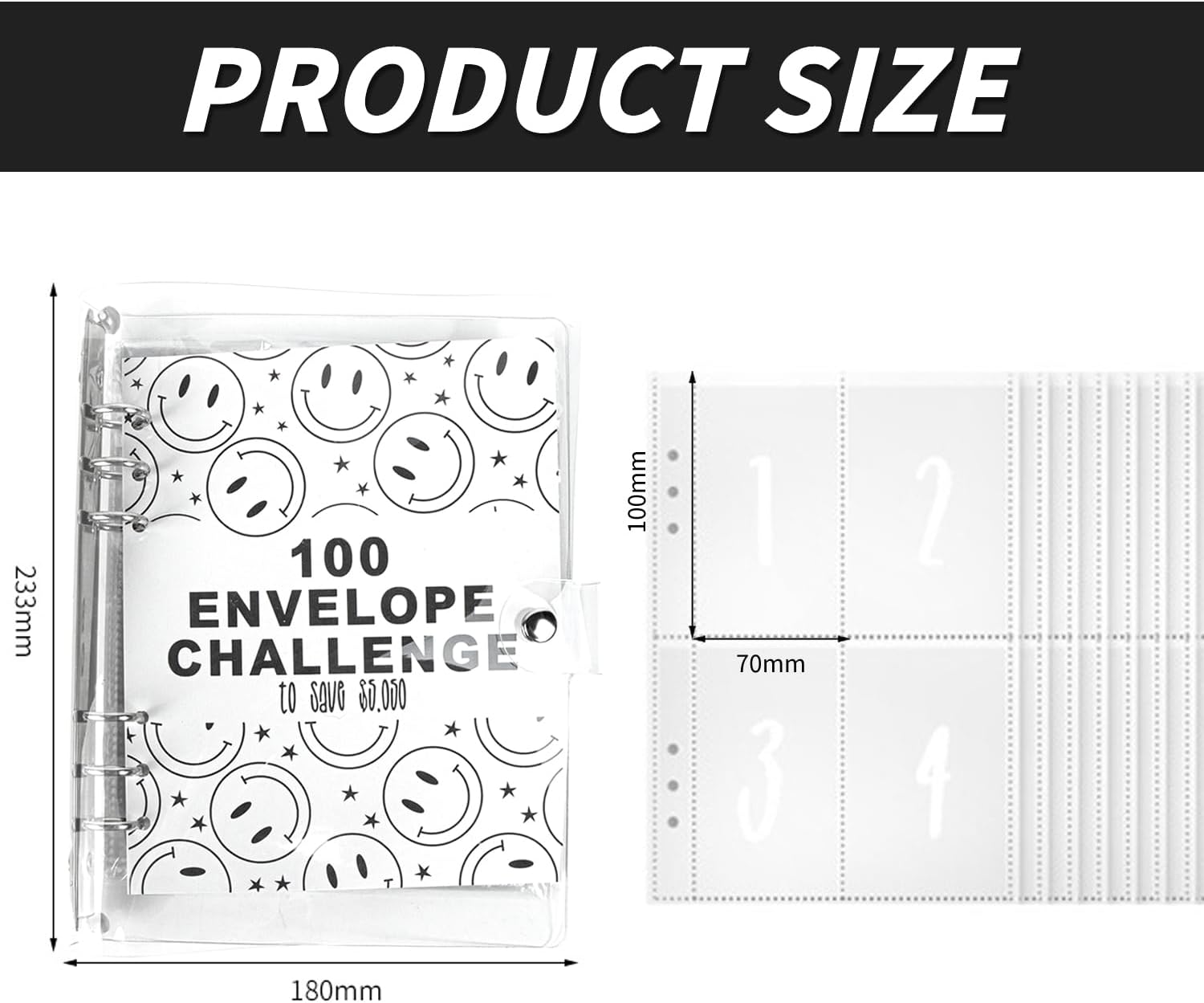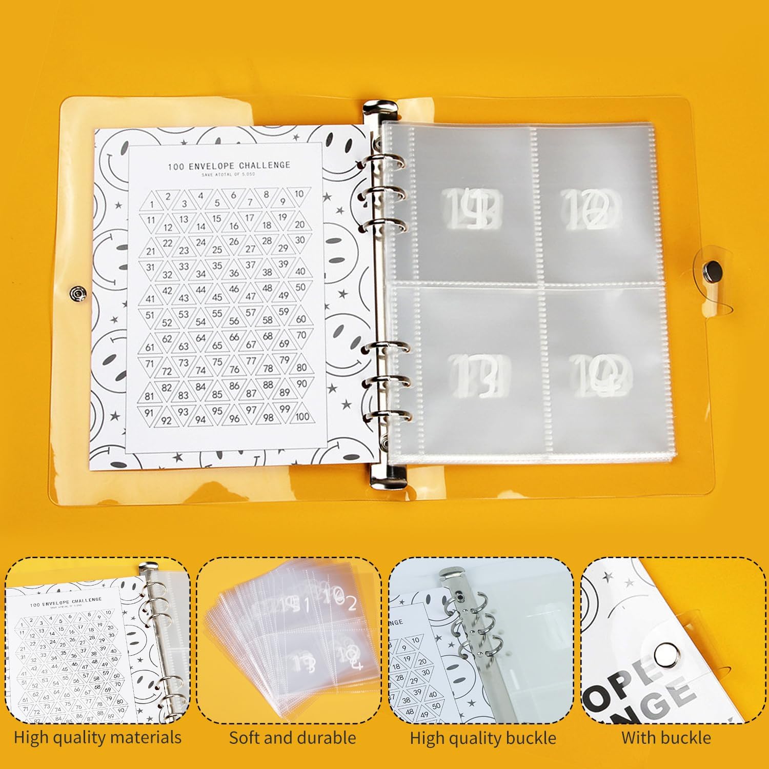 Cartella Del Risparmio: Rendere divertente il risparmio e il bilancio, la cartella della sfida delle 100 buste presenta una sfida di 100 giorni in cui si segnano o si strappano i simboli delle buste corrispondenti a ogni deposito. Libro Del Risparmio Per La Sfida Del Denaro: La cartella del risparmio viene fornita con 25 pellicole di cartoncino a quattro scomparti e 1 foglio di cartone per 100 giorni, Ogni busta rappresenta un giorno e trasforma il risparmio in un'attività divertente e visiva. Buste Porta Soldi Impermeabili E Resistenti: Il guscio è realizzato in materiale PVC di alta qualità, altamente trasparente e luminoso, il guscio è resistente ai graffi e durevole, la funzione impermeabile protegge anche i vostri oggetti di valore. Facile Da Trasportare E Da Usare: Il formato A5, leggero e portatile, è ideale per la pianificazione finanziaria in viaggio; è possibile utilizzare il libro del risparmio come organizzatore del risparmio e il portafoglio di buste per la pianificazione del denaro. Aiuto Per Il Budgeting E La Gestione Finanziaria: Questo libretto di risparmio è eccellente per coinvolgere tutta la famiglia nel risparmio e insegnare ai bambini la gestione del denaro, aiutando a monitorare i progressi dei risparmi attraverso un sistema interattivo di facile utilizzo.