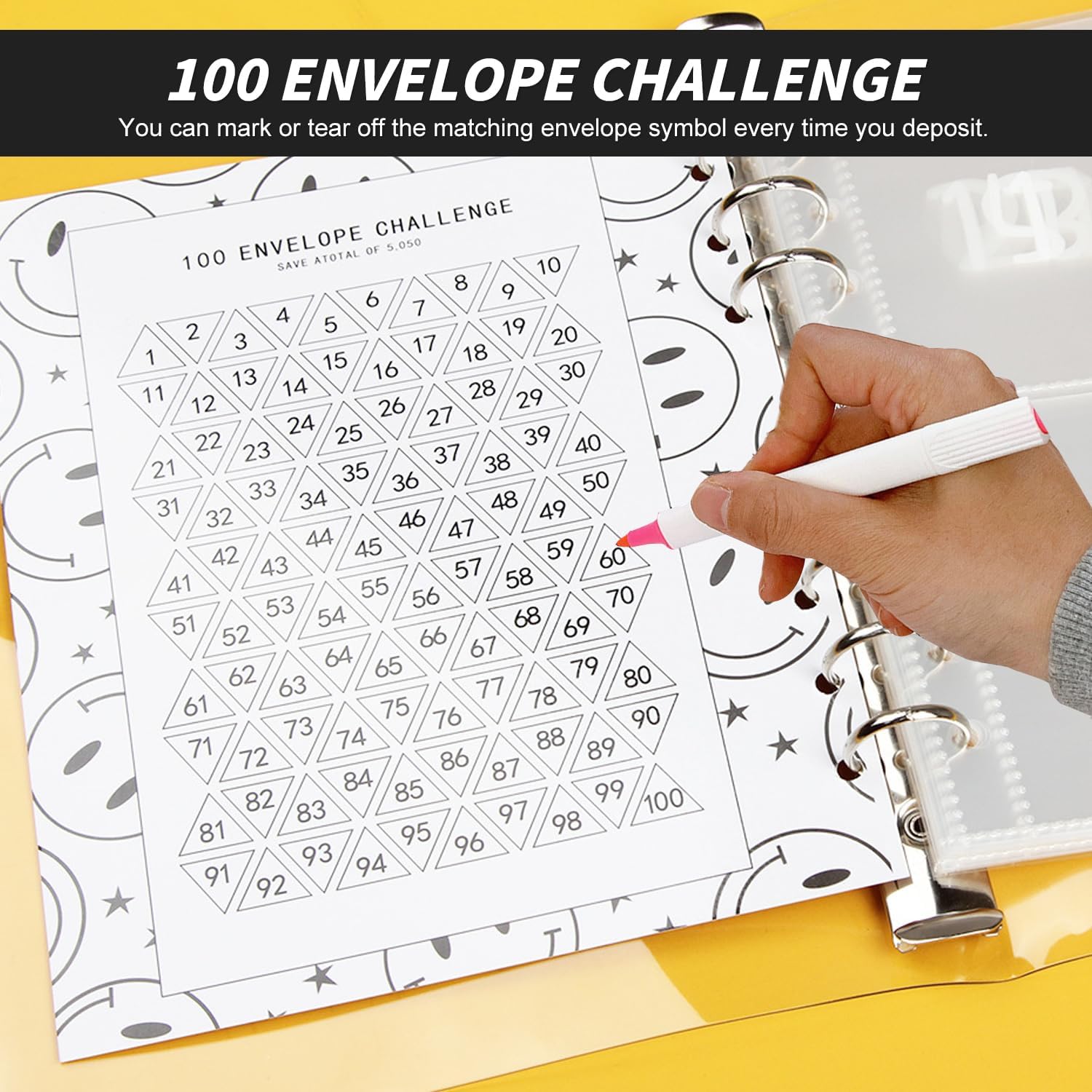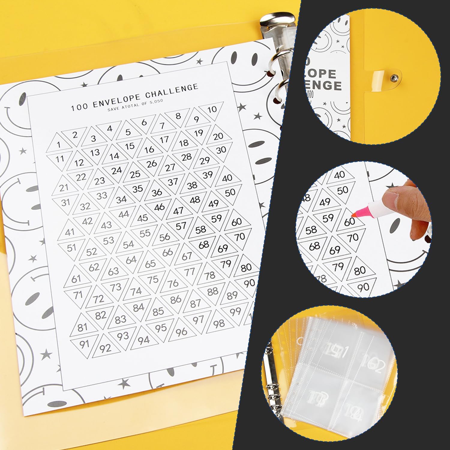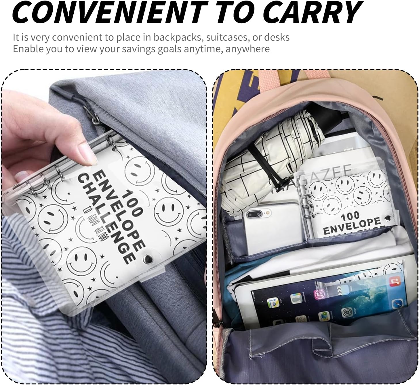 Cartella Del Risparmio: Rendere divertente il risparmio e il bilancio, la cartella della sfida delle 100 buste presenta una sfida di 100 giorni in cui si segnano o si strappano i simboli delle buste corrispondenti a ogni deposito. Libro Del Risparmio Per La Sfida Del Denaro: La cartella del risparmio viene fornita con 25 pellicole di cartoncino a quattro scomparti e 1 foglio di cartone per 100 giorni, Ogni busta rappresenta un giorno e trasforma il risparmio in un'attività divertente e visiva. Buste Porta Soldi Impermeabili E Resistenti: Il guscio è realizzato in materiale PVC di alta qualità, altamente trasparente e luminoso, il guscio è resistente ai graffi e durevole, la funzione impermeabile protegge anche i vostri oggetti di valore. Facile Da Trasportare E Da Usare: Il formato A5, leggero e portatile, è ideale per la pianificazione finanziaria in viaggio; è possibile utilizzare il libro del risparmio come organizzatore del risparmio e il portafoglio di buste per la pianificazione del denaro. Aiuto Per Il Budgeting E La Gestione Finanziaria: Questo libretto di risparmio è eccellente per coinvolgere tutta la famiglia nel risparmio e insegnare ai bambini la gestione del denaro, aiutando a monitorare i progressi dei risparmi attraverso un sistema interattivo di facile utilizzo.