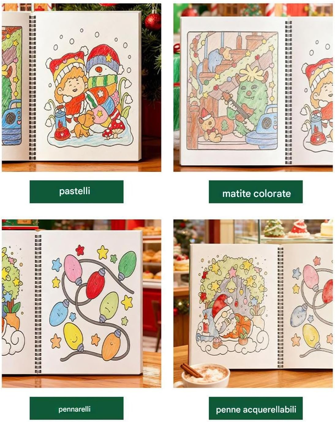Materiale per Conservazione Ideale: Il libro da colorare di Natale è composto da cartoncino affidabile, progettato per resistere strappo e mantenere bordi nitidi anche sotto forte pressione dei pastelli, permettendo agli utenti di conservare le loro care creazioni festive come ricordi preziosi per future reminiscenze, con pagine che durano nel senza danneggiarsi durante l'uso frequente. Divertimento Creativo Natalizio: Con grafiche cartoon vibranti di Babbo Natale e renne, questo libro da colorare combina e vacanze invernali con moi coinvolgenti che permettono di godere 'espressione artistica e divertirsi in modo appassionante durante il libero a casa. Le pagine festive stimolano la fantasia e il relax, ideali per attività creative in famiglia nel periodo natalizio, offrendo un passapiacevole e rigenerante. Attività Divertente per la Famiglia: I libri da colorare di Babbo Natale coinvolgono ragazzi e ragazze in una creatività , promuovendo legami familiari significativi mentre si preziosi ricordi a tema natalizio durante il periodo e feste, incoraggiando momenti di condivisione e gioia per tutta la famiglia con attività creative ispirate spirito del Natale. Pagine Colorate Guidate: Ideale per i più piccoli, questo libro da colorare natalizio unisce la colorazione guidata ad attività stimolanti che promuovono lo sviluppo a percezione cromatica e la coordinazione occhio-mano. È strumento artistico di facile accesso, per incoraggiare la creatività dei bambini in ambienti quotidiani come la casa e la scuola, durante il gioco o i momenti di apprendimento, offrendo un modo divertente per migliorare le abilità di base attraverso disegni c Design Inclusivo per Età: Questo libro da colorare natalizio è progettato per l'uso con pastelli, matite colorate e pennarelli, assicurando una ritenzione del pigmento eccellente per creazioni visive straordinarie. Il design inclusivo incoraggia l'espressione artistica immaginativa durante attività di gruppo o momenti creativi individuali, rendendolo adatto a tutte le età e per stimolare la creatività in famiglia o a scuola.
