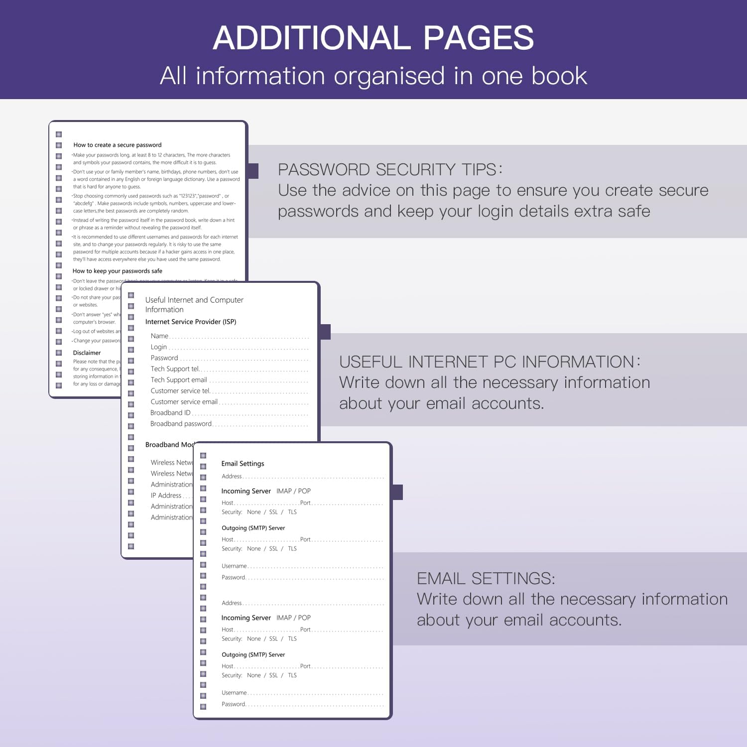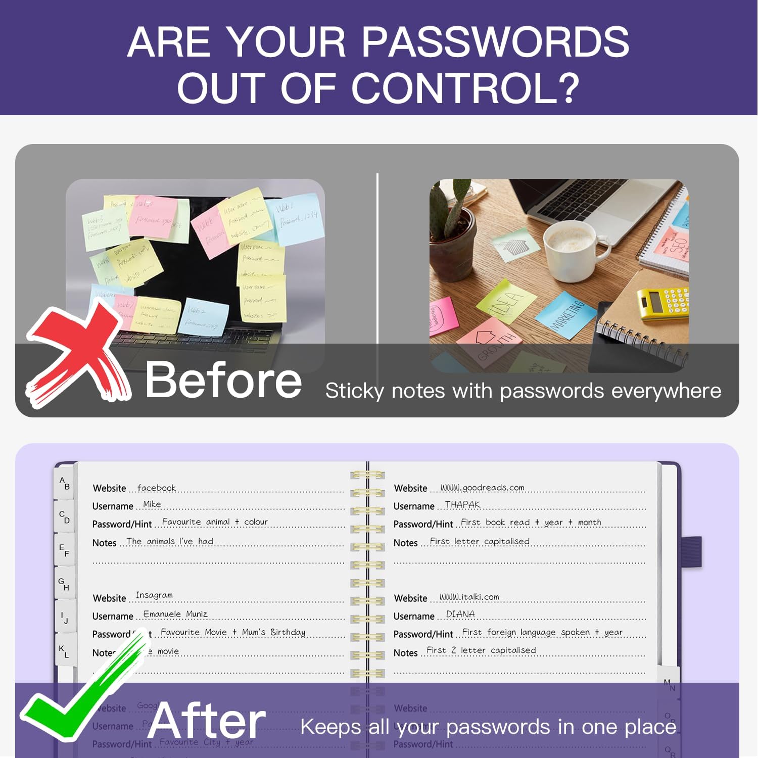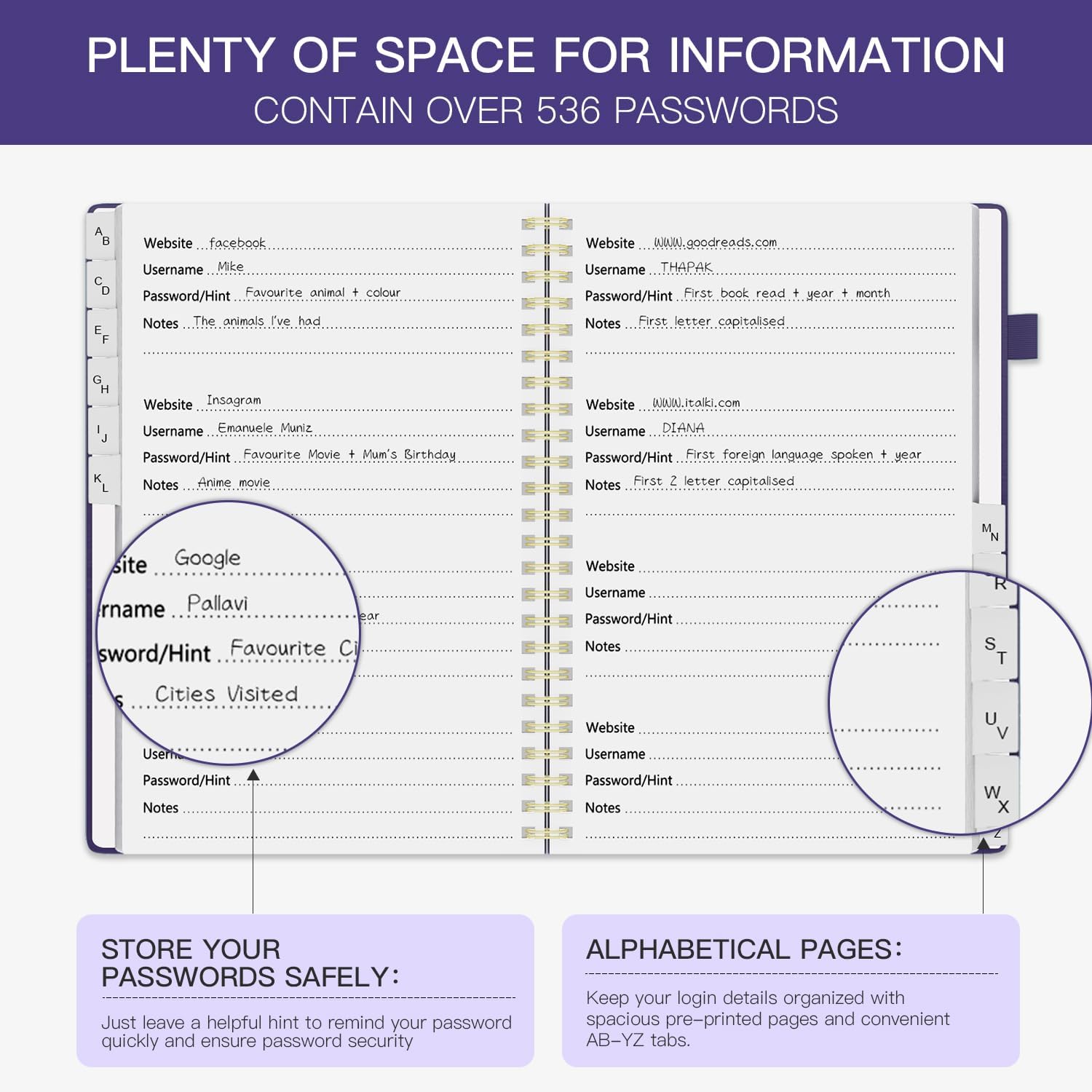 Le schede alfabetiche (A-Z) rendono facile e veloce trovare le tue password: stanco di perdere tempo prezioso ricordando la password giusta? Puoi individuare facilmente le informazioni esatte che stai cercando, senza bisogno di fastidiose ricerche. Il libro delle password Internet con schede alfabetiche semplifica l'accesso e l'utilizzo rapido delle informazioni. Ha anche una scheda aggiuntiva per i siti Web più utilizzati. Tutte le linguette sono laminate per resistere allo strappo. Il nostro registro delle password ha 10 pagine per scheda alfabetica. Non dimenticare mai la tua password: stanco di dimenticare costantemente le tue password? Dzhzal Password Book ti aiuta a creare facilmente password sicure e a mantenerle sicure e organizzate, fornendo un luogo dedicato in cui archiviare tutti gli indirizzi del tuo sito web, e-mail, nomi utente, password, evitandoti di gestire più password e rendendoti la vita molto più semplice. Organizzazione delle password intelligente, comoda e sicura: porta la tua sicurezza Internet a un livello superiore, con questo libro delle password è un modo efficace per mantenere le tue informazioni di accesso offline, in modo che nessun hacker possa mai raggiungerle. Per maggiore sicurezza, c'è spazio per scrivere suggerimenti al posto della password stessa e nessun titolo nella parte anteriore per mantenere le password al sicuro. FATTI PER DURARE CON QUALITÀ PREMIUM: questi libri con password sono realizzati con carta extra spessa da 100 g/m², senza sbavature. Misura media: 14,5 x 21,6 cm, misura adatta per il bagaglio a mano. Il taccuino delle password ha una copertina rigida ecologica soft-touch, spirale dorata, elastico, passante per penna, segnalibro, tasca per appunti. GRANDE REGALO: stai cercando un regalo pratico per i tuoi cari o gli anziani? Non cercare oltre questo Libro delle password di Internet per alleviare lo stress di ricordare le password. Bel Ringraziamento, regalo di Natale per tutte le età: facile da usare, mantiene le password organizzate.