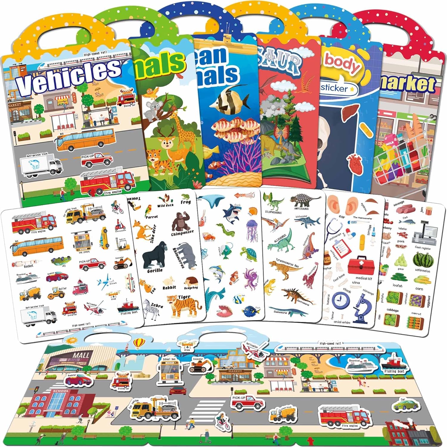 【6 ARGOMENTI - GIOCA E IMPARA IN UN UNICO SET】 Il nostro set di libri di adesivi riutilizzabili contiene 6 argomenti entusiasmanti: animali, veicoli, dinosauri, creature marine, corpo umano e supermercato. Ogni pagina apre un nuovo mondo da scoprire, ideale per bambini curiosi di 2, 3 e 4 anni. Un giocattolo didattico creativo che unisce divertimento ed educazione. 【300+ ADESIVI RIUTILIZZABILI - RIPROGETTARE IN QUALSIASI MOMENTO】 Il libro di adesivi per bambini dai 3 anni in su contiene oltre 300 adesivi colorati in gelatina 3D che sono facilmente rimovibili e riutilizzabili, senza lasciare residui. Gli adesivi sono realizzati in materiale siliconico di alta qualità, sicuro per i bambini (senza BPA) e possono essere puliti con acqua. Ideale per ore di divertimento. 【PORTATILE E DA VIAGGIO - GIOCATTOLO DA VIAGGIO PER BAMBINI】 Ogni libro di adesivi è dotato di una pratica maniglia per il trasporto e un vano portaoggetti per gli adesivi: compatto e leggero. Perfetto per viaggi, viaggi in auto o in aereo, sale d'attesa, ristoranti o in vacanza. Idea di attività da portare in movimento, senza passare il tempo davanti allo schermo. 【PROMUOVE LE CAPACITÀ MOTORIE, LA LINGUA E L'IMMAGINAZIONE】 Posizionando gli adesivi nel libro degli adesivi, i bambini allenano le loro capacità motorie, la coordinazione occhio-mano e la concentrazione. Allo stesso tempo viene incoraggiato il pensiero creativo: i bambini piccoli possono raccontare le proprie storie e sviluppare così in modo giocoso le loro capacità linguistiche e la loro immaginazione. 【REGALO SENSIBILE PER BAMBINI DA 2 3 4 ANNI】 Che sia come souvenir, regalo di compleanno o sorpresa a Natale, questo set di libri di adesivi è un regalo amorevole per ragazzi e ragazze. È adatto per la scuola materna, la scuola dell'infanzia, l'istruzione domiciliare o semplicemente per il gioco creativo a casa. Un giocattolo versatile che delizia i bambini.