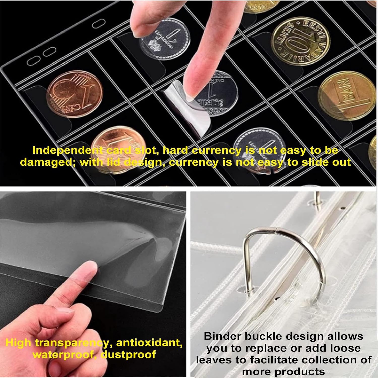 Comodo da trasportare: con la sua maniglia facile da trasportare, questo libro di raccolta monete garantisce un trasporto senza problemi del tuo prezioso . Ora puoi portare la tua collezione ovunque tu vada e mostrare la tua passione per il collezionismo di monete. Antipolvere e impermeabile: con più scomparti per monete e una copertura in pelle PU impermeabile resistente, il nostro libro di raccolta monete consente un'organizzazione facile ed efficiente del tuo . Maggiore sicurezza: la tua preziosa collezione di monete con l'ultima aggiunta al libro della collezione di monete. Caratterizzato da un design resistente con cerniera, assicura che il tuo prezioso rimanga in posizione e rimanga senza danni in ogni momento. Numerosi scomparti: progettato con molte tasche separate e scomparti portaoggetti, questo libro di raccolta monete conserva i tuoi oggetti in modo sicuro e organizzato. Pagine di raccolta versatili: questo libro di raccolta di monete ha varie pagine che possono ospitare diverse dimensioni e forme, nonché banconote o francobolli. Puoi goderti una vasta gamma di applicazioni e mostrare le tue collezioni con facilità.