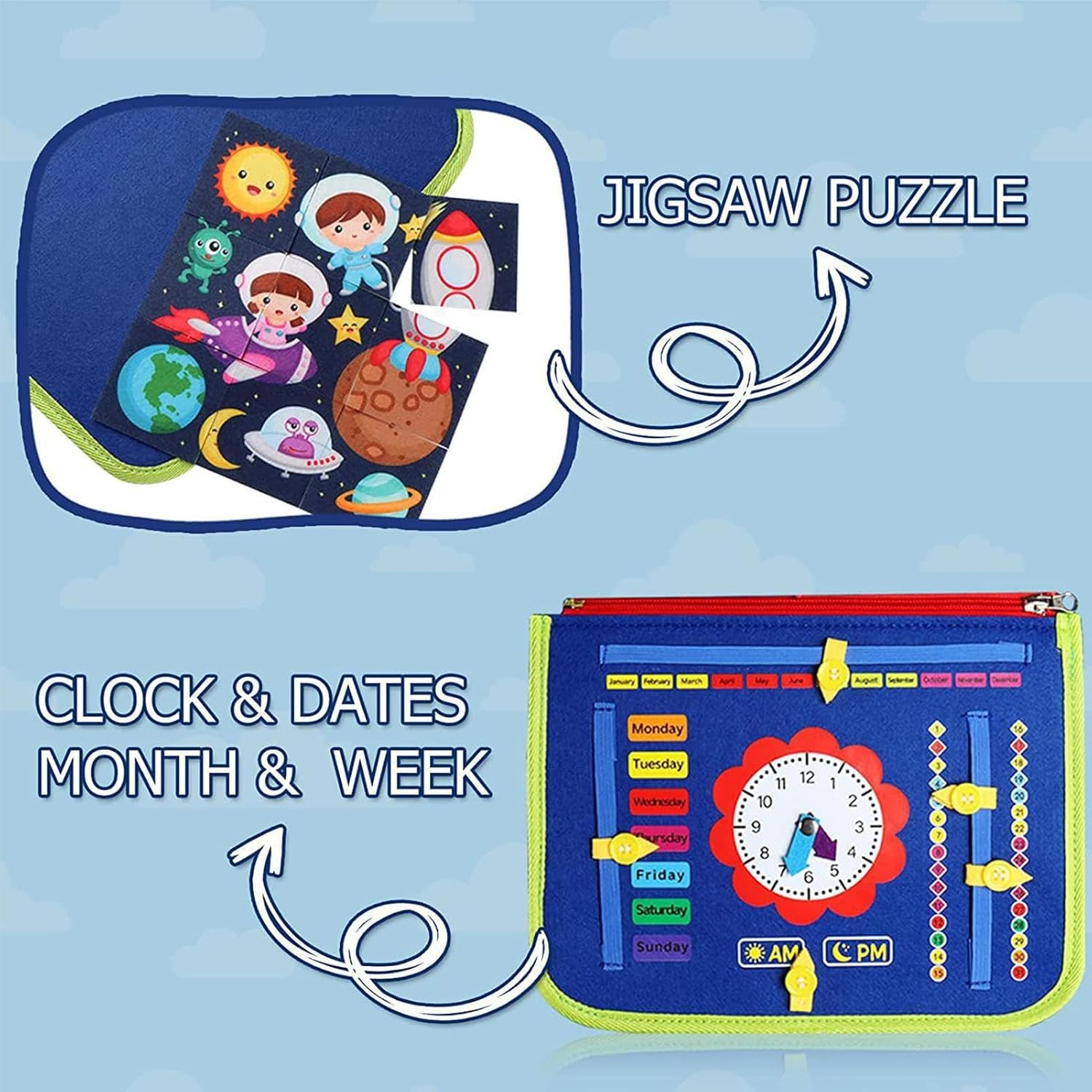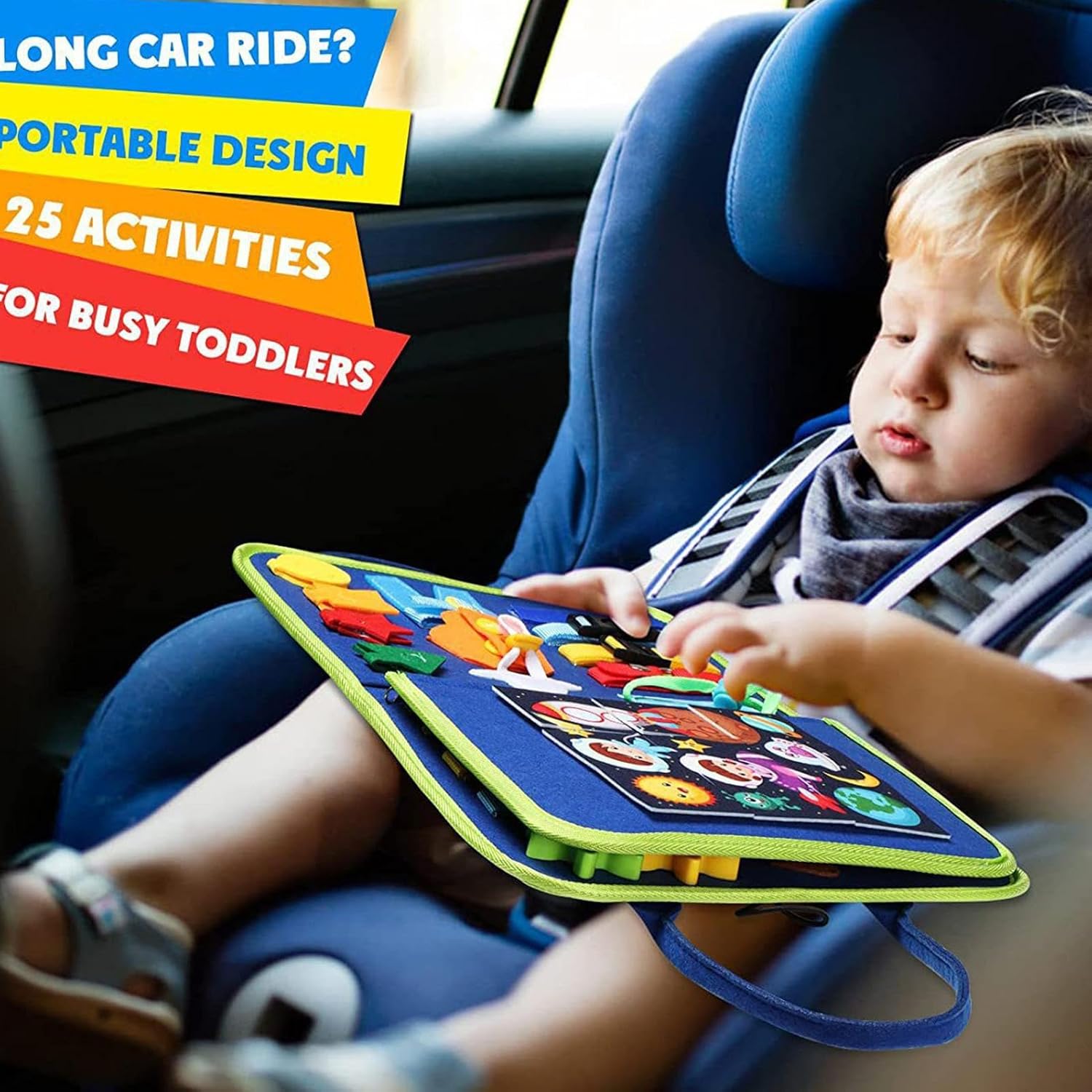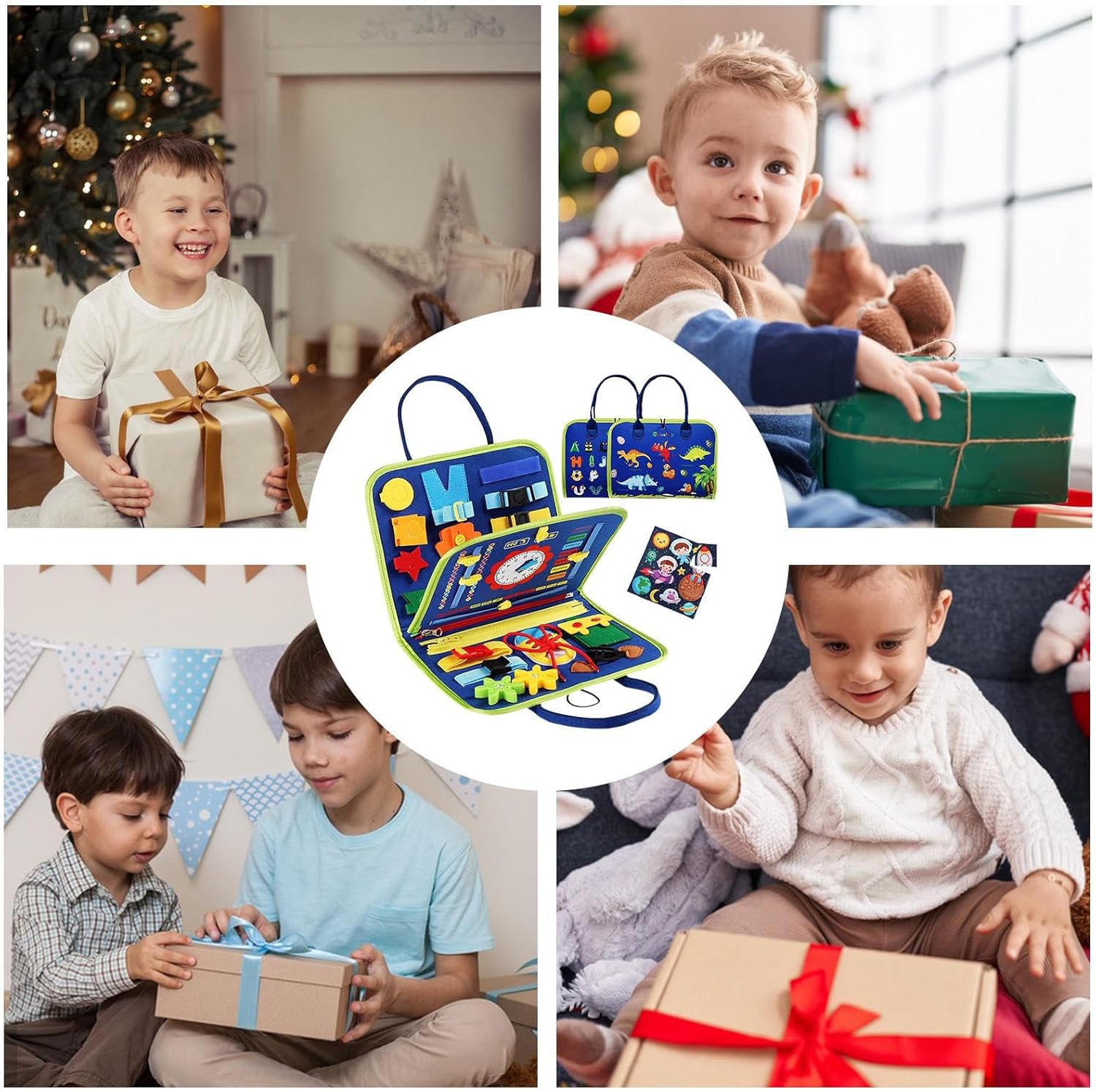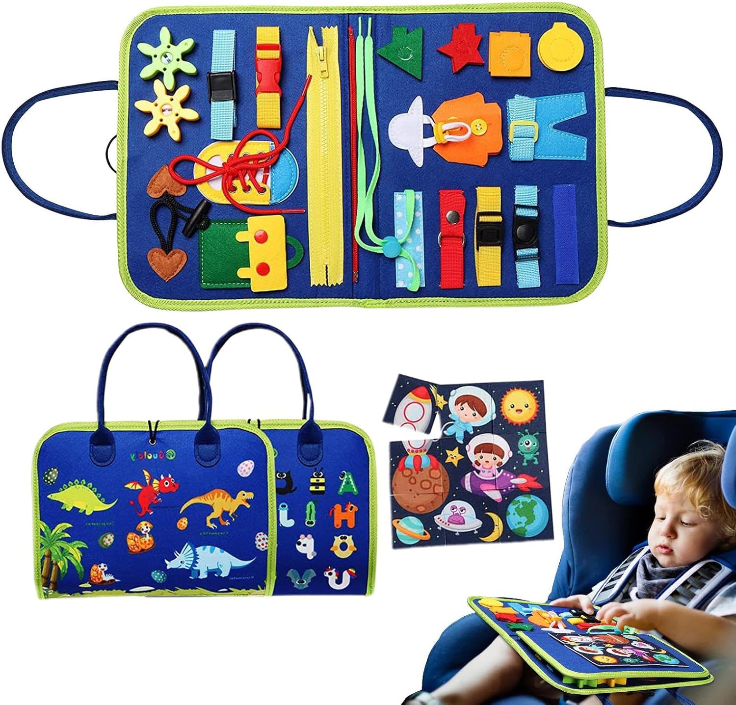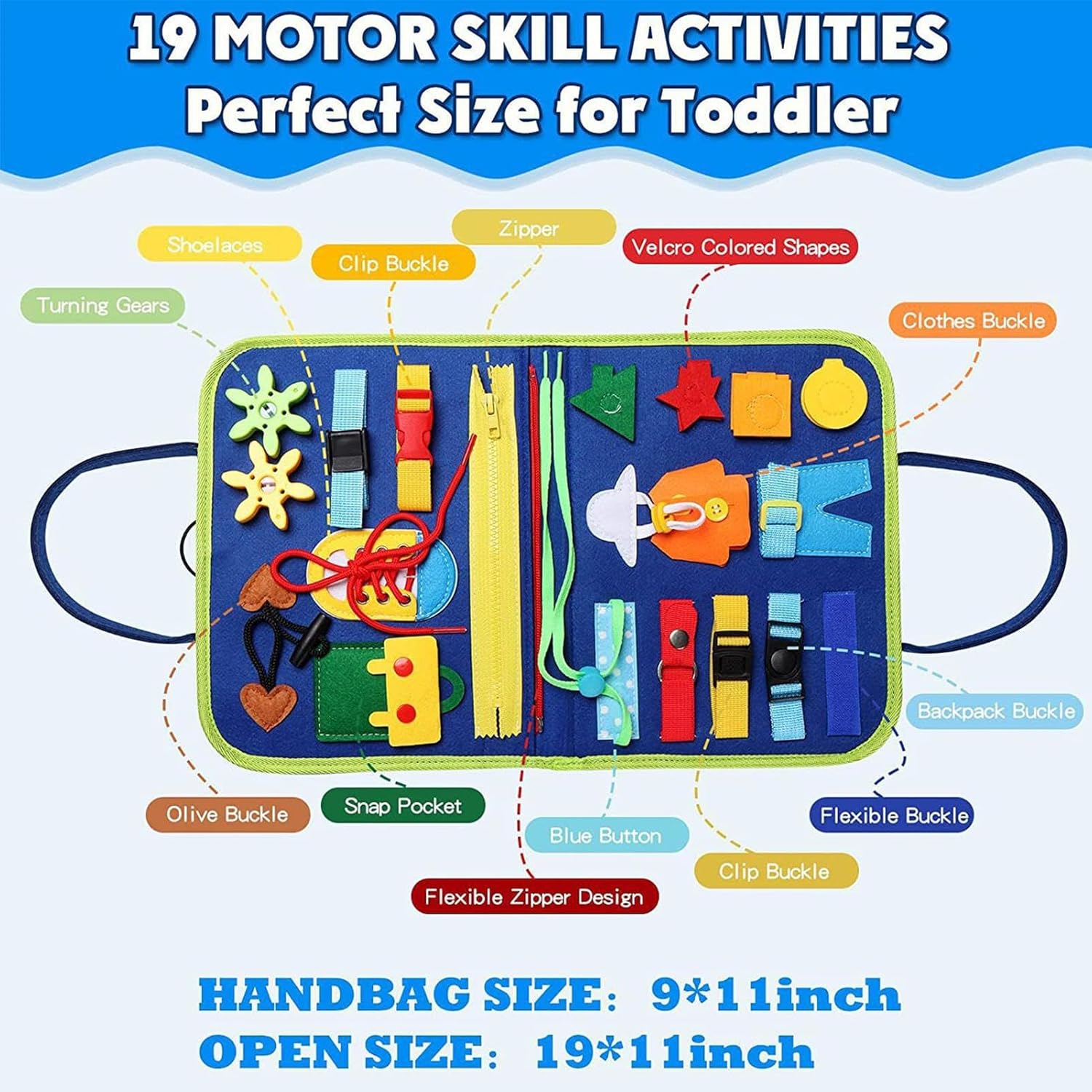 Molteplici funzioni: fornisce una vasta gamma di funzioni educative e divertenti che aiutano l'apprendimento, con 6 attività coinvolgenti che aiutano i bambini a concentrarsi e promuovere il gioco individuale e di team building, rendendolo un'aggiunta di apprendimento multifunzionale. Protect Kids: il libro delle attività per bambini piccoli è realizzato con materiale in feltro sicuro e resistente, progettato e realizzato con molta cura per proteggere le piccole mani dai danni Attività sensoriali multiple - Questo libro di attività per bambini piccoli è progettato per migliorare le capacità motorie e coordinamento e consentire ai bambini di fare bene a vestirsi, allacciare, avere lacci, tempo di apprendimento e data, fornendo una gamma più ampia di opportunità di apprendimento per far avanzare il loro sviluppo delle abilità. Design compatto: questo libro di attività per bambini piccoli offre un funzionamento e una manipolazione facili per i bambini, assicurando che possano completare delicatamente tutte le attività. Con un design compatto, consente una presa e un'incollatura precisi dei pezzi, riducendo il rischio di deglutizione e promuovendo un'esperienza di apprendimento sicura Facile da trasportare: il bambino rimarrà impegnato per ore con il design portatile di questo libro di attività per bambini piccoli. Si adatta facilmente alla maggior parte delle borse in tessuto, il che lo rende perfetto per passeggiate in auto e viaggi in aereo. Fai divertire il tuo bambino e imparare all'aperto con questo libro di attività facile da trasportare