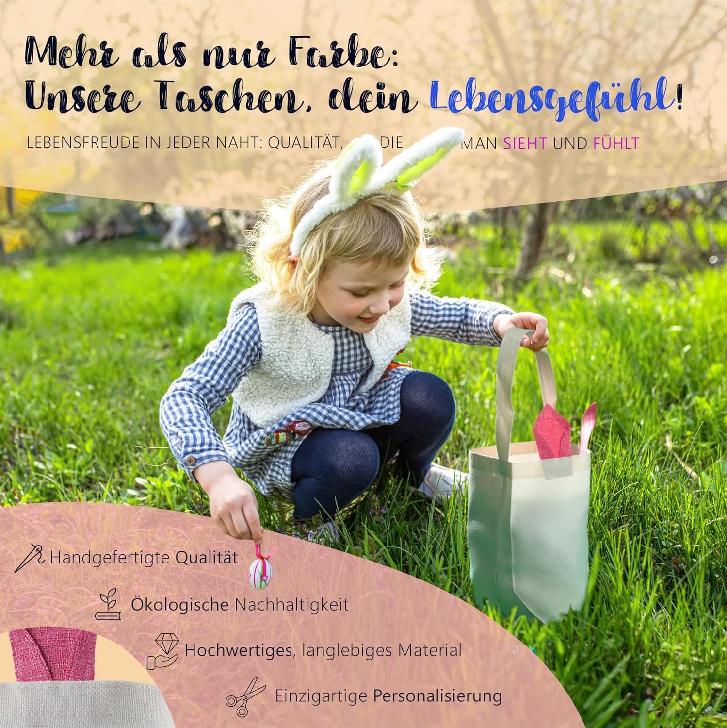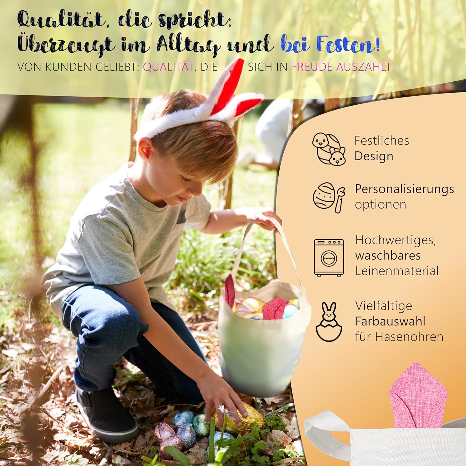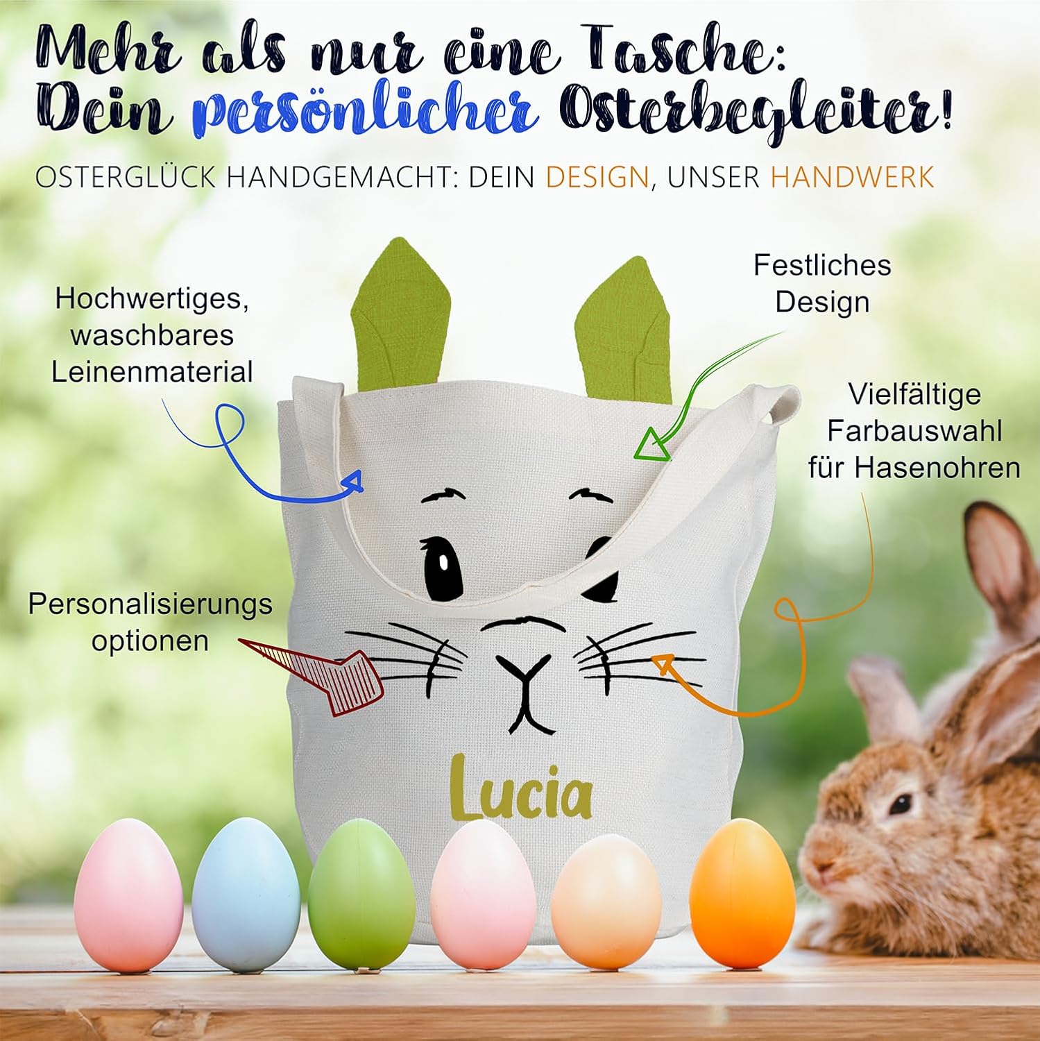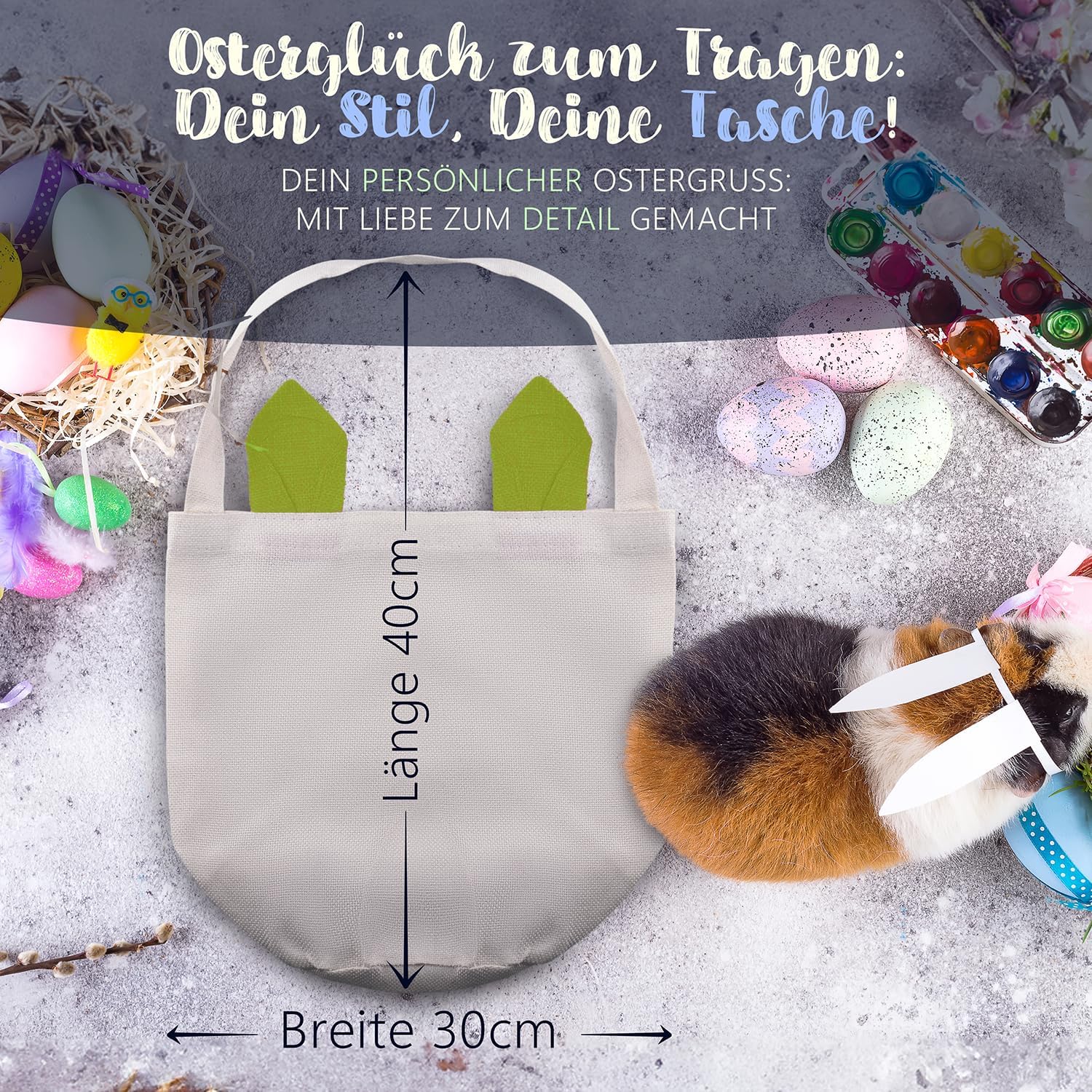 Facilmente personalizzabile - Alternativa ideale al cestino pasquale personalizzato con i nomi dei bambini, della famiglia o degli amici, per un tocco particolarmente personale. Basta fare clic su "Personalizza ora" e inserire il nome desiderato. Simpatiche orecchie da coniglio - Le simpatiche orecchie con interno colorato conferiscono al sacchetto di Pasqua un aspetto adorabile e aiutano i bambini a trovare il nido di Pasqua in giardino. Perfetti come sacchetti pasquali da riempire e come bellissima decorazione pasquale. Spazio sufficiente per le uova di Pasqua - Con le sue dimensioni di 40 x 30 cm il sacchetto di Pasqua offre spazio sufficiente per gli auguri di Pasqua in cioccolato, dolci pasquali e altre piccole cose pasquali del coniglietto pasquale. Ideale come borsa pasquale e borsa pasquale. Lavorazione di alta qualità: il sacchetto pasquale è realizzato con materiali di alta qualità e lavorato con cura. È durevole e resistente, il che lo rende un compagno duraturo per le imminenti celebrazioni pasquali con la tua famiglia. Facilmente riponibile: una volta ripiegata e ripiegata, la graziosa borsa in tessuto non occupa quasi spazio e può essere utilizzata come graziosa decorazione o divertente borsa regalo anche dopo Pasqua.