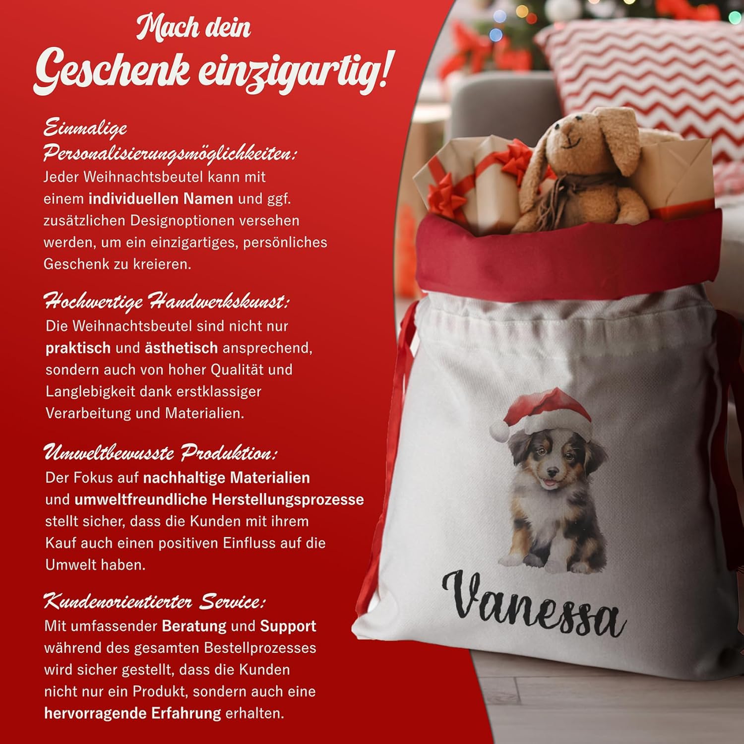 Perfetto per Natale: rendi la celebrazione dell'amore ancora più personale con la nostra speciale borsa natalizia con cordoncino, ideale come borsa per Babbo Natale o confezione regalo originale che fa risaltare ogni regalo. Stampa personalizzata del nome: dai un tocco personale ai tuoi regali! La nostra borsa in juta può essere facilmente personalizzata con il nome dei tuoi cari, perfetta per dolci, regali o tradizionali regali per San Nicola. Versatile e pratico: Non solo un sacchetto di iuta, ma un amorevole sacchetto regalo che puoi riempire tu stesso, che trasforma ogni piccolo gesto in un grande regalo del cuore. Un accessorio indispensabile per le feste! Sacchetti regalo di qualità: realizzati con materiali di alta qualità, i nostri sacchetti offrono la confezione regalo riutilizzabile perfetta che unisce tradizione e consapevolezza ambientale e porta gioia ogni anno. Il tuo sacchetto di Natale personalizzato sarà preparato immediatamente e sarà con te entro soli 1-2 giorni lavorativi grazie alla nostra consegna affidabile. Giusto in tempo per condividere la gioia delle feste!