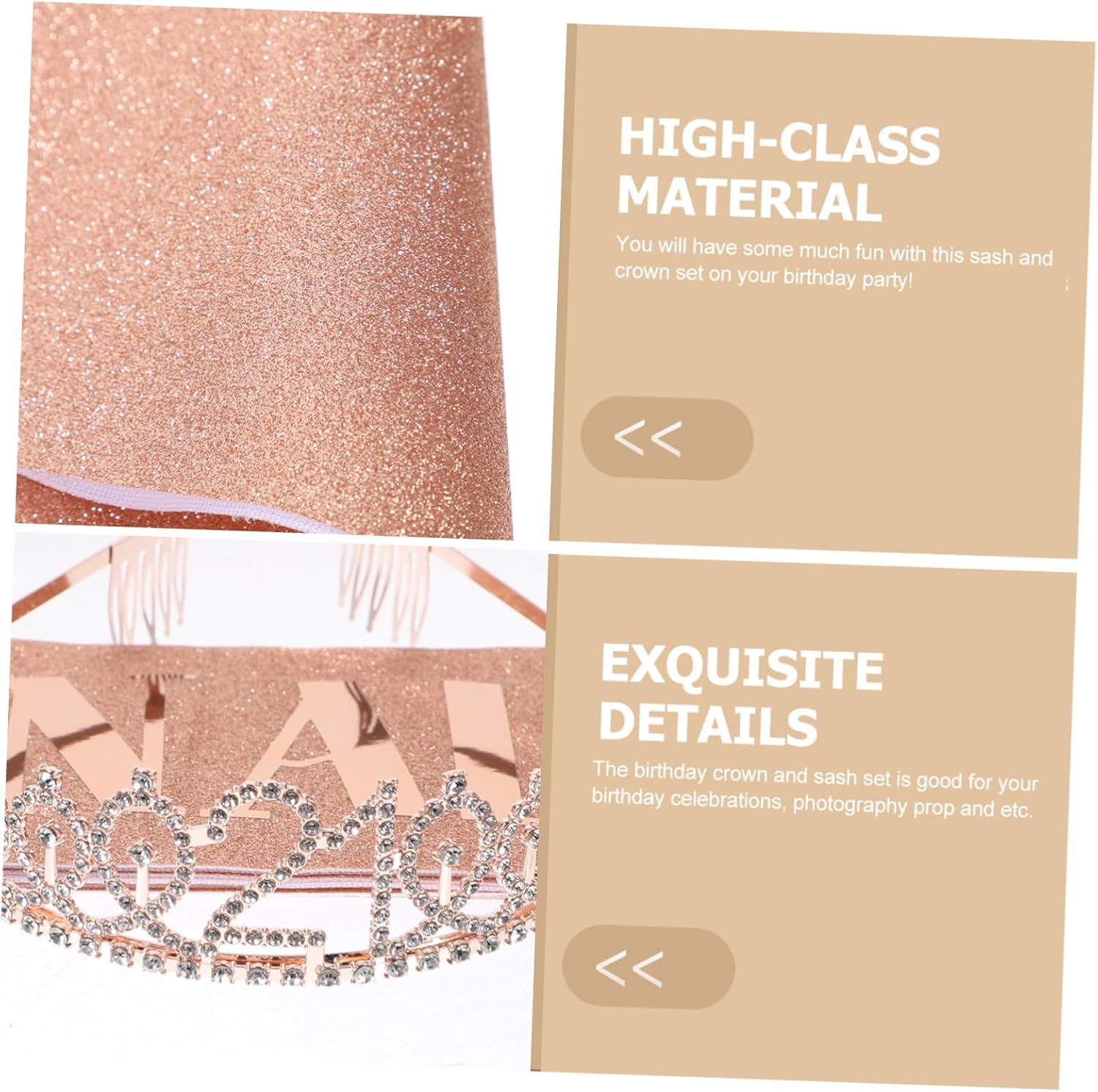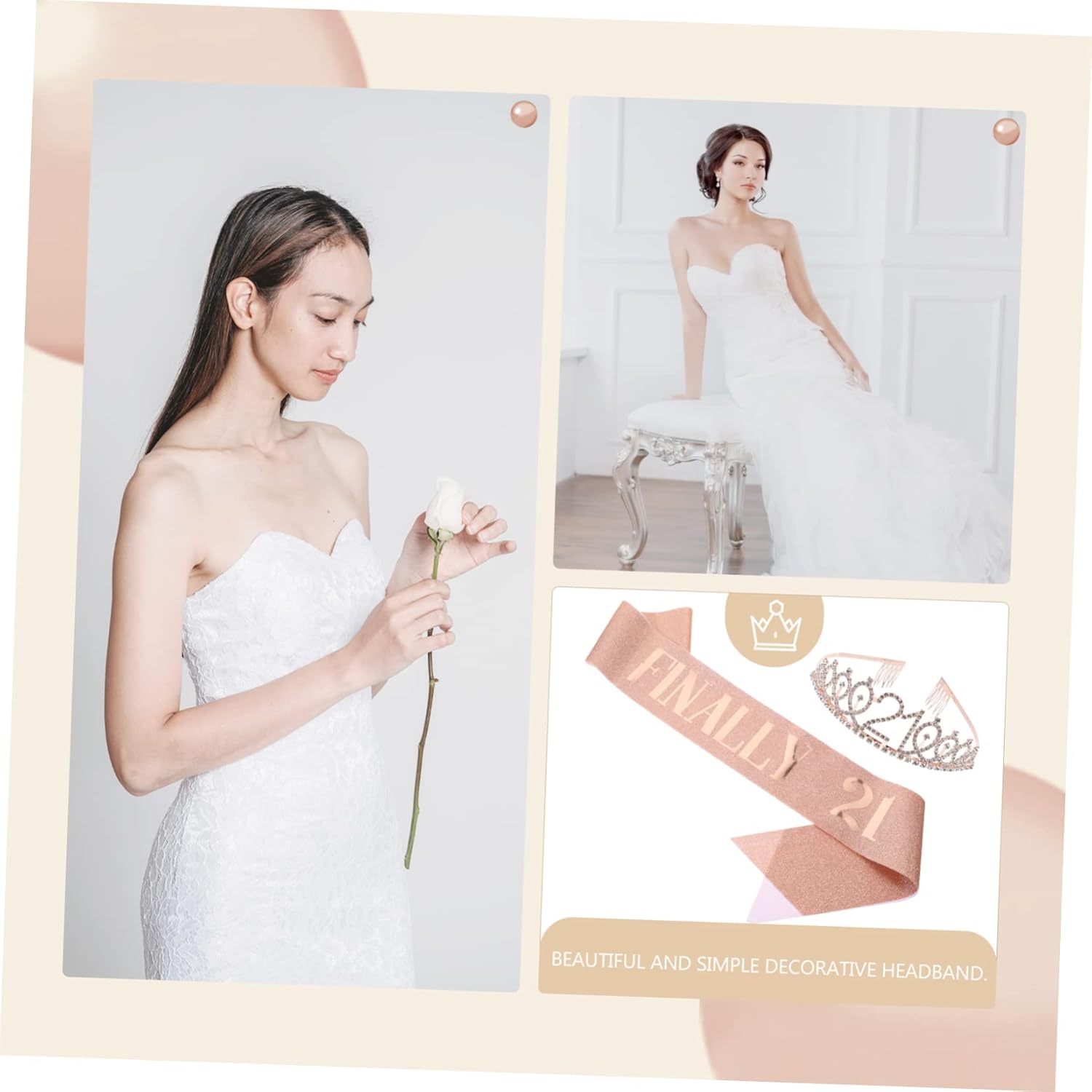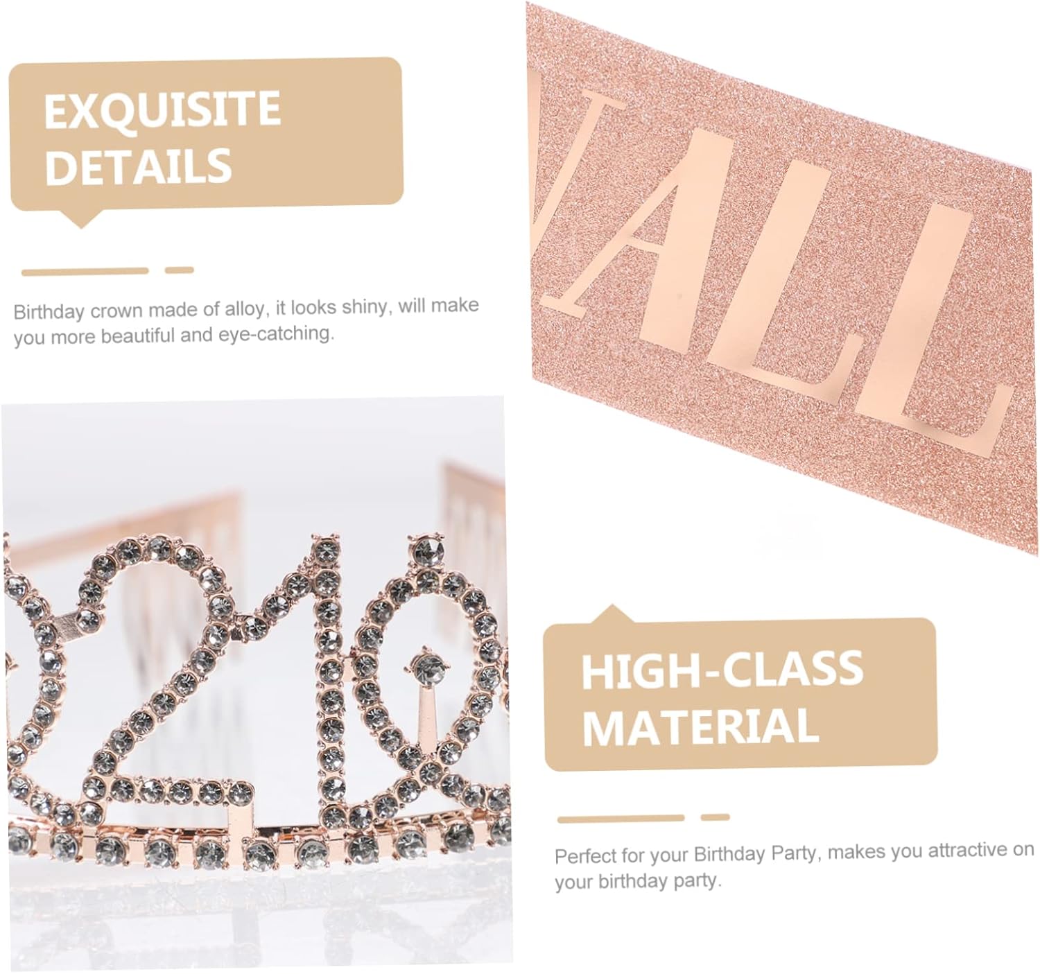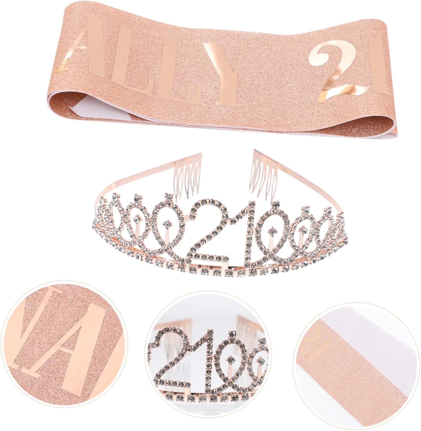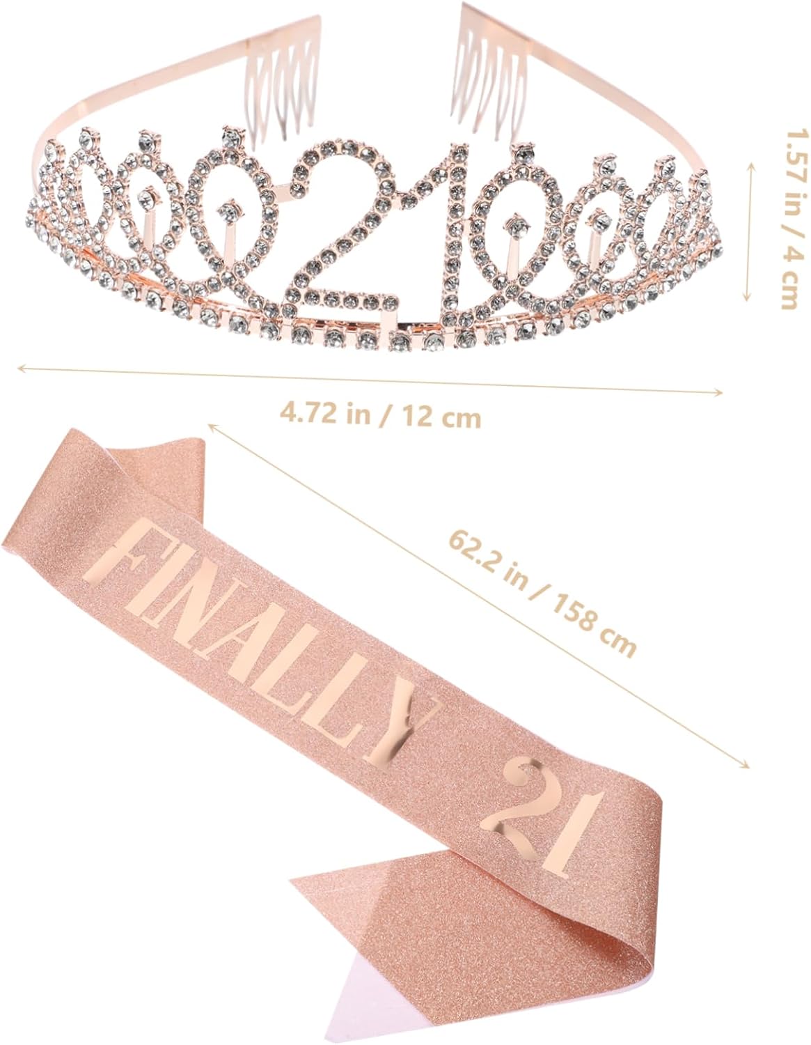 Il pacchetto include 1 fascia 1 tiara Caratteristiche -Materiale: cintura in tessuto per galateo di compleanno - Dimensioni: 158,00X9,50X0,20 cm/62,09X3,73X0,08 pollici Decorazione per il 21° compleanno per le donne -Colore: diademi in oro rosa per ragazze - Dimensioni: 14,00X12,00X4,00cm/5,50X4,72X1,57 pollici corone per donne - Fascia perfetta per la festa di compleanno di una bambina, ti renderà attraente per il tuo 21° compleanno. -Una scelta impressionante come di compleanno per le tue donne, le tue famiglie o le tue amiche per dimostrare la tua preoccupazione e il tuo affetto: fascia di compleanno per ragazze. -La tiara e la fascia metteranno in risalto il tuo aspetto, rendendoti più affascinante e facendoti distinguere tra le ragazze che partecipano alla festa di compleanno. - Puoi usarli per scattare foto più e lasciare ricordi più indimenticabili con i tuoi accessori per foto di compleanno. -Realizzata con materiali di qualità, pratica e adatta per la fascia di compleanno delle bambine. Descrizione della merce Fascia di compleanno per ragazze. È perfetta per feste di compleanno, ecc. Corone per compleanno. Il design speciale ti renderà il punto focale in tutte le occasioni. Forniture per feste di 21° compleanno. Queste sono fasce e tiare per feste di compleanno alla moda. Accessori per foto di compleanno. Questa fascia dal design speciale, che può creare un divertimento speciale alla tua festa. Decorazione di 21° compleanno per donne. Un accessorio perfetto per la festa di compleanno delle ragazze.