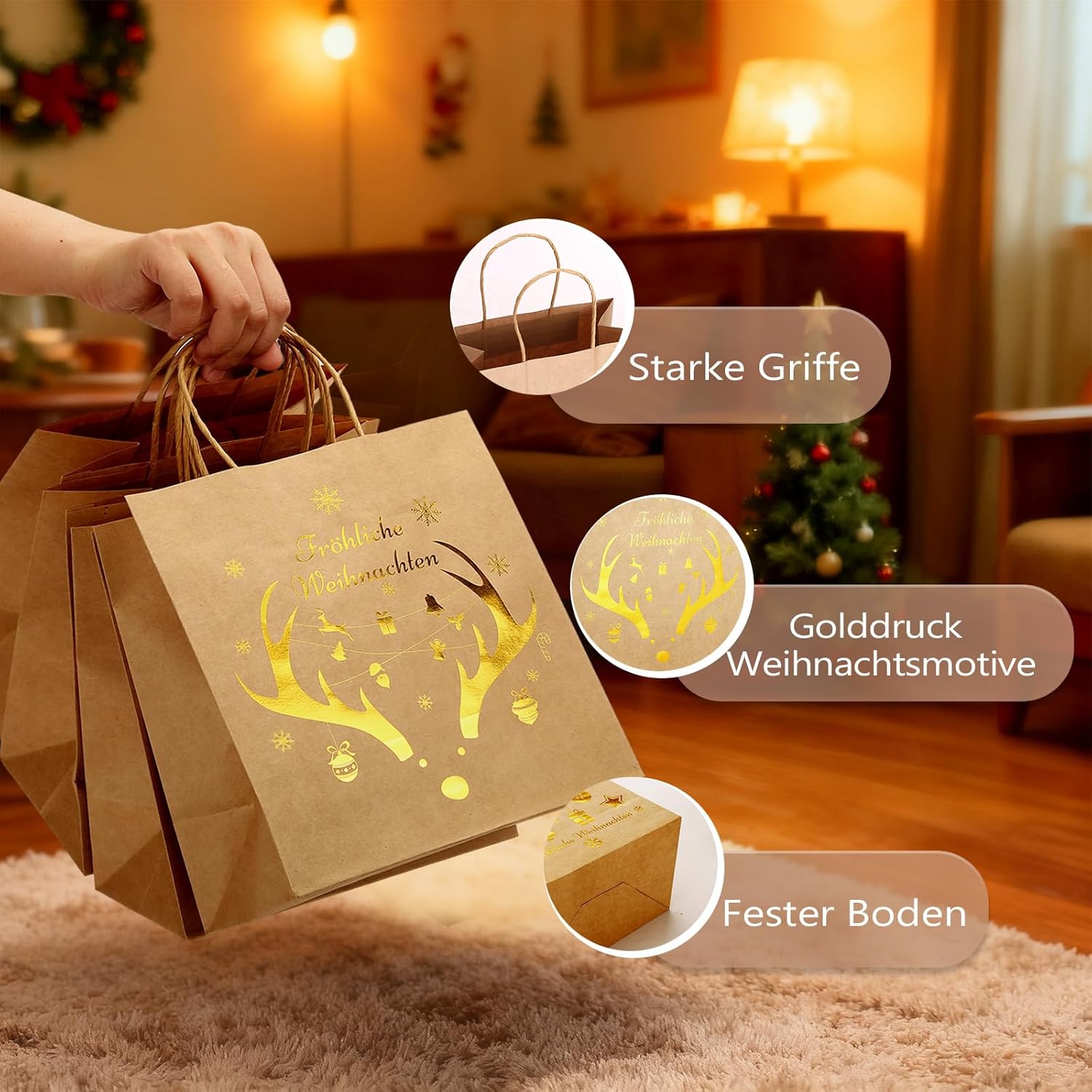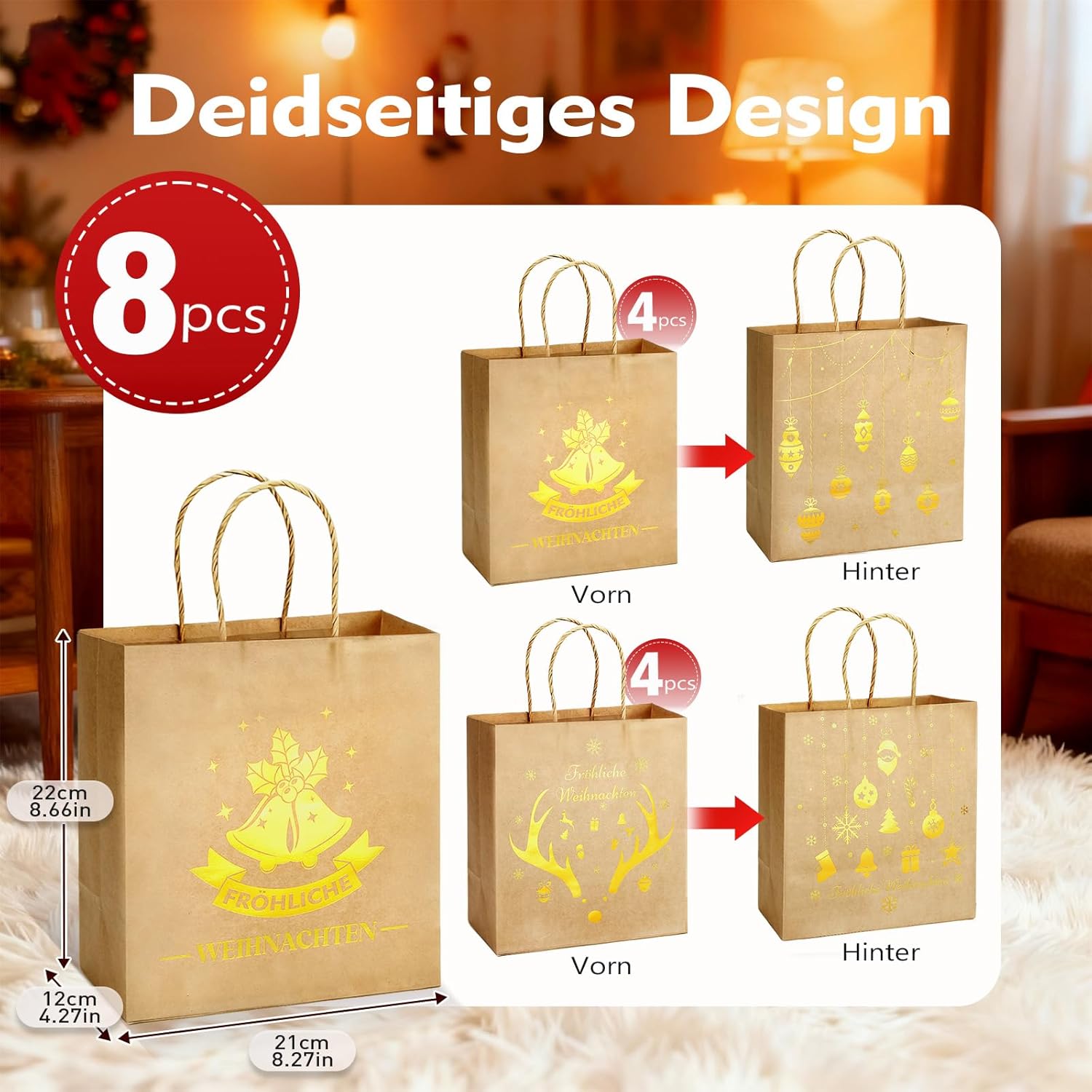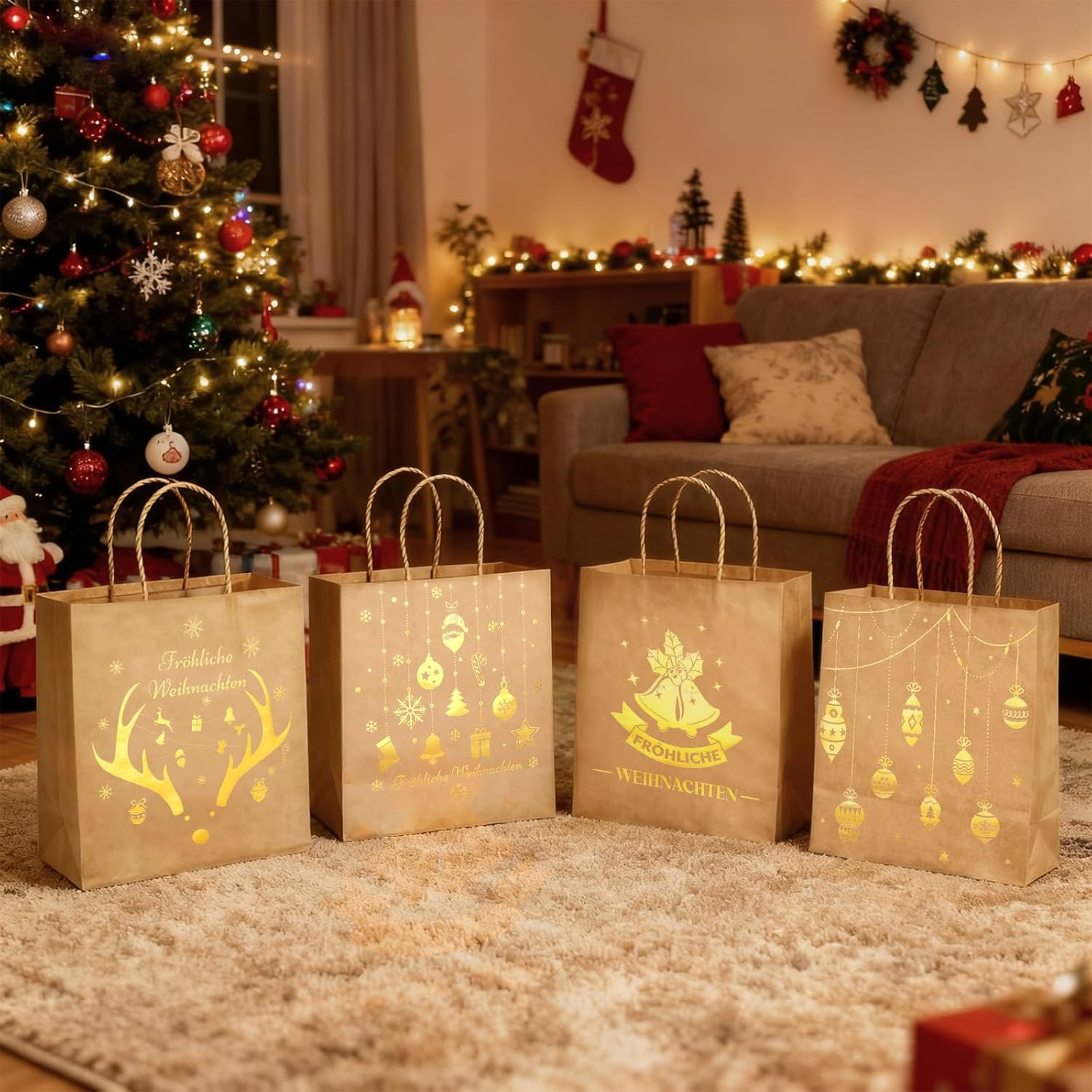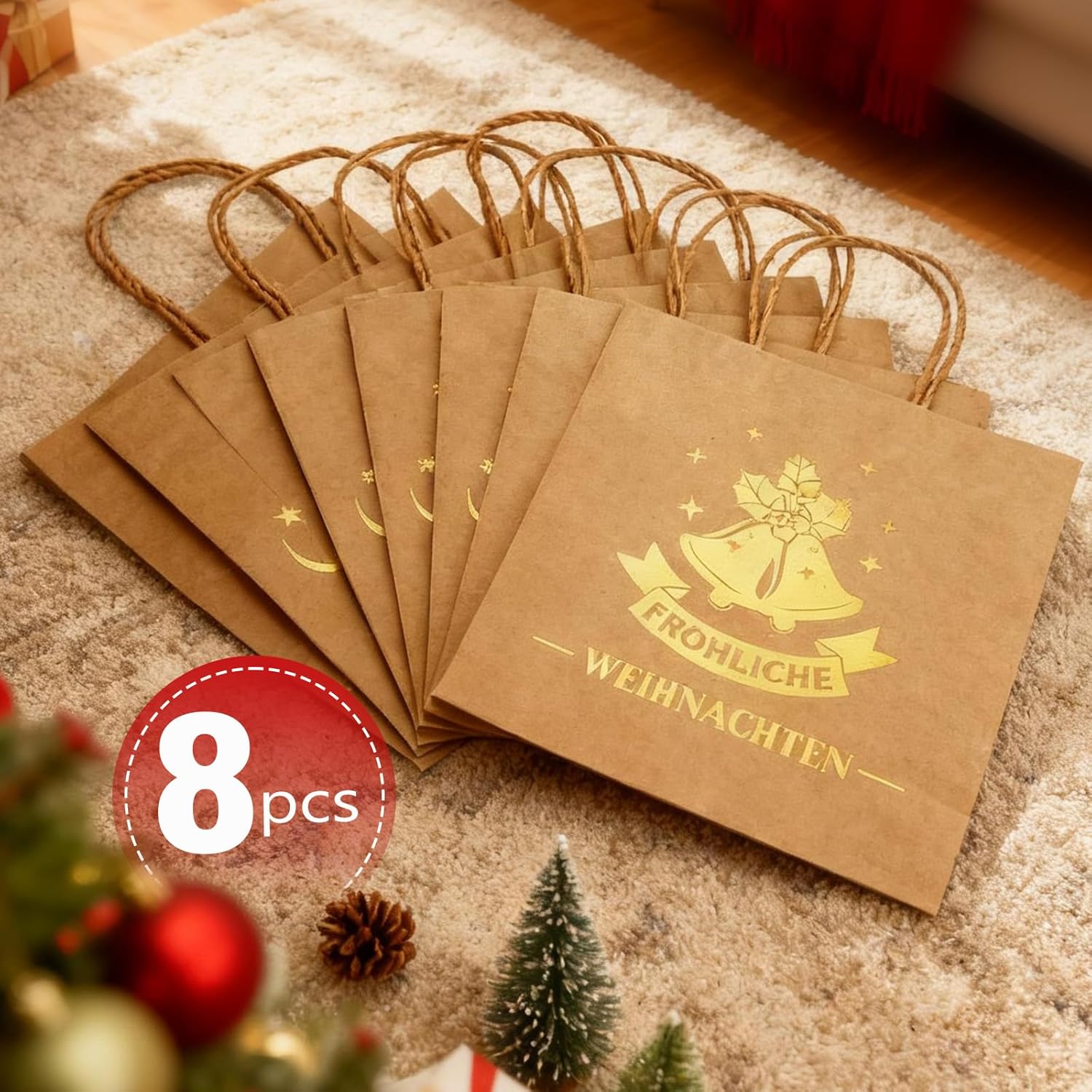 DUE DISEGNI UNICI A DOPPIO LATO: questo set contiene 2 diversi design festivi (4 sacchetti per modello), con ciascun disegno stampato su entrambi i lati per un doppio impatto. Utilizza una varietà di opzioni di design: combina i motivi per presentazioni regalo personalizzate che coprono diverse preferenze e occasioni. Set completo: questa pratica confezione risparmio contiene 8 ampi sacchetti regalo (22x21x12 cm). La generosa capacità offre spazio per una varietà di regali - dai dolci festivi ai comodi maglioni ed è la soluzione di imballaggio ideale per tutte le occasioni Eccellente confezione regalo: I nostri sacchetti regalo sono stampati su entrambi i lati con eleganti motivi di corna di renna, campanelle, fiocchi di neve e altri motivi natalizi, Il saluto festivo "MERRY CHRISTMAS" aggiunge un tocco caldo e fa risaltare i tuoi regali Dettagli del prodotto: Realizzati in robusta carta kraft, questi sacchetti regalo sono portanti e dimensionalmente stabili. I manici intrecciati sono morbidi ma robusti, proteggono le mani durante il trasporto e offrono una presa comoda. Il materiale cartaceo riutilizzabile enfatizza la praticità. Versatili per regali e altro ancora: progettate con un look elegante, queste borse sono adatte a una varietà di usi. Ideale per presentare regali di Natale, come decorazione festiva per le feste o anche per lo shopping quotidiano