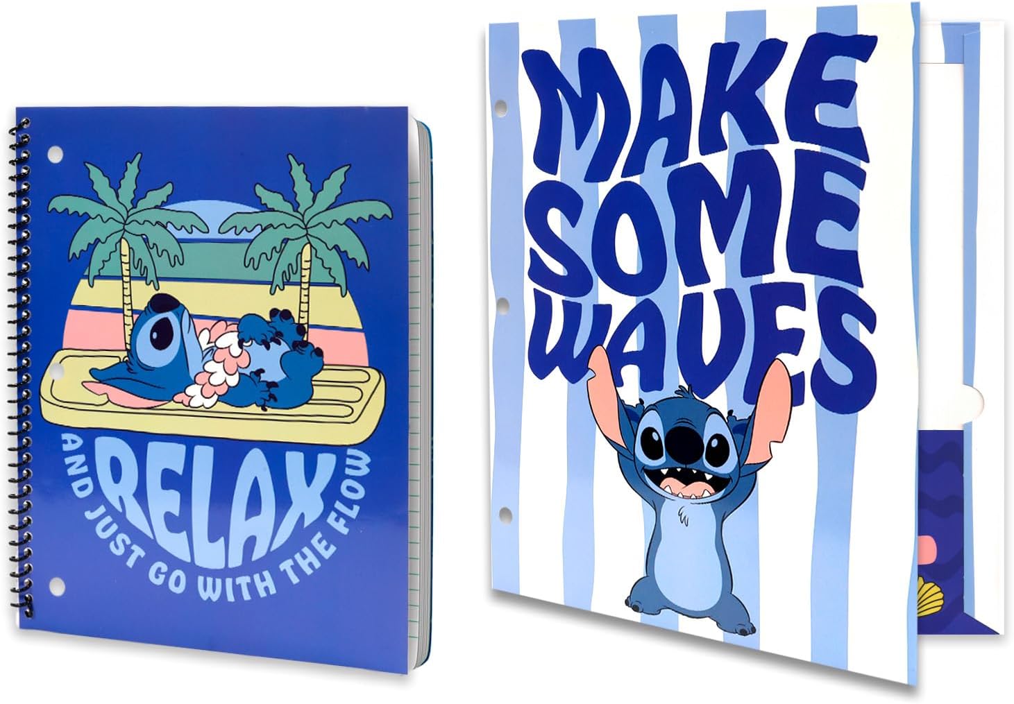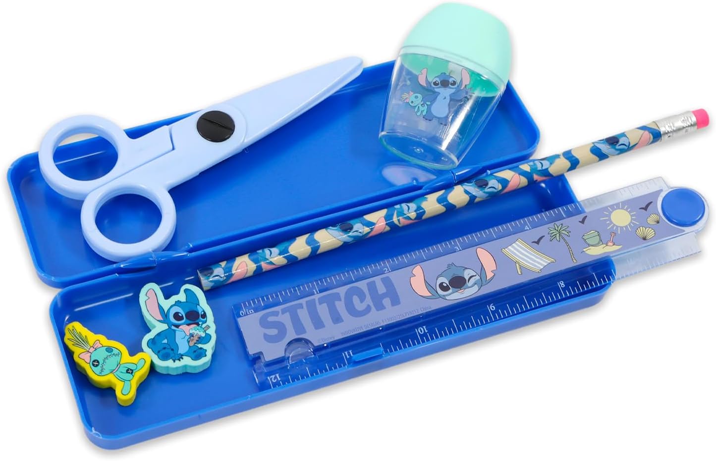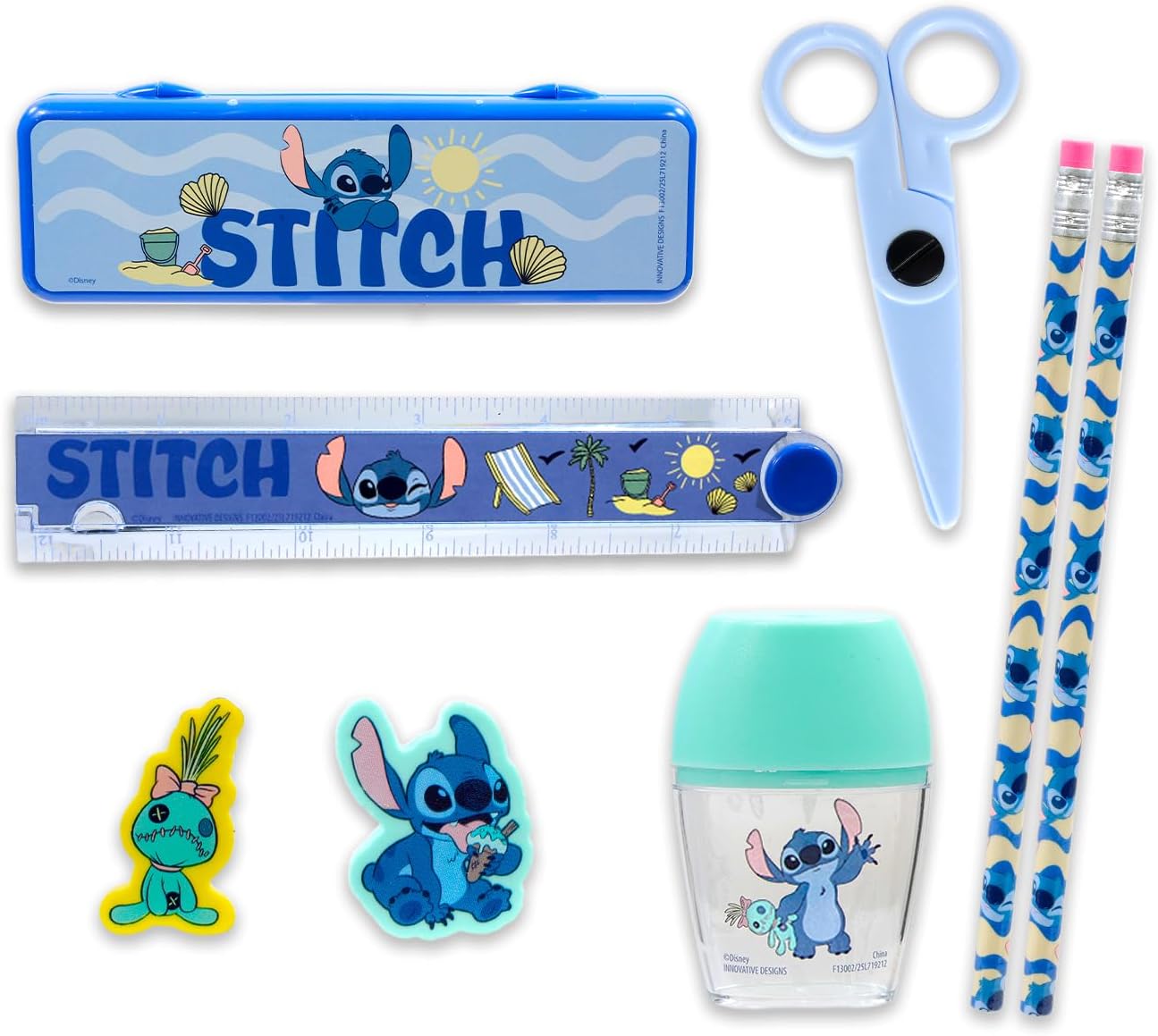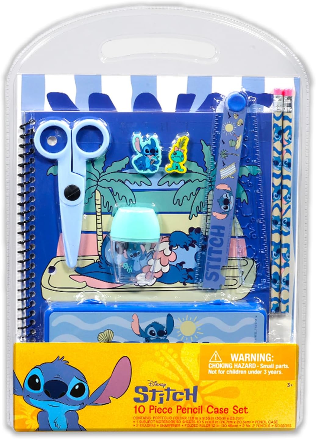 Lilo & Stitch - Set di forniture scolastiche - Bundle con cartella Disney Stitch, quaderno, matite, tatuaggi e altro ancora | Stitch Back to School Supplies. Questo set Disney per il ritorno a scuola include tutto il necessario per essere pronti per la classe con l'alieno preferito di tutti, Stitch. Include una cartella portfolio Stitch, un quaderno da 70 fogli, un astuccio, un temperamatite, un righello piegato, 2 matite, una matita tortuosa e forbici. Disney Il set di forniture scolastiche include anche tatuaggi Stitch, segnalibro Alice nel paese delle meraviglie e un gancio per porta Beach Kids: perfetto come premi Disney e tatuaggi motivazionali, forniture per la classe e set per il ritorno a scuola. Tutti i prodotti scolastici Disney Lilo e Stitch sono ufficialmente autorizzati per ragazze e ragazzi. Età minima del produttore: dai 3 anni in su.