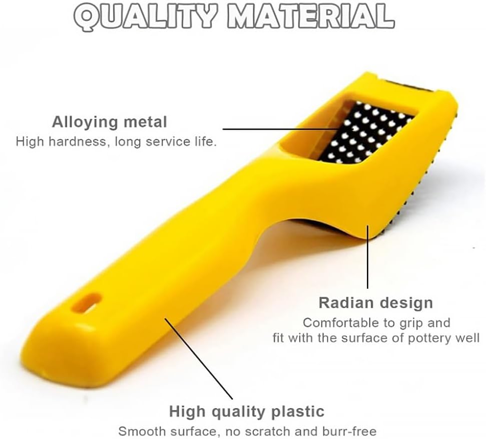 Ampio utilizzo: strumento versatile per modellare, tagliare e decorare argilla e ceramica, ideale per diradare lastre e riparare corpi in argilla. Manico ergonomico: impugnatura comoda per uso prolungato senza affaticare la mano, facile da pulire per garantire durata e prestazioni. Uso semplice: lama con denti piccoli che rimuovono facilmente l'argilla scorrendo avanti e indietro sulla superficie lavorata. Leggero e portatile: corpo in polipropilene compatto e resistente, facile da trasportare ovunque per i tuoi progetti artistici. Robusto e durevole: materiali premium garantiscono lunga durata e resistenza all'uso frequente, compagno affidabile per ceramisti.