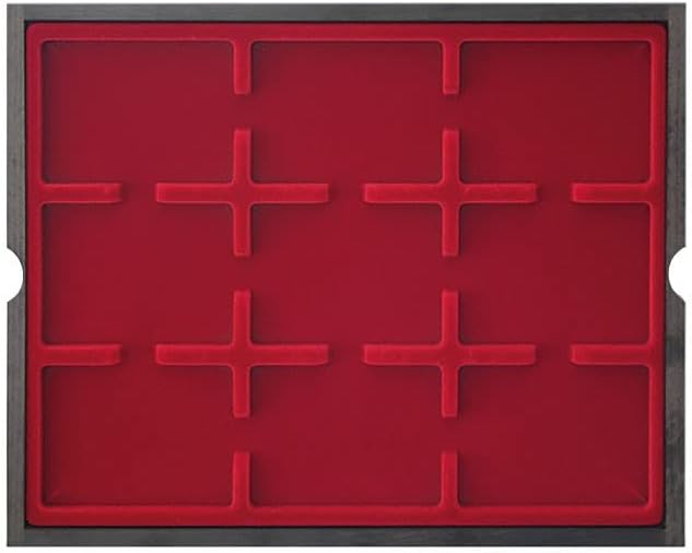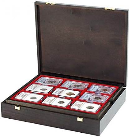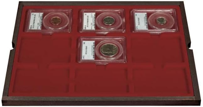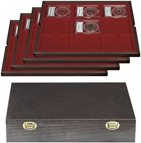 Cassetta in vero legno con 4 vassoi e inserti per monete rosso scuro, ciascuno con 9 scomparti rettangolari. Gli inserti per monete sono ricoperti da un fiocco di velluto di alta qualità. Formato: 325 x 265 x 65 mm. PRODOTTO IN GERMANIA. Adatto per capsule portamonete USA (slab) fino al formato 63x85 mm.