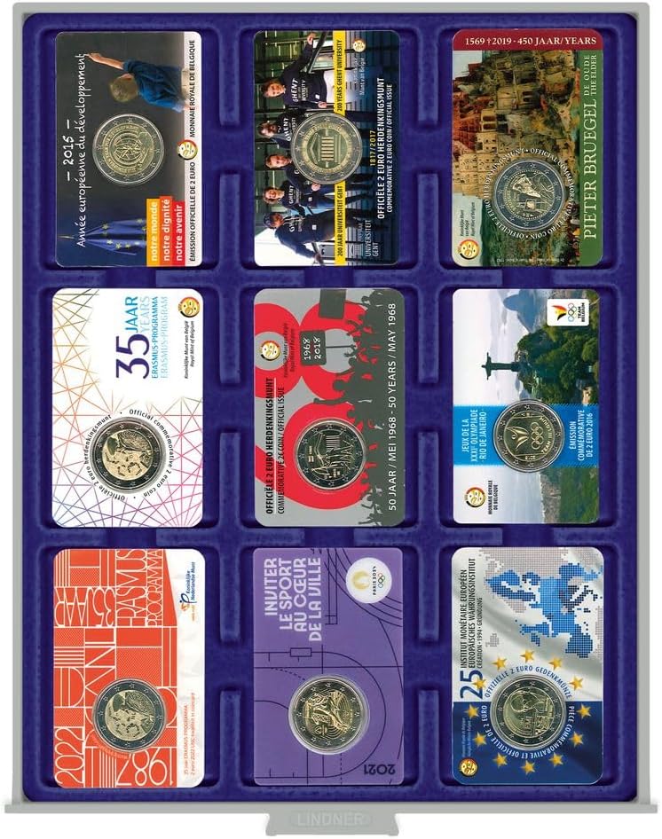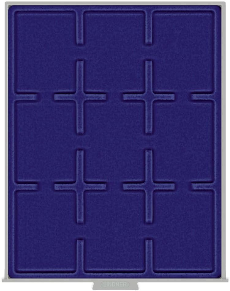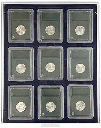 Gettoniera con cassetto grigio chiaro e cornice trasparente. Portamonete blu scuro con 9 scomparti rettangolari. Formato: altezza 20 mm, larghezza 236 mm, profondità 303 mm. L'inserto per monete è rivestito con un fiocco di velluto blu scuro di alta qualità. Adatto per capsule portamonete USA (slab) fino al formato 63x85 mm.