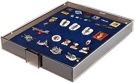 Box da collezione con cassetto in effetto vetro fumé e cornice trasparente. Inserto in schiuma blu con superficie vellutata/Max. altezza di riempimento ca. 15 mm. Formato: altezza 40 mm, larghezza 236 mm, profondità 303 mm. Adatto per PIN/medaglie/badge.