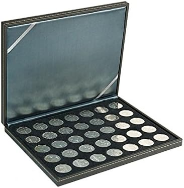 Cassetta portamonete con superficie nera granulata in elegante similpelle e leggere cuciture decorative. Cuscino coperchio color antracite. Con inserto portamonete nero con 35 pozzetti rotondi. L'inserto per monete è ricoperto da un fiocco di velluto di alta qualità. Formato: 298 mm x 243 mm x 35 mm. Adatto per monete con un diametro di 32,5 mm, ad es. per monete tedesche da 20 euro o 10 euro in argento.