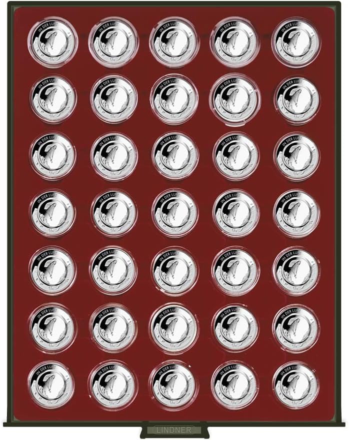 Gettoniera con cassetto in effetto vetro fumé e cornice trasparente. Inserto per monete rosso scuro con 35 rientranze rotonde. Formato: altezza 20 mm, larghezza 236 mm, profondità 303 mm. L'inserto per monete è ricoperto da un fiocco di velluto rosso scuro di alta qualità. Inclusa una confezione da 10 capsule per monete da collezione da 10EUR (articolo n. 2250029P).