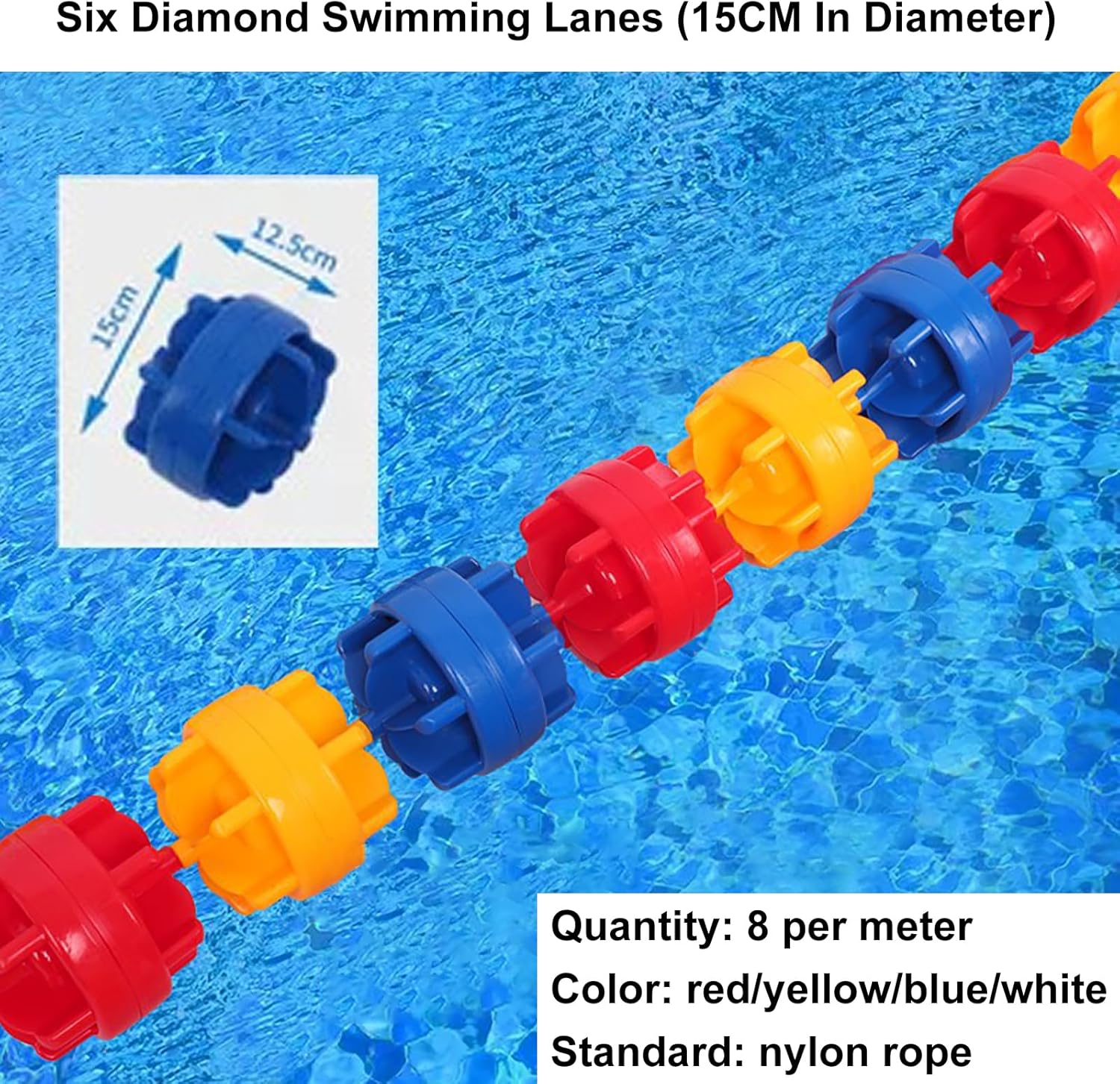 Materiale durevole: robusto e durevole abbastanza da resistere alle sollecitazioni dell'uso in piscina. Non si crepa né sbiadisce a causa del sole o della pioggia e sono costruiti per durare. Migliora la sicurezza in piscina: separa le zone con acque basse da quelle con acque profonde, impedendo ai nuotatori giovani e inesperti di accedere alle zone con acque profonde. Corsie sicure e chiare: le boe sui delimitatori di corsia sono colorate e ben visibili in acqua per una facile identificazione. Questo garantisce la sicurezza dei nuotatori e la visibilità delle corsie. Parametri del prodotto: la cima di sicurezza da 1 metro è composta da 8 boe, ciascuna lunga 12,5 cm e con un diametro di 15 cm. Le boe possono essere spostate o smontate. Ampia gamma di utilizzi: Particolarmente indicato per delimitare zone pericolose o corsie di nuoto, può essere utilizzato anche in grandi piscine come palestre, piscine private, oceanari, piscine panoramiche, ecc.