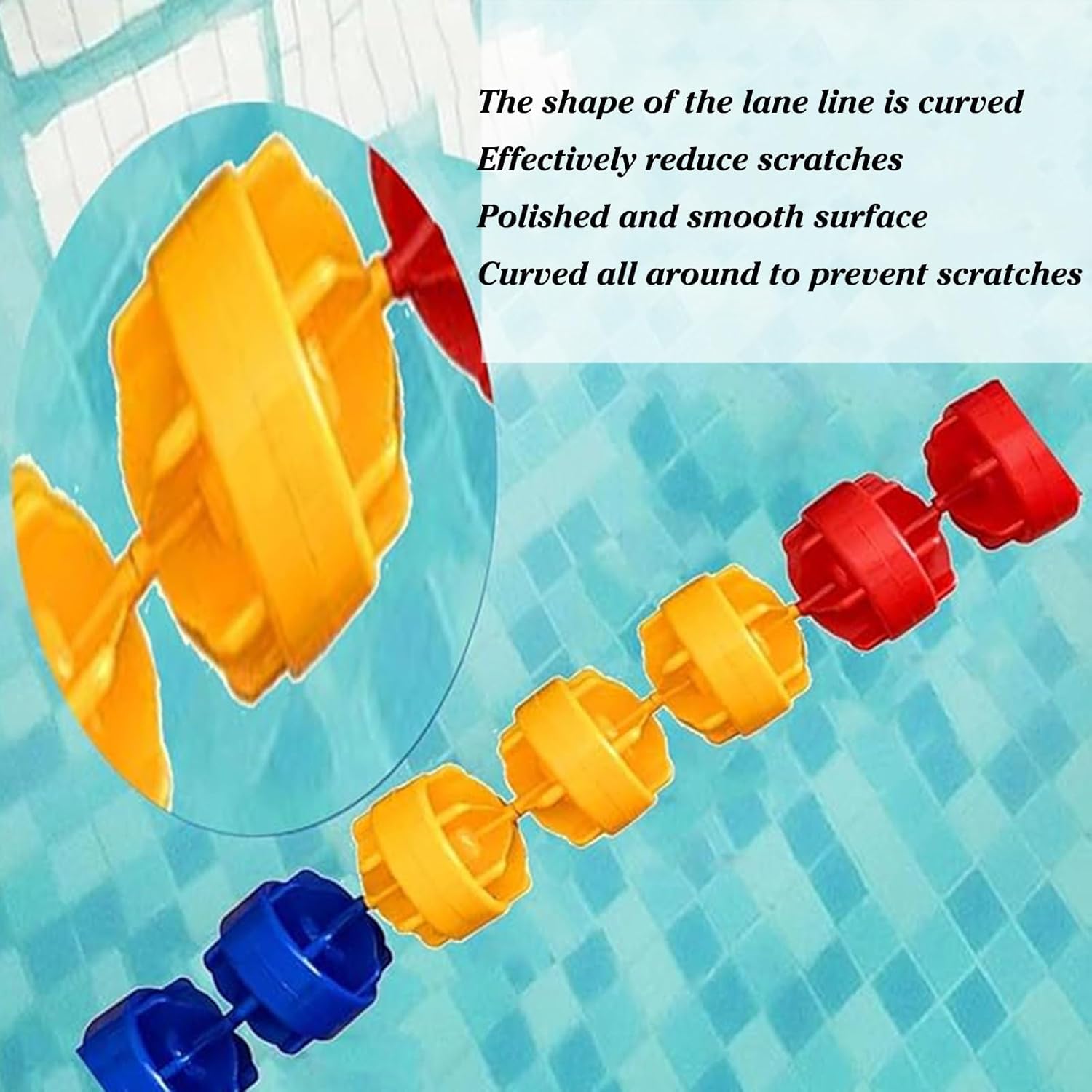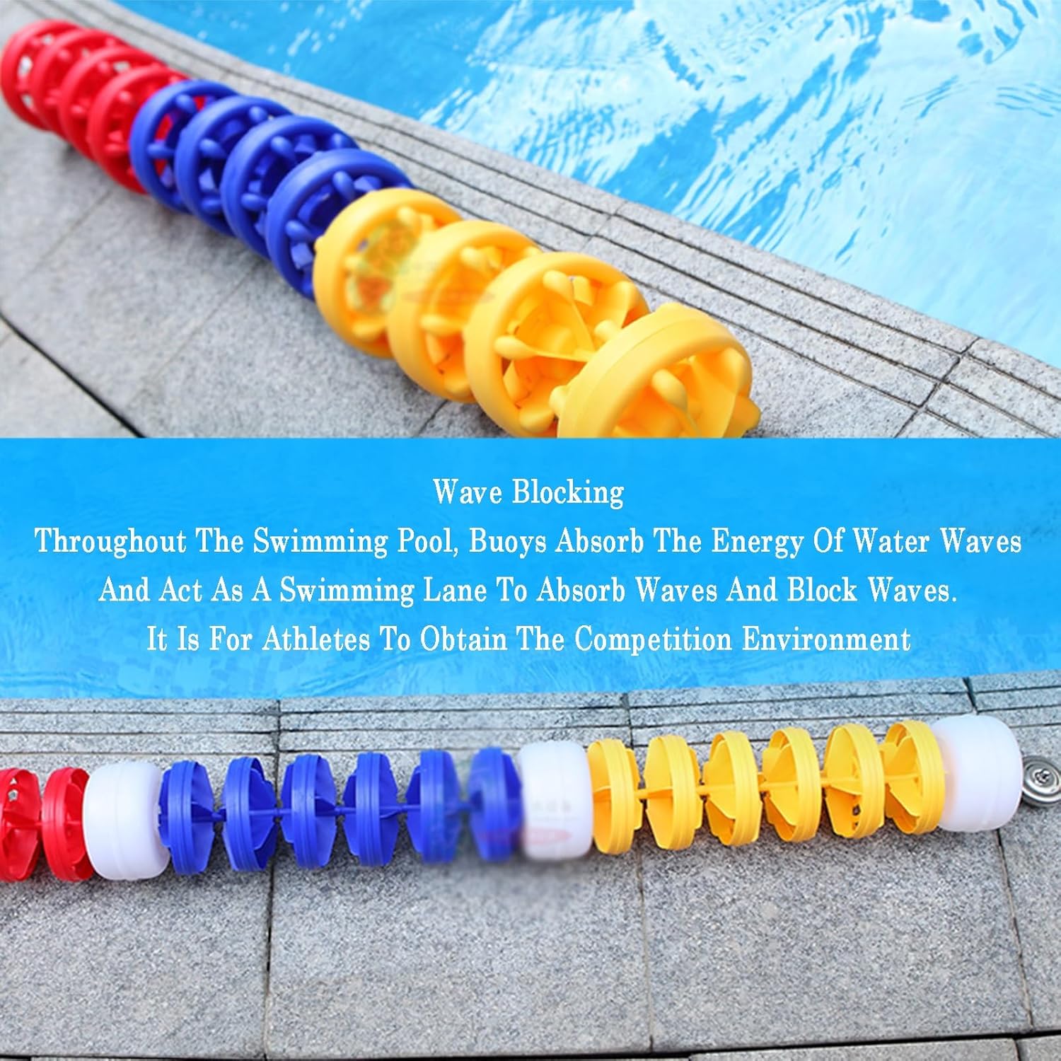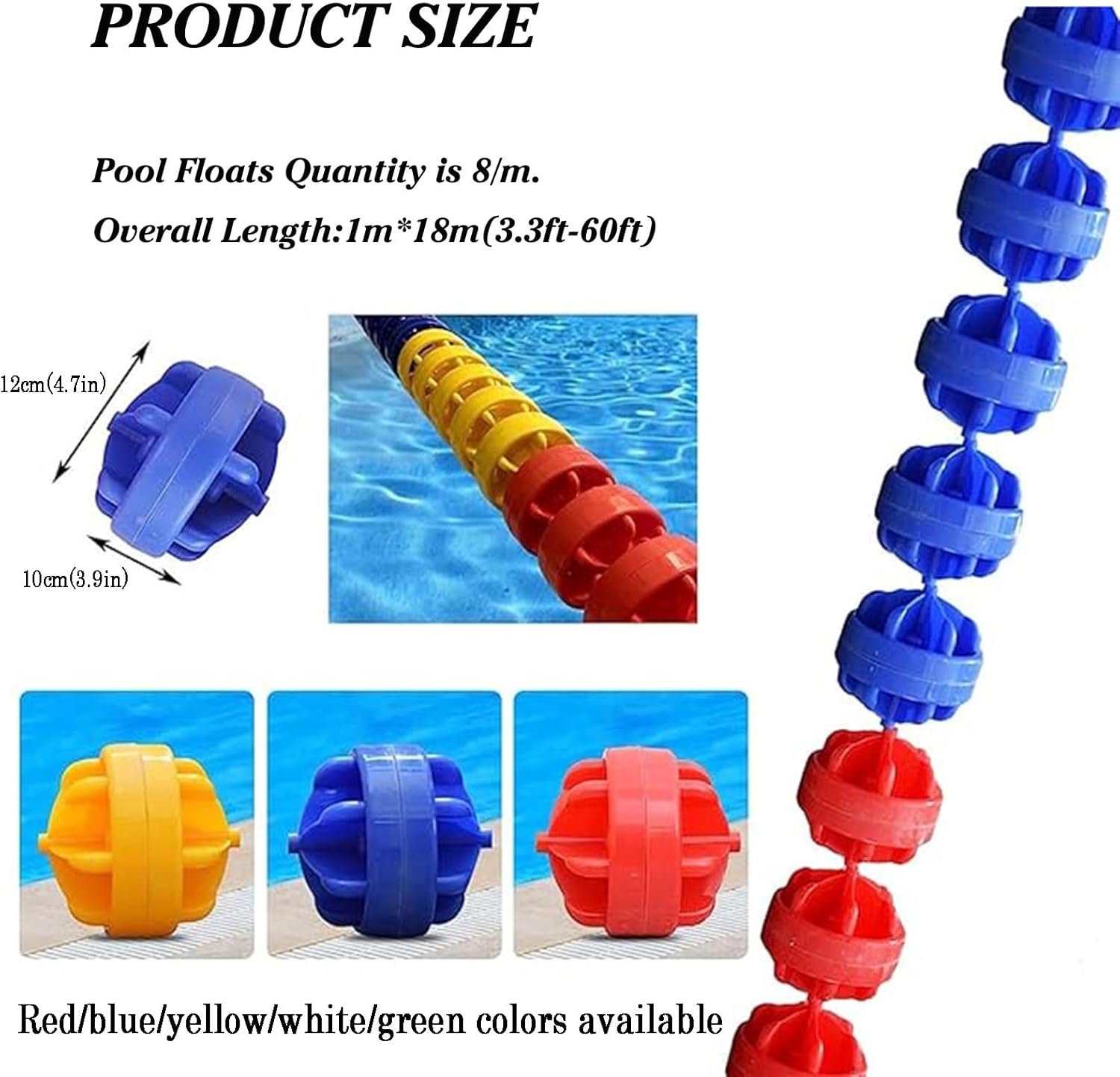 FACILE DA INSTALLARE E MANUTENZIONE: la nostra segnaletica per corsie della piscina è regolabile in lunghezza e semplice da installare, rendendone semplice l'installazione e la manutenzione. Design ad alta visibilità: le 8 boe per piscina hanno colori altamente visibili che sono chiaramente visibili anche da lontano. Ciò garantisce che la corda di sicurezza della piscina sia chiaramente visibile ai nuotatori, ricordando loro i confini e aiutando a prevenire collisioni o accessi non autorizzati in aree riservate della piscina. Parametri del prodotto: La linea di boe di sicurezza da 1 m/3,3 piedi ha 8 boe, ciascuna lunghezza della boa: 10 cm/3,9 pollici, larghezza: 12 cm/4,7 pollici. La corda può adattarsi alle tue esigenze e a quelle della piscina, mentre le boe integrate possono essere spostate per creare un'efficace percezione visiva per i nuotatori. Materiale durevole: le nostre corde di sicurezza preassemblate sono realizzate in nylon di alta qualità, che è resistente e durevole per resistere ai rigori dell'uso in piscina. Ma non si spezzeranno e non sbiadiranno a causa dell'esposizione alla luce solare e all'acqua e possono essere utilizzate per lungo tempo.