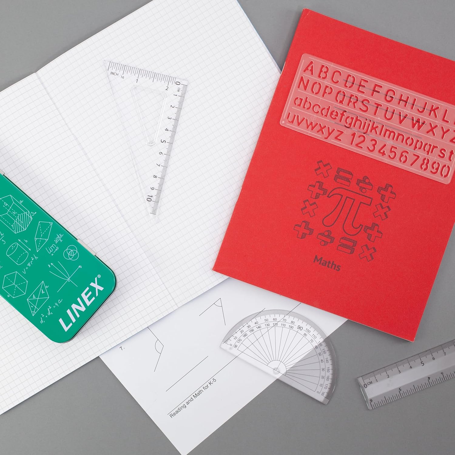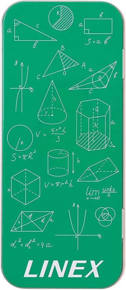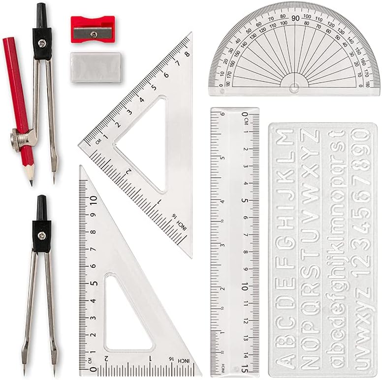 Set di geometria da 10 pezzi, ideale per la matematica Tradizionale scatola di metallo contenente bussola autocentrante e matita, divisore, righello da 15 cm, goniometro, 2 set quadrati, stencil, gomma e temperamatite Righello trasparente, goniometro, set quadrati e stencil consentono la visibilità del lavoro sulla pagina Tutto ciò di cui hai bisogno per avere successo nei tuoi esami di matematica Tutto posizionato ordinatamente in una scatola di metallo facile da trasportare