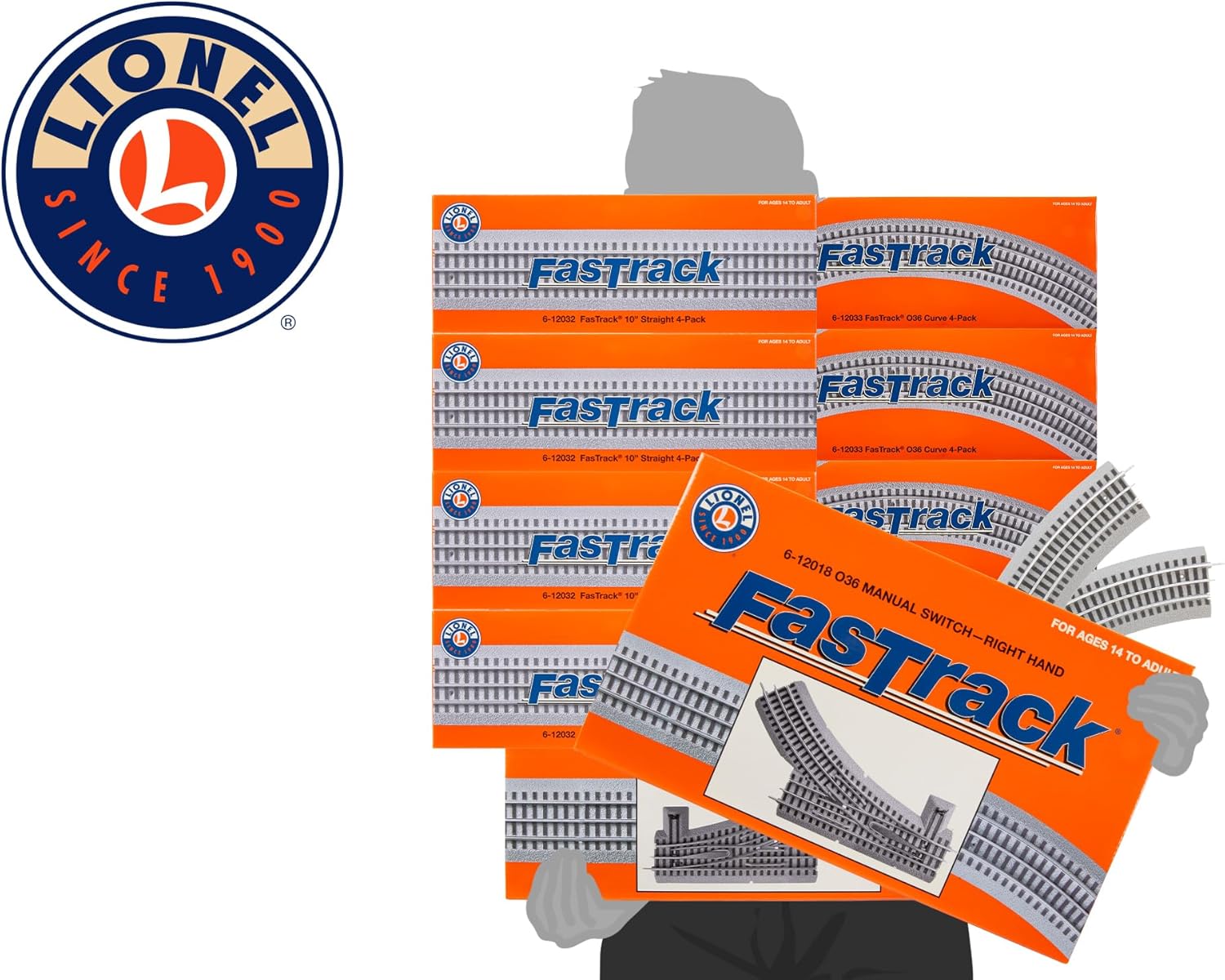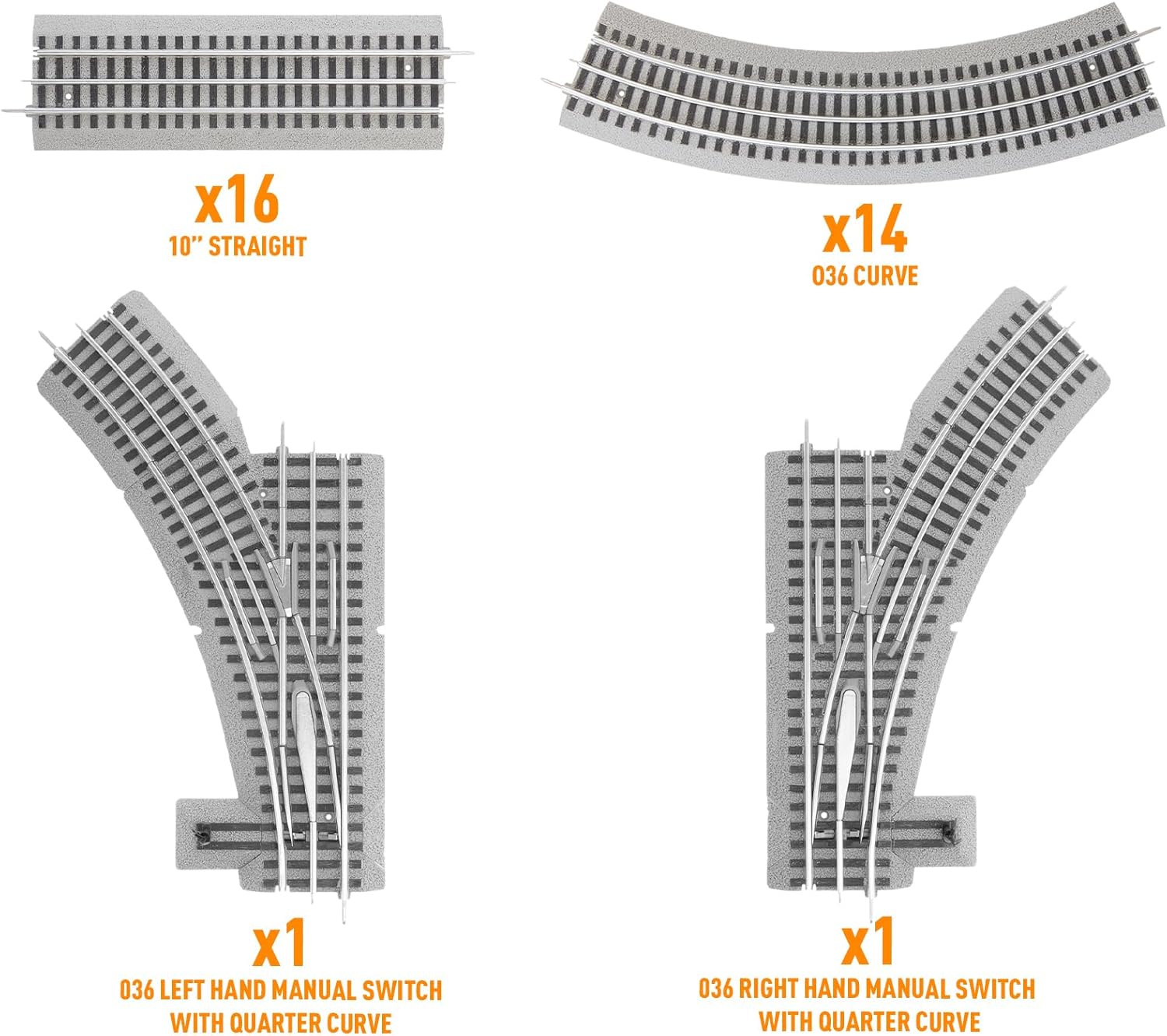 1 FasTrack O36 Interruttore manuale sinistro 1 FasTrack O36 Interruttore manuale destro 14 FasTrack O36 Curva completa 4 FasTrack 30" Rettilineo extra lungo 4FasTrack 10" Rettilineo