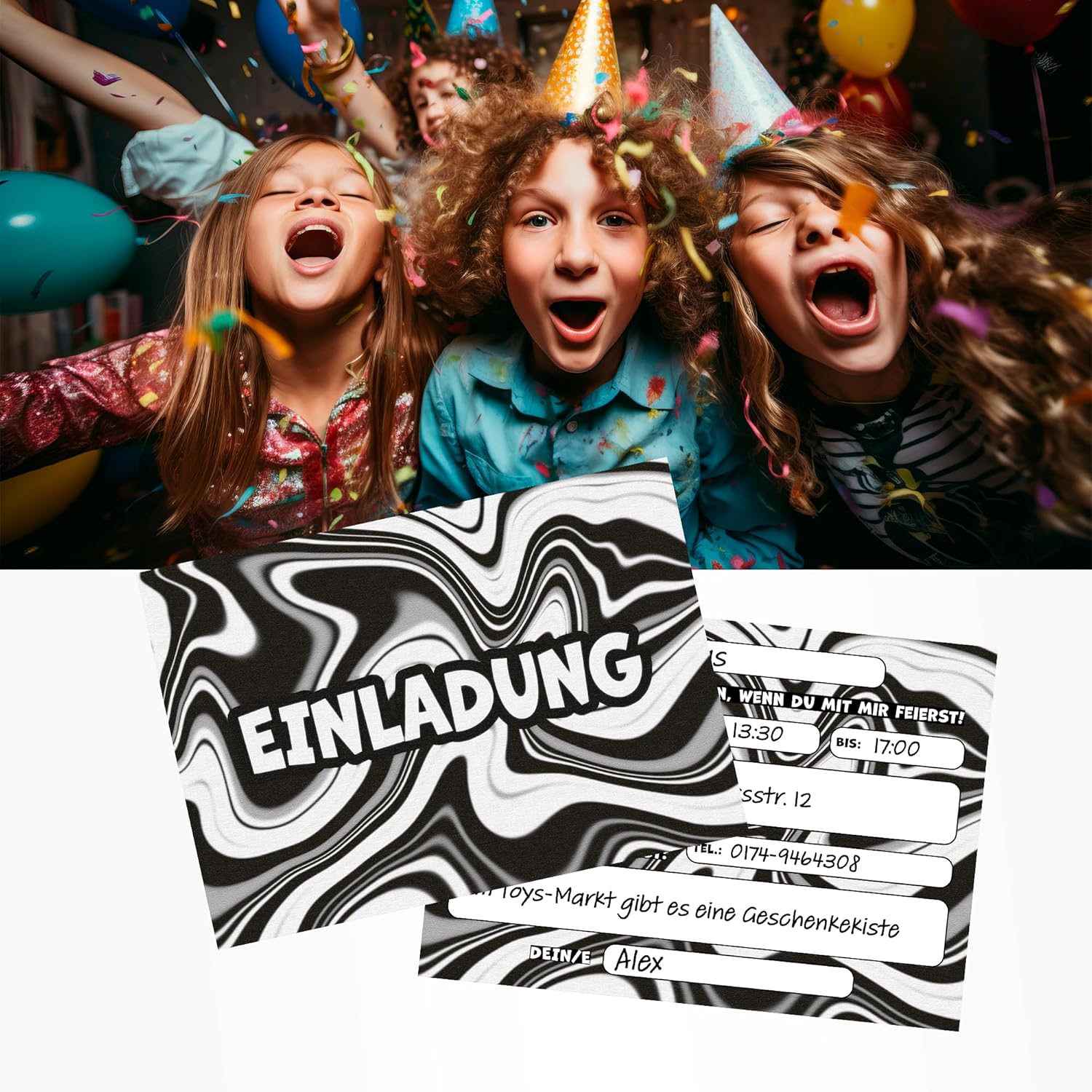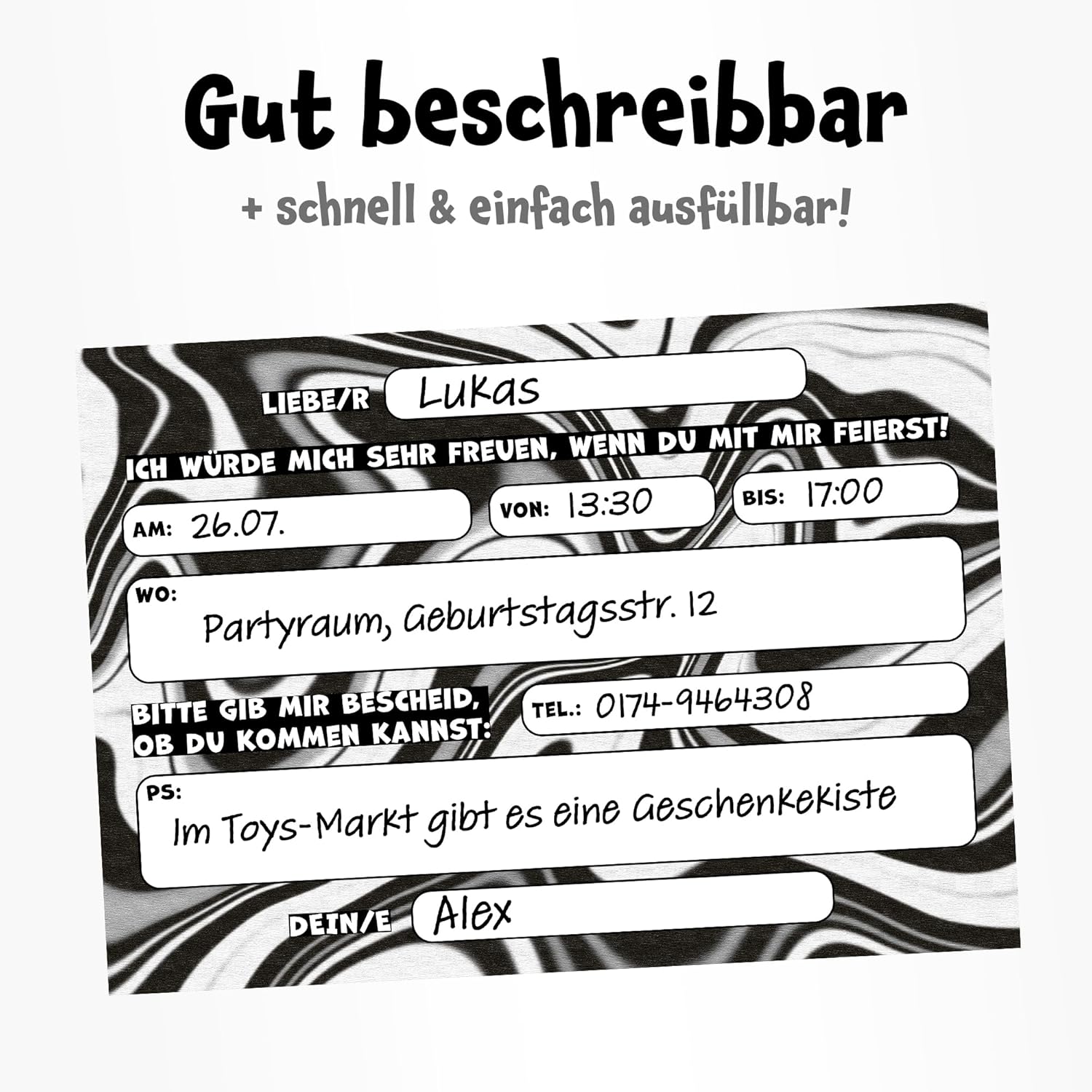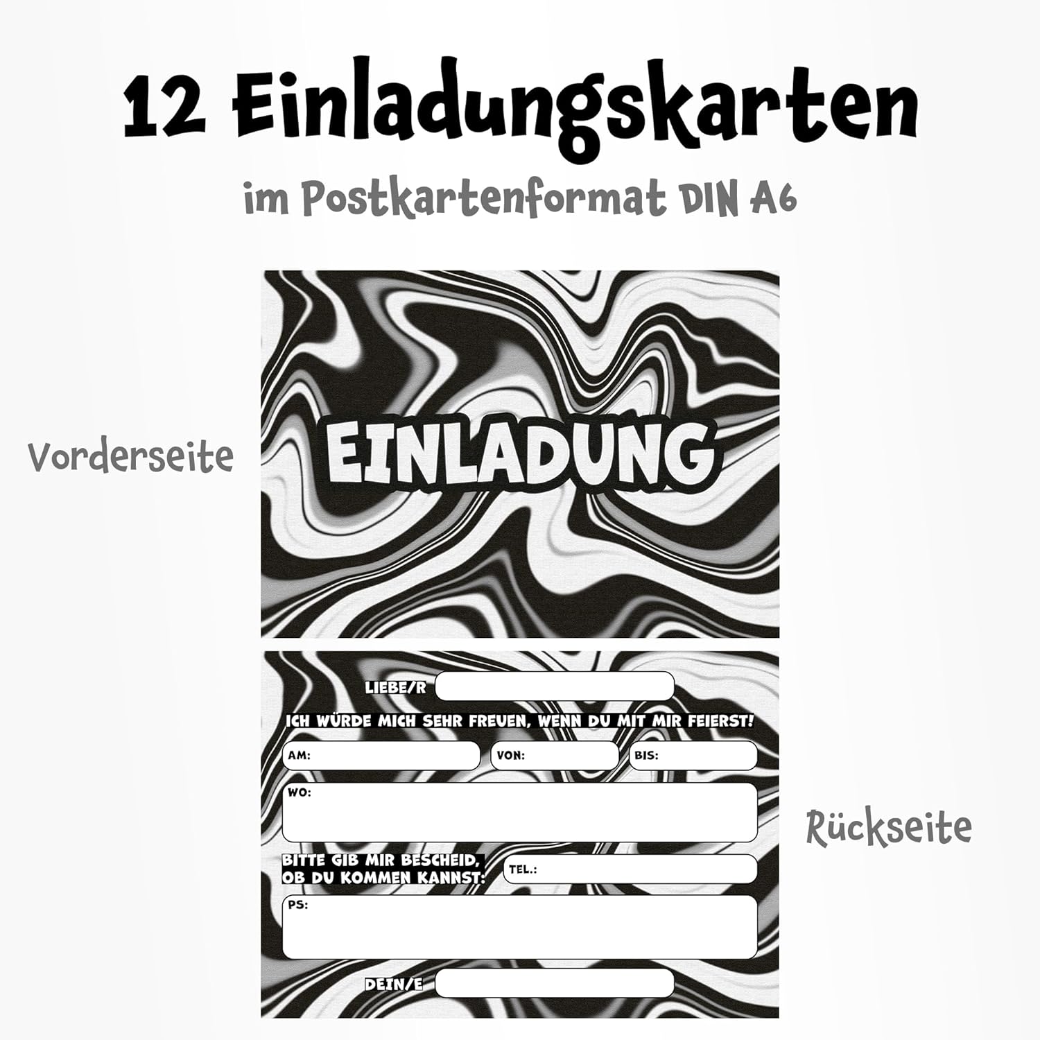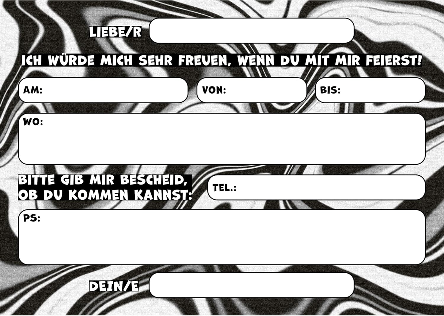 Design sobrio: con questi fantastici biglietti d'invito la festa avrà successo! Si adatta perfettamente a battute fresche e garantisce già in anticipo per volti entusiasti! Riempito rapidamente: compilato in un batter d'occhio attraverso i campi predefiniti. In questo modo è possibile invitare anche le squadre più grandi in modo rapido e semplice Biglietti di alta qualità: stampati su carta rigida da 350 g/m² con retro super scrivibile. Stampato in Germania con compensazione di CO₂ Formato perfetto: gli inviti di compleanno in pratico formato cartolina (DIN A6) si adattano a qualsiasi borsa e sono distribuiti rapidamente a tutti gli ospiti Contenuto della confezione: 12 biglietti d'invito per compleanno Liquid Style, di alta qualità, stampati su entrambi i lati su carta rigida da 350 g/m² in formato 14,8 x 10,5 cm (DIN A6).