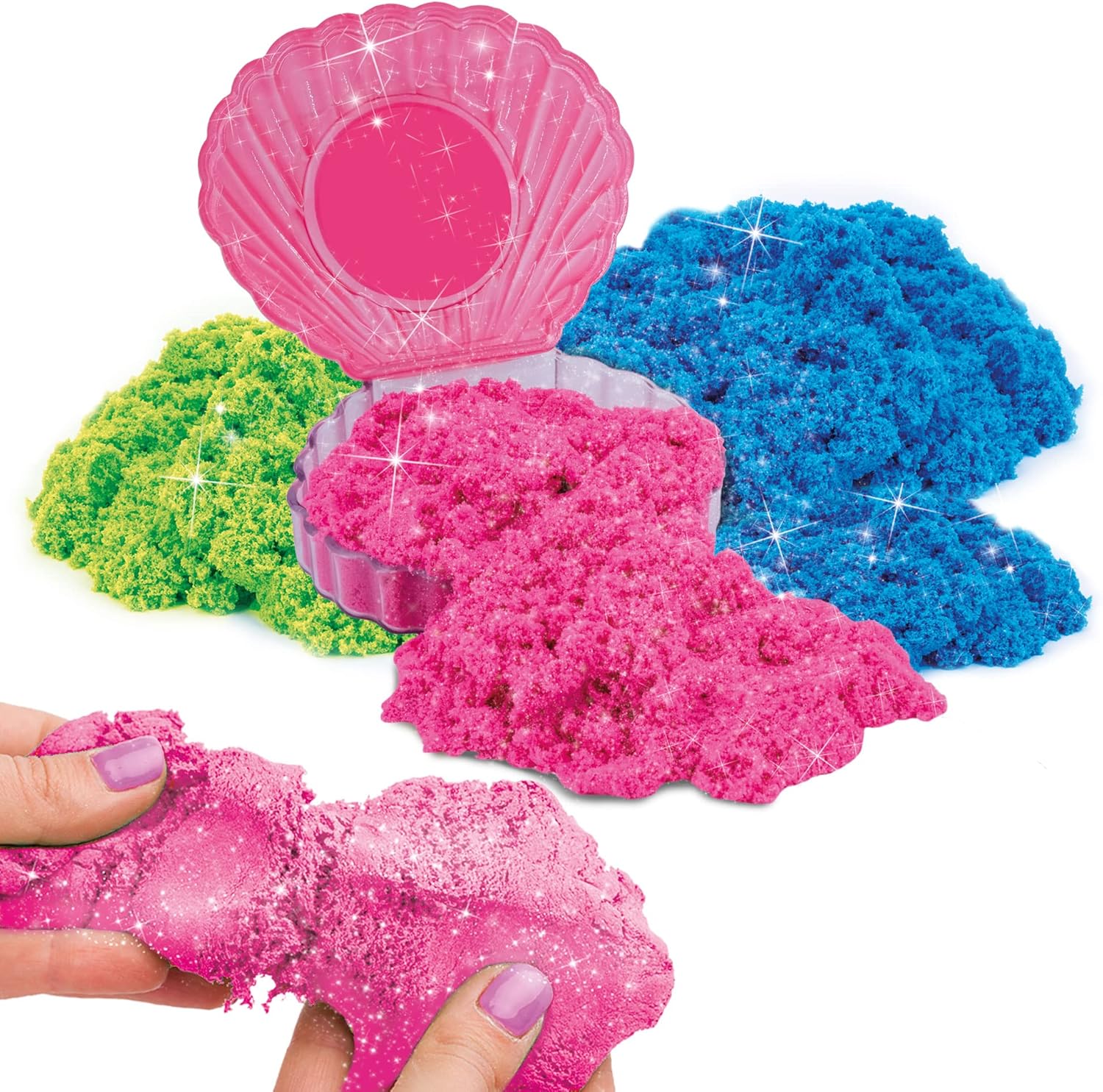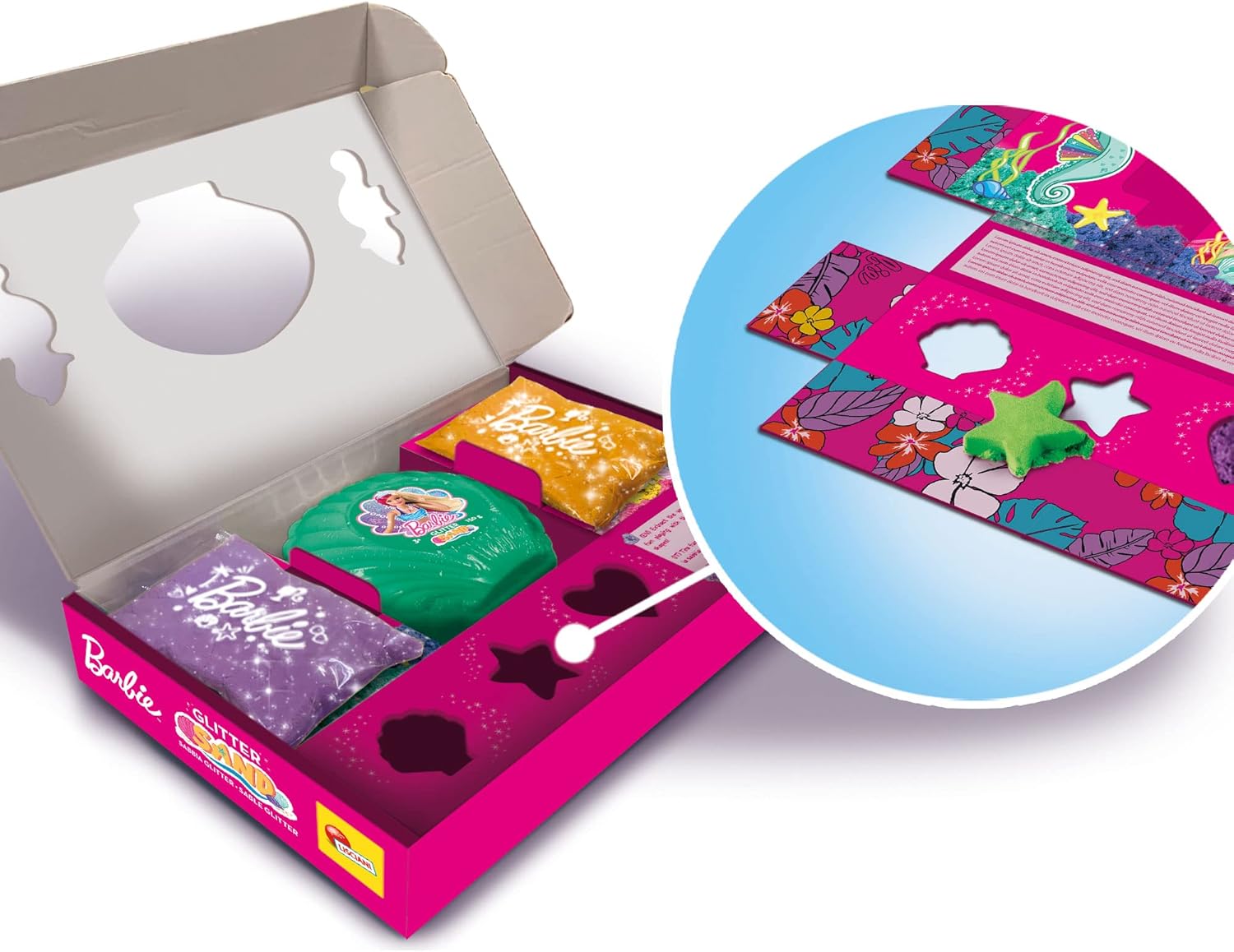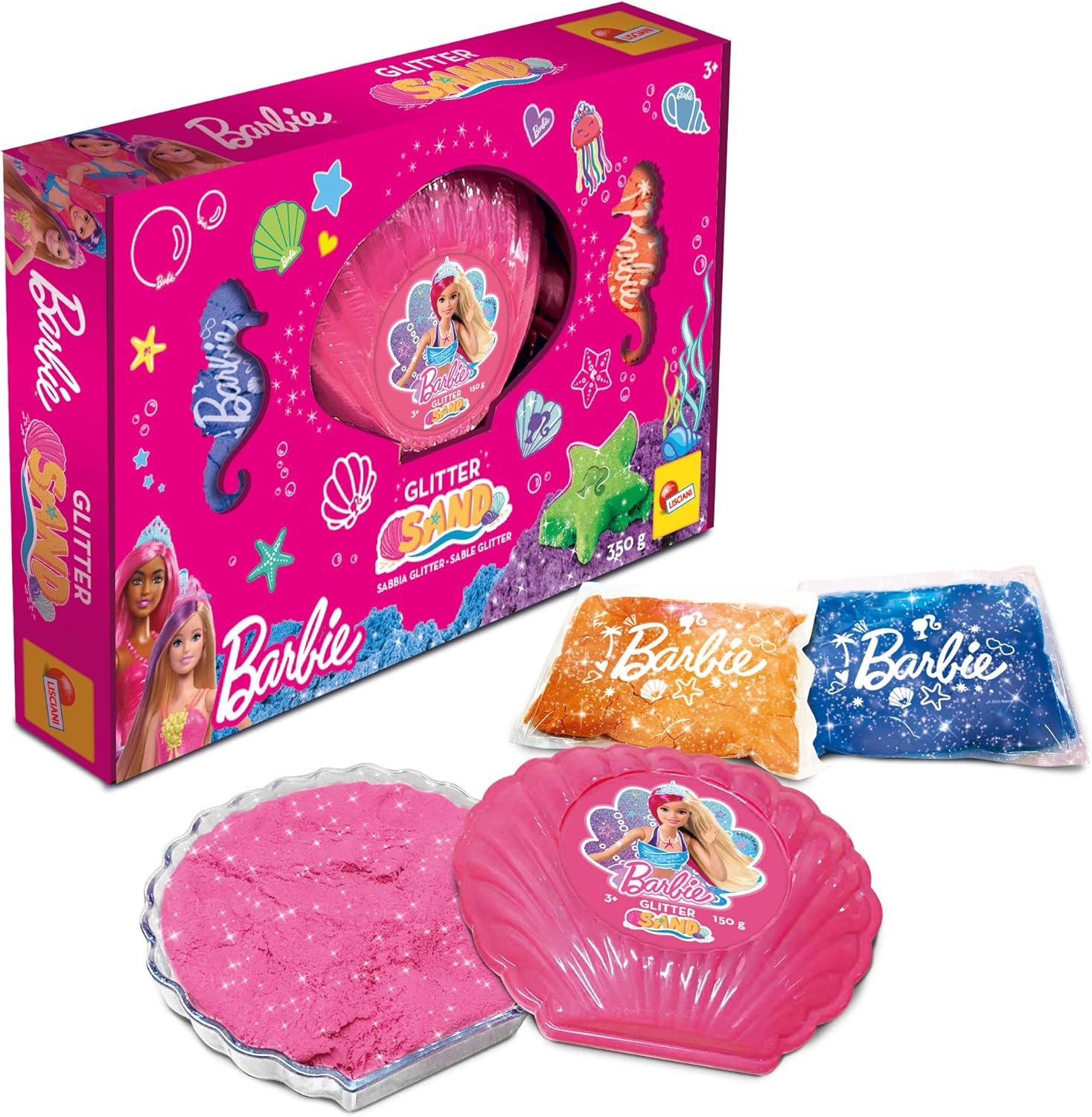 La colorata conchiglia di Barbie nella versione multipack Con sabbia glitter - 3 colori assortiti - Con un colorato packaging - 300 g di sabbia - Da 3 anni in su Contenuto: conchiglia di Barbie con 150 g e in aggiunta altri 150 g in due pratiche bustine Percezione e psicomotricità - Coordinazione occhio mano - Manualità fine - Creatività - Curiosità e capacità di osservazione