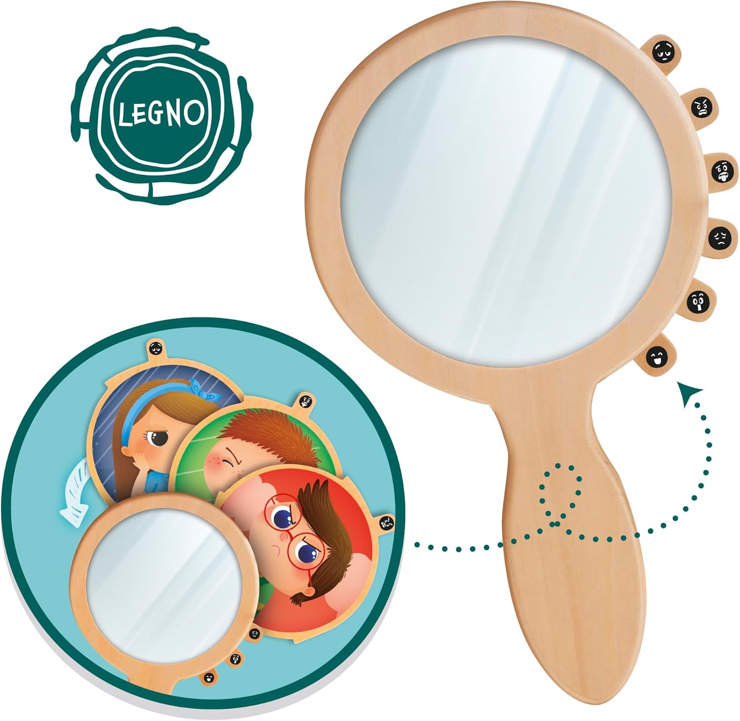 Impara a riconoscere le tue emozioni Esclusive filastrocche delle emozioni - Dischi girevoli - Specchio in legno Specchio in legno con dischi girevoli - Guida didattica Consapevolezza del sé - Autonomia - Linguaggio