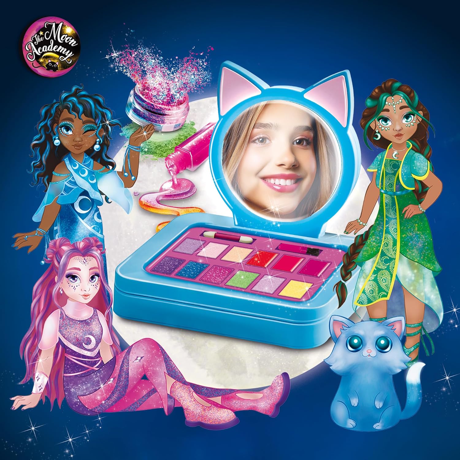 Crea i tuoi look con la specchiera di The Moon Academy! Cosmetici sicuri - Crea magici look - 3 lipgloss e 3 blush - Ombretti colorati e glitter specchio- base con trucchi- 3 ombretti- 3 ombretti glitter- 3 blush- lipgloss- 2 applicatori - manuale illustrato Manualità fine e coordinazione occhio-mano - Creativitià - Concentrazione - Forme e colori