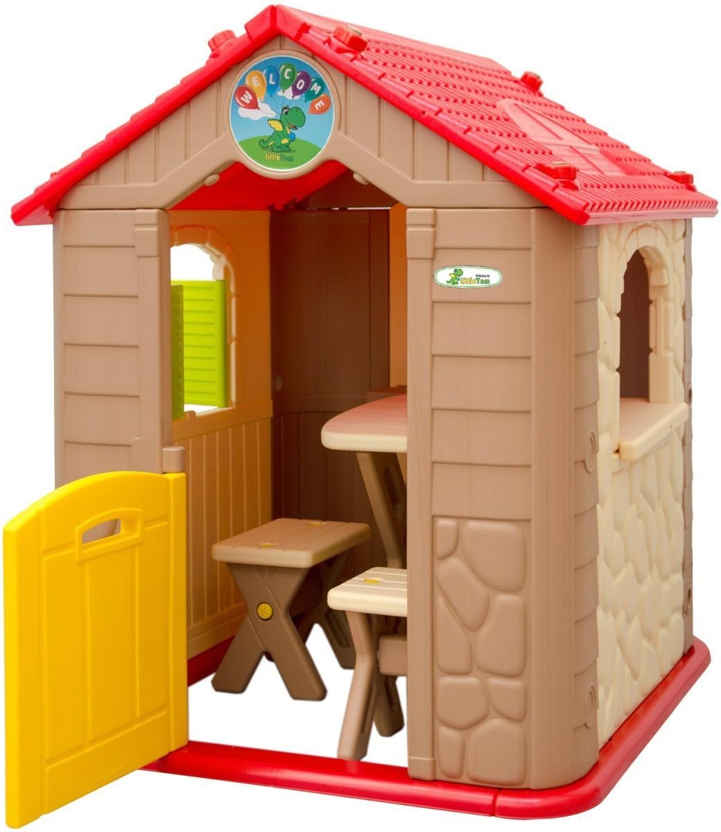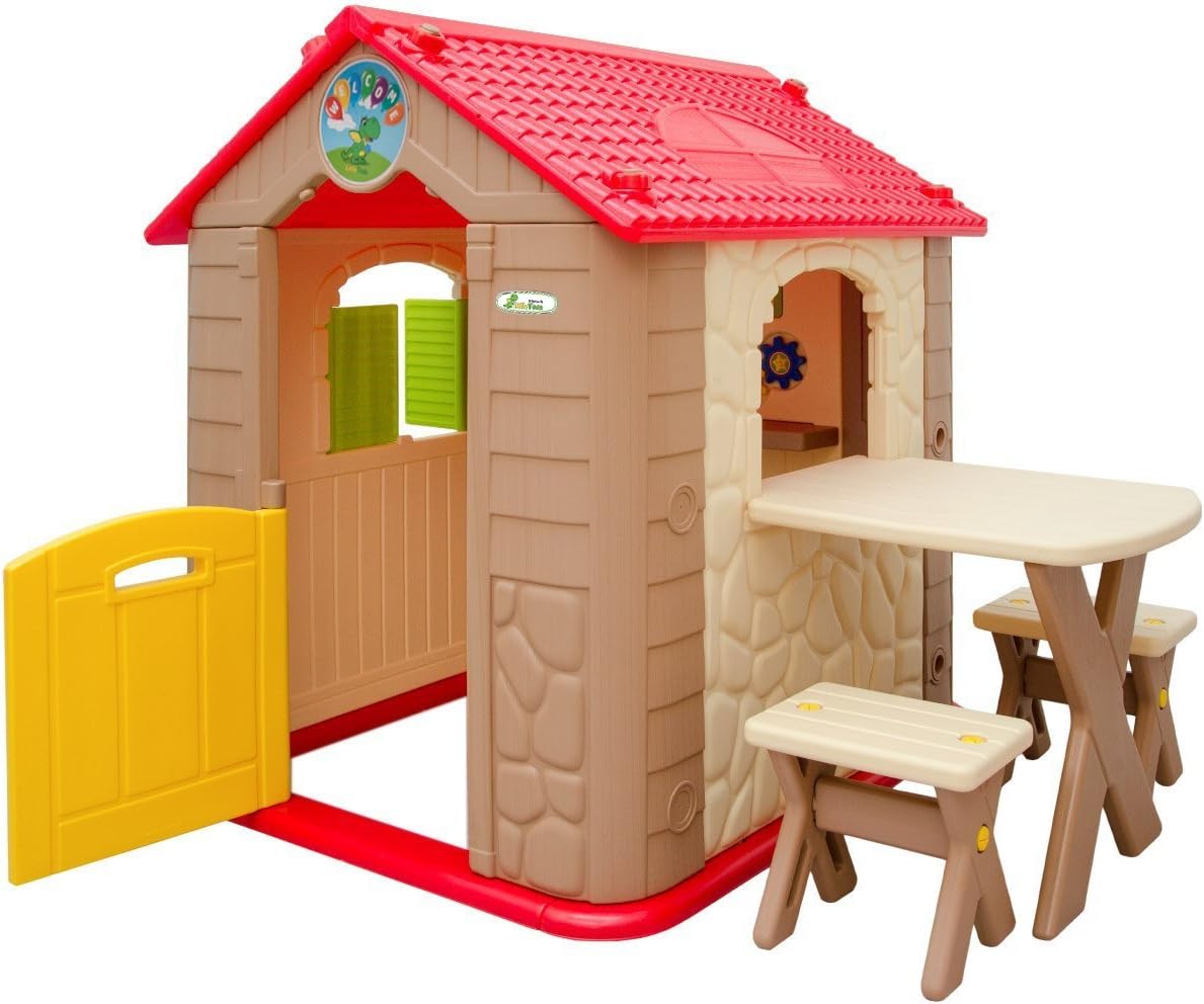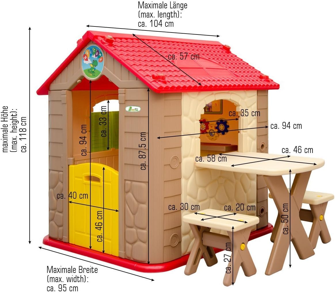 INCLUSI ACCESSORI: questa graziosa casa con il suo tavolo da picnic e le due panchine si trasformerà nel luogo preferito in cui i vostri figli potranno giocare e liberare la loro immaginazione. I colori neutri sono adatti ai bambini e alle bambine PER INTERNI & ESTERNI: la casetta è realizzata in plastica testata di alta qualità, resistente alle intemperie, può essere lasciata fuori per giorni. Facile da pulire con un panno umido ALTA QUALITÀ: stabile, i bordi e gli angoli arrotondati sono sicuri anche per i più piccoli. Dimensione totale: ca. 104x95x118cm; Superficie interna: ca. 88x76cm; Tavolo: ca. 58x46x50cm; Sgabello: ca. 30x20x27cm; Peso sostenuto: max. 30kg INTERATTIVA: la casa offre spazio per 2-3 bambini. Il tavolino può essere installato sia all'interno che all'esterno. Le finestre e la porta possono essere aperte / chiuse. Gli accessori integrati alla parete garantiscono il massimo divertimento VELOCE DA ASSEMBLARE: non sono necessari utensili particolari, le varie parti che la compongono si incastrano l'una dentro l'altra e devono essere fissate con i grandi bulloni inclusi nella consegna