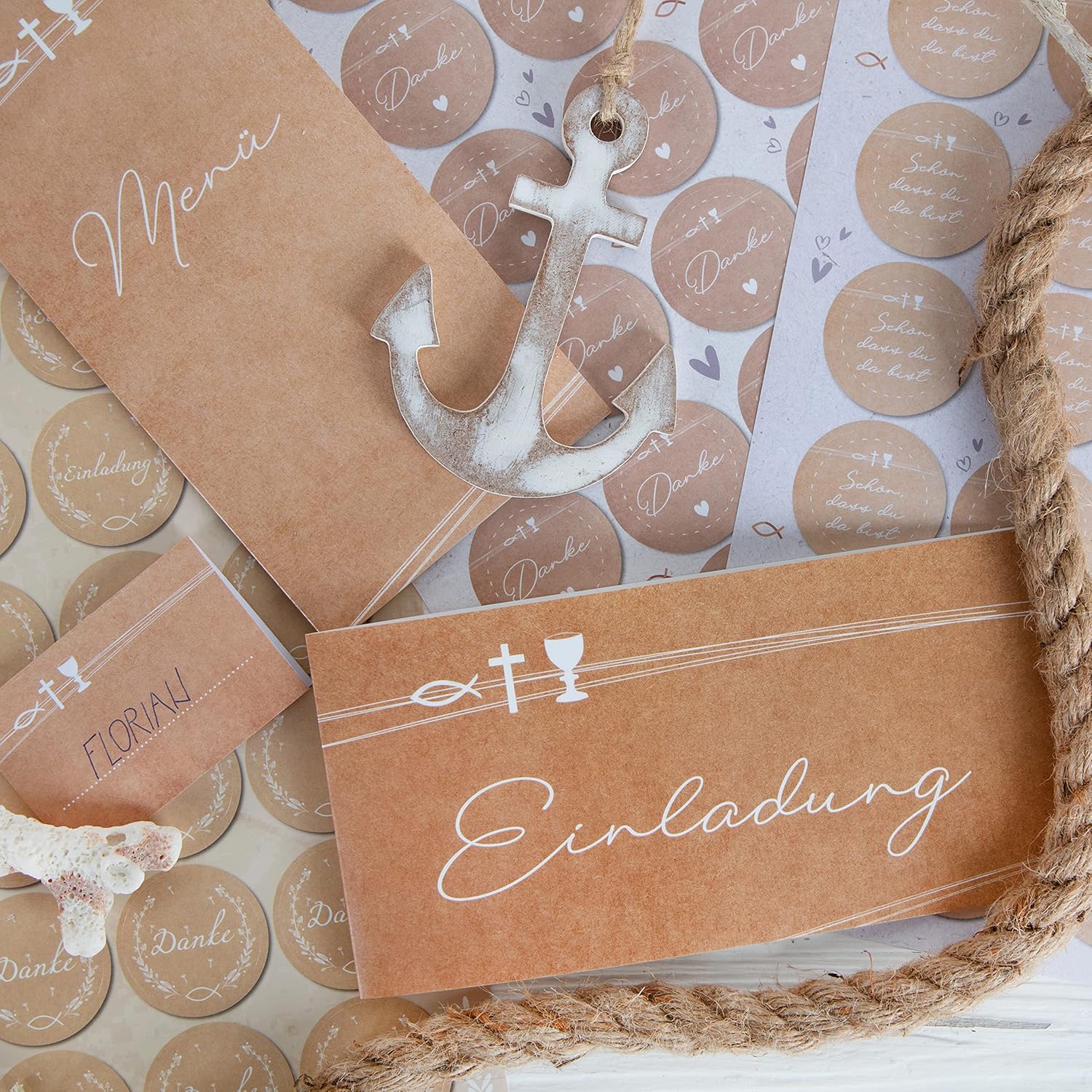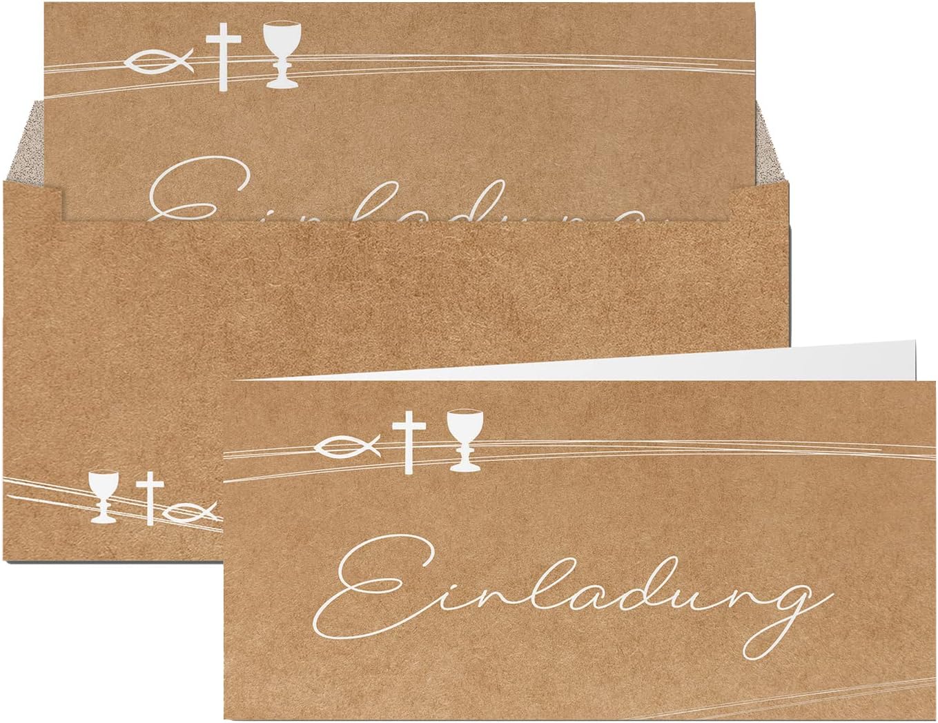 Biglietti d'invito realizzati con amore in carta kraft decorati con i simboli cristiani di pesce (itti), croce e calice. I biglietti pieghevoli senza contenuto sono grandi 10,5 x 21 cm (DIN lungo). Con ogni biglietto di invito è inclusa una busta abbinata marrone nello stesso design. Prodotto in Germania. I bellissimi biglietti con motivi chiese sono perfettamente adatti come biglietti di invito festivi per battesimo e comunione, per cresima, cresima o compleanno per bambini e bambine. I biglietti sono particolarmente belli anche per una cerimonia di nozze in chiesa. Nel nostro negozio Amazon troverete anche segnaposto, menù, libro degli ospiti e adesivi nello stesso design. Date un'occhiata – basta cliccare sul nostro nome sopra. Grazie! ❤️ Con amore e ❤️ dalla piccola casa editrice Logbuch-Verlag in Baviera.
