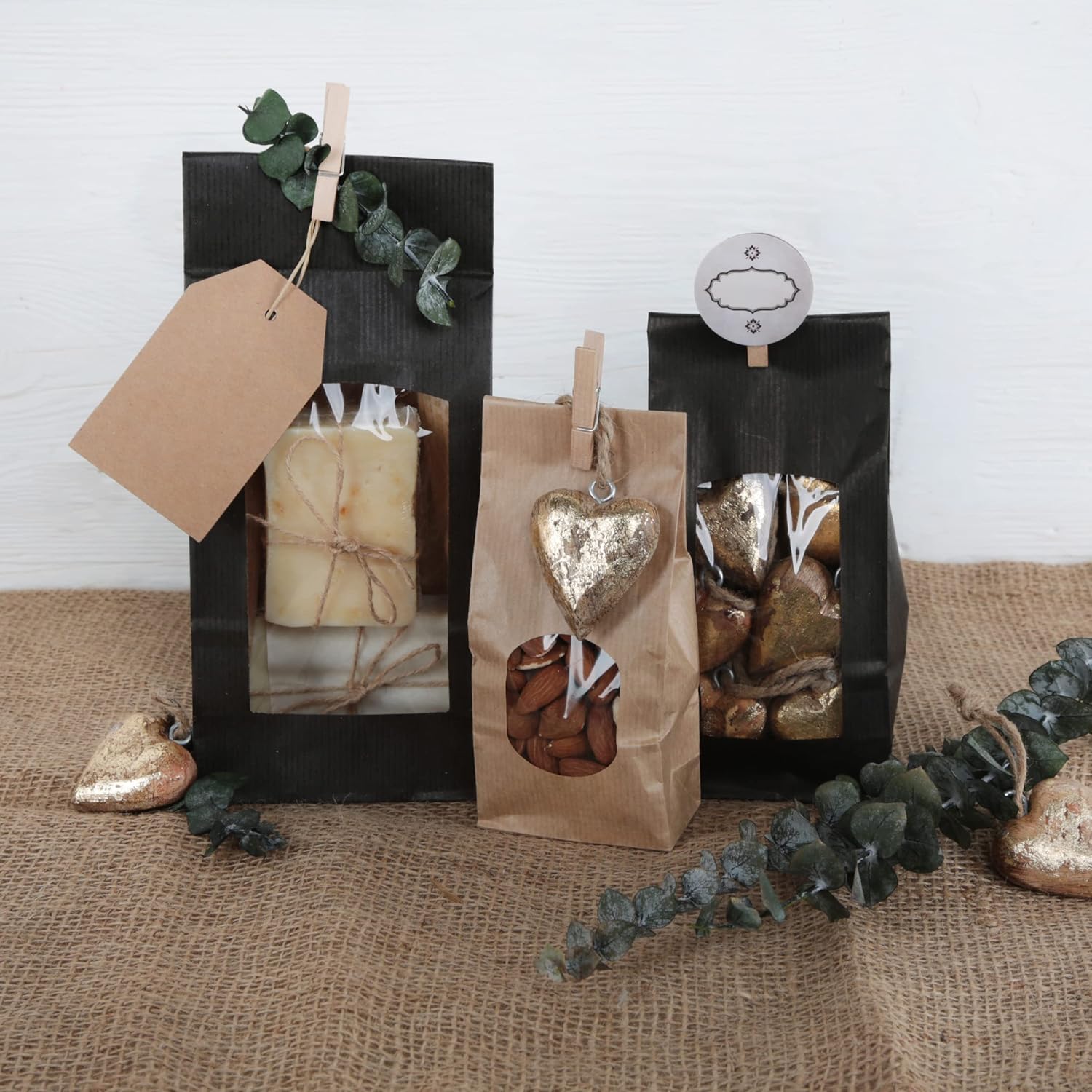 Borse con fondo piatto di alta qualità con finestra trasparente e inserto in pellicola in un set con clip dorate e adesivi per chiudere le borse. Colore: marrone. Testo: “Fatto in casa con ❤”. I sacchetti di carta con inserti in pellicola sono alti 26,5 cm, larghi 8,5 cm e hanno una profondità inferiore di 5 cm. A seconda del contenuto ciò corrisponde ad una capacità di ca. 200 - 500 g. Gli adesivi misurano 5 x 14,8 cm. IMBALLAGGIO PER ALIMENTAZIONE - ideale per caffè, tè, biscotti, biscotti, spezie, alimenti macinati finemente, dolci, frutta secca, biscotti per cani, dolcetti per animali, cioccolatini, specialità da asporto e molti altri piccoli prodotti. Packaging unico per i tuoi regali fatti in casa. Puoi anche acquistare le borse e gli adesivi separatamente da noi. Puoi trovare molti altri set di confezioni e idee regalo nel nostro negozio Amazon. Dai un'occhiata: basta fare clic sul nostro nome sopra. Grazie! ❤️ Pieno di amore e cuore e spedito dalla piccola casa editrice bavarese Logbuch. ❤️