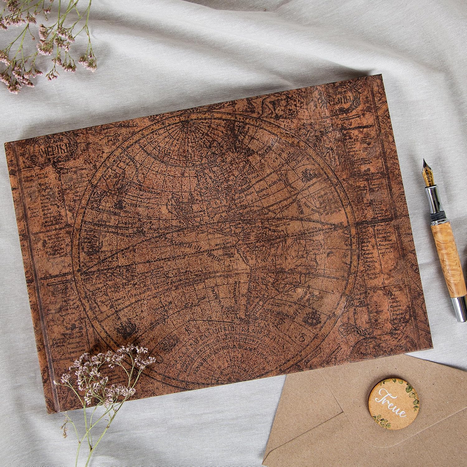 Libro extra grande in look nostalgico marrone scuro con mappa del mondo o mappamondo. Costruzione in stile vintage da personalizzare e scrivere - Formato A4 orizzontale - Rilegatura a spirale - Copertina rigida con 148 pagine bianche più resistenti. Peso: 120 g. Carta riciclata/carta naturale. Stampa di alta qualità: si adatta a quasi tutte le penne. Il taccuino vuoto viene utilizzato come diario, libro degli ospiti, taccuino di viaggio, quaderno di schizzi, libro da colorare, libro da disegno, quaderno di schizzi, quaderno di storie, storia d'amore, libro di pensieri, libro di idee, libro di budget, organizzatore, per manoscritti e memorie. L'aspetto antico è richiesto anche dai goti e dagli appassionati del Medioevo. Un bel regalo per bambini, adulti, donne, uomini, amici, colleghi, studenti, conoscenti e persone a cui piace scrivere o disegnare. Nel nostro negozio Amazon troverete molti altri libri bianchi, adesivi e confezioni regalo. Basta cliccare sul nostro nome in alto. GRAZIE. ❤ Realizzato con amore da Logbuch-Verlag, una piccola azienda situata in Baviera.