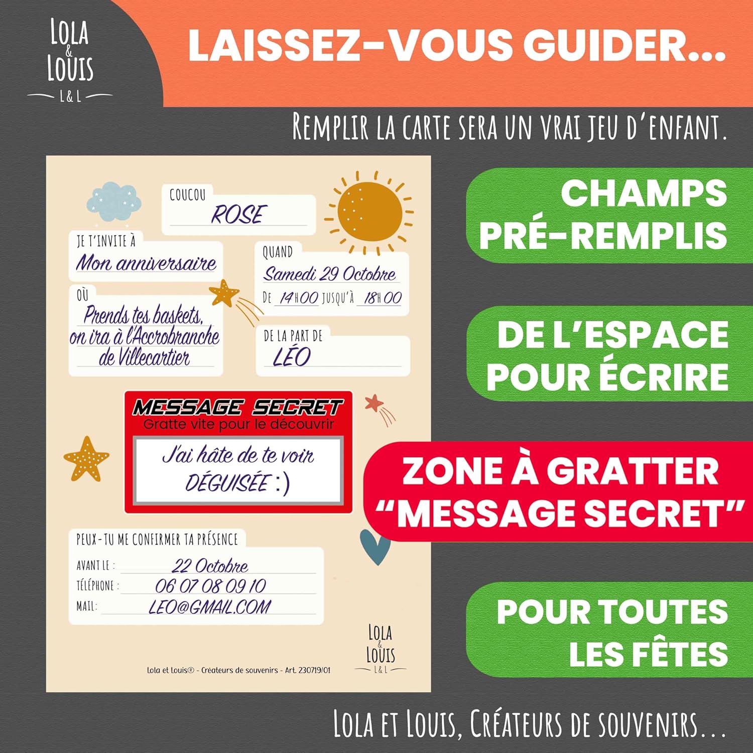 ✅ KIT ULTRA COMPLETO tutto compreso 10 inviti - 10 buste - 10 adesivi per personalizzare o sigillare la busta - 10 adesivi da grattare - 1 Documento per il tracciamento degli invitati - 1 Aiuto per scegliere le tue attività ✅ TOTALE LIBERTÀ Puoi inserire nel gratta e vinci quello che vuoi: una data, un luogo, un evento importante del Festival, dai libero sfogo alla tua fantasia... sorprendi i tuoi ospiti! ✅ LA FUTURA FESTA DIVENTA UN'AVVENTURA CREATIVA Il bambino diventa l'ideatore della propria festa partecipando attivamente alla sua preparazione! Con il nostro concept potrà divertirsi completando le informazioni e aggiungendo una dose di mistero ai suoi inviti. I suoi amici saranno felicissimi di scoprire i "Messaggi segreti" nascosti sotto ogni adesivo! ✅ RISVEGLIARE CURIOSITÀ E INTERESSE Questo kit susciterà senza dubbio curiosità e susciterà interesse. Questo pacchetto si distingue per un design innovativo che porterà un tocco di originalità... Dì addio agli inviti tradizionali! I piccoli ospiti saranno desiderosi di ritrovarsi per condividere un momento unico, garantendo così la buona riuscita della festa. ✅ Lola & Louis è una giovane azienda 🇫🇷francese🇫🇷 con sede in Bretagna tra Fougères e Mont-Saint-Michel. Ti offriamo un'ampia scelta di biglietti d'invito. Il nostro partner di stampa situato in Francia è etichettato IMPRIM VERT. Visita il nostro negozio Amazon!